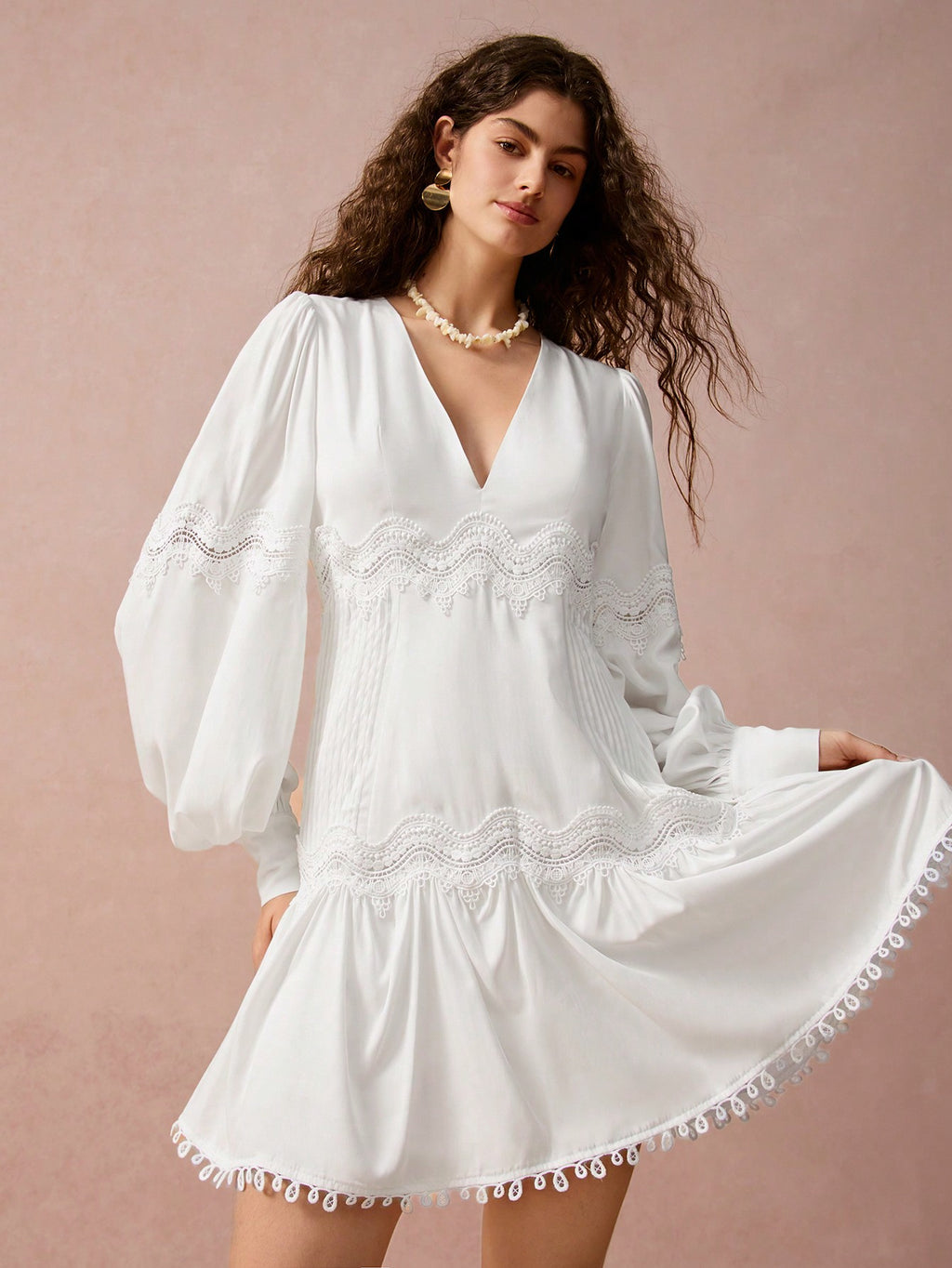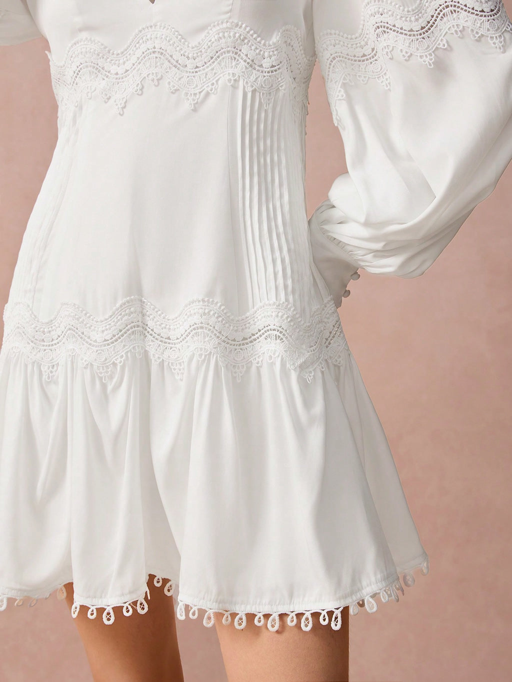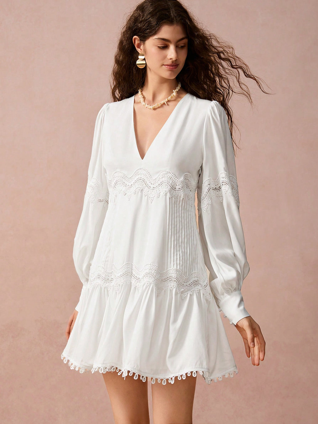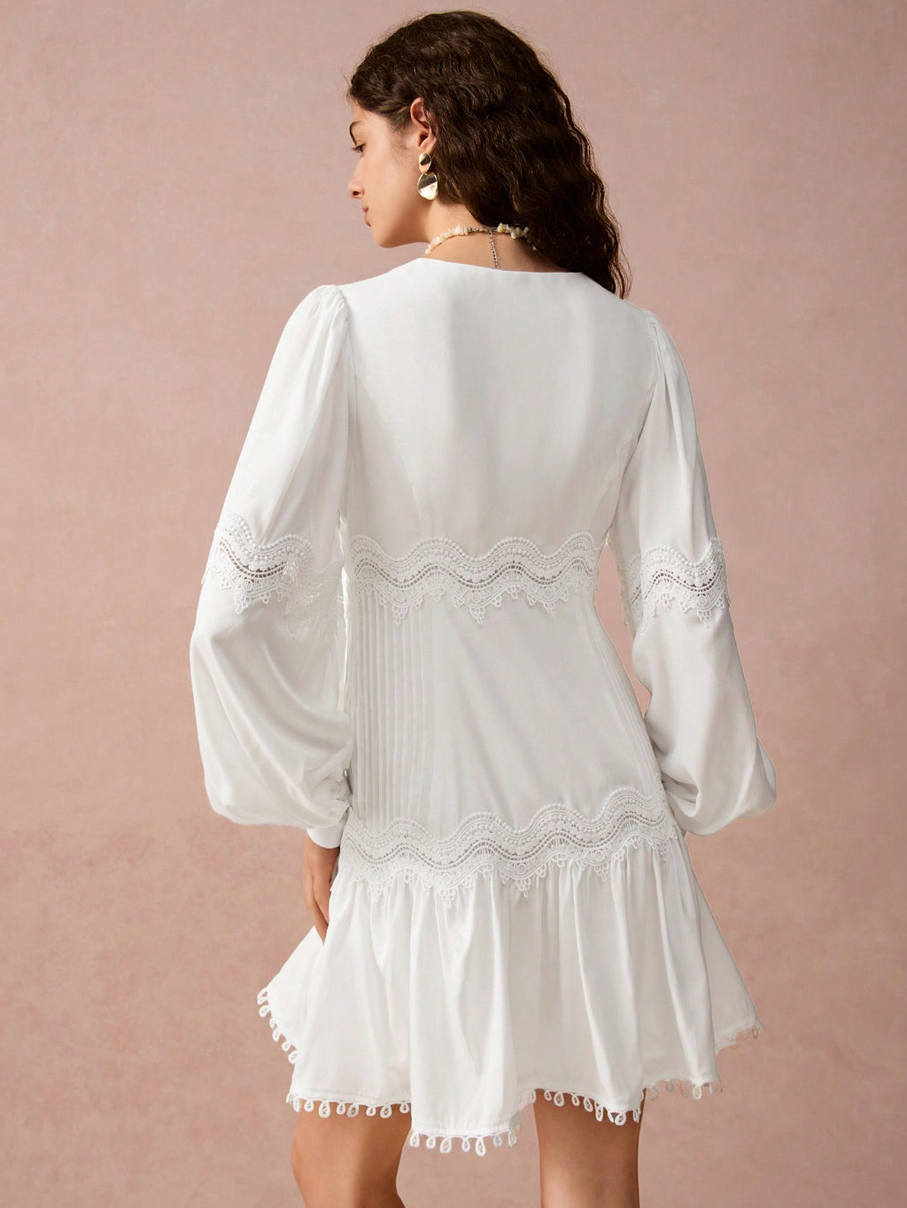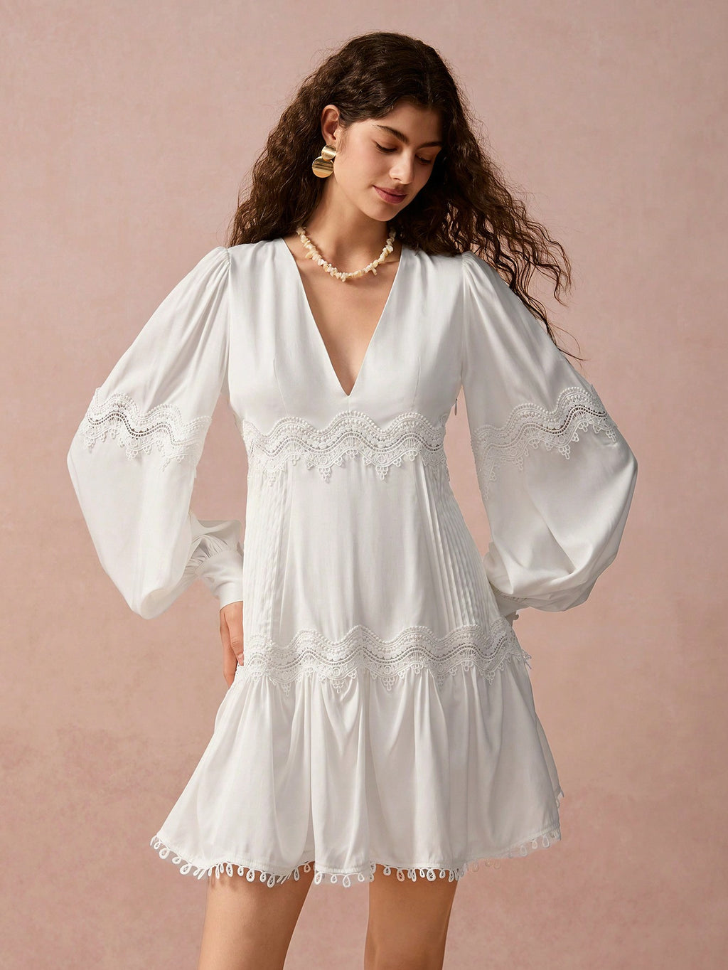 MiuVogue New Winter Products,Women Grace Casual Solid Color V-Neck Lantern Sleeve Lace Splice Mini Dress, Long Sleeve Dress, Winter Women's Clothing,New Years Dress