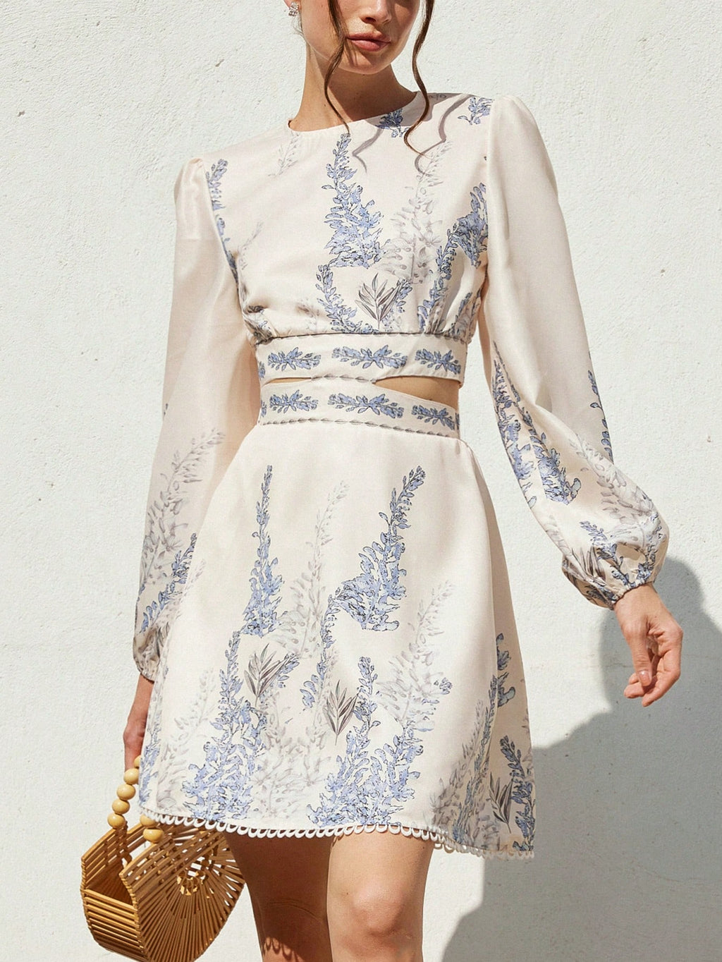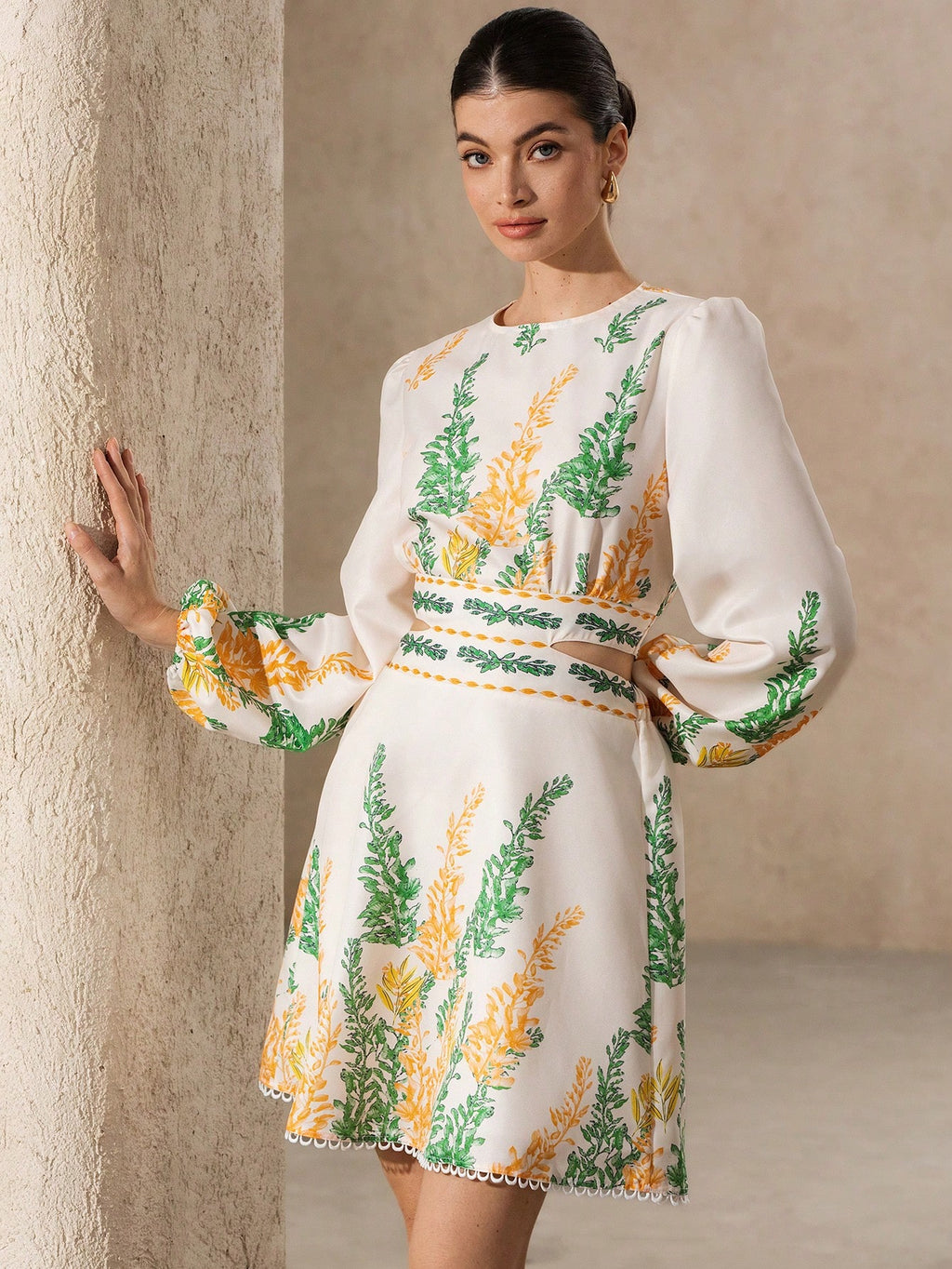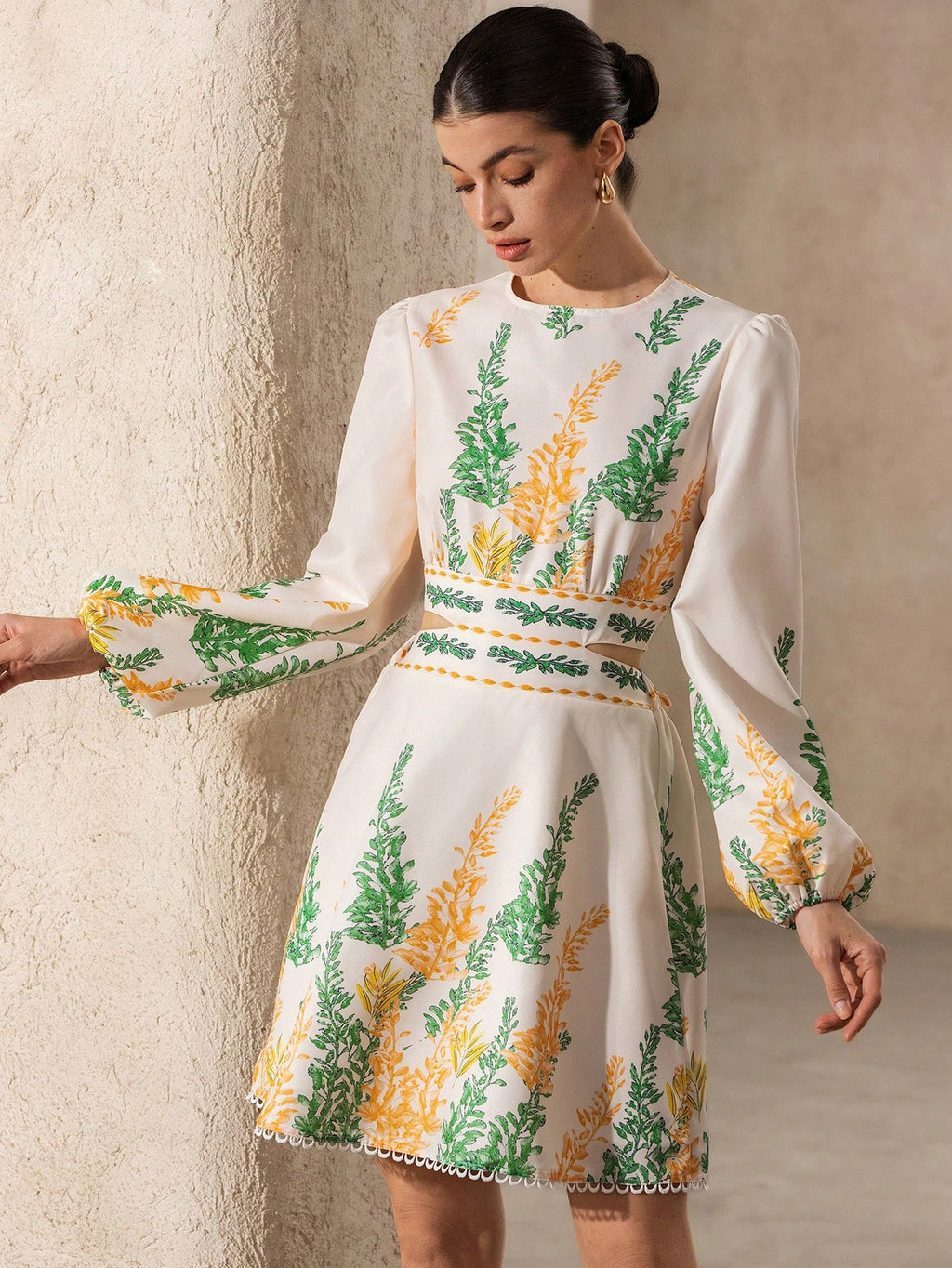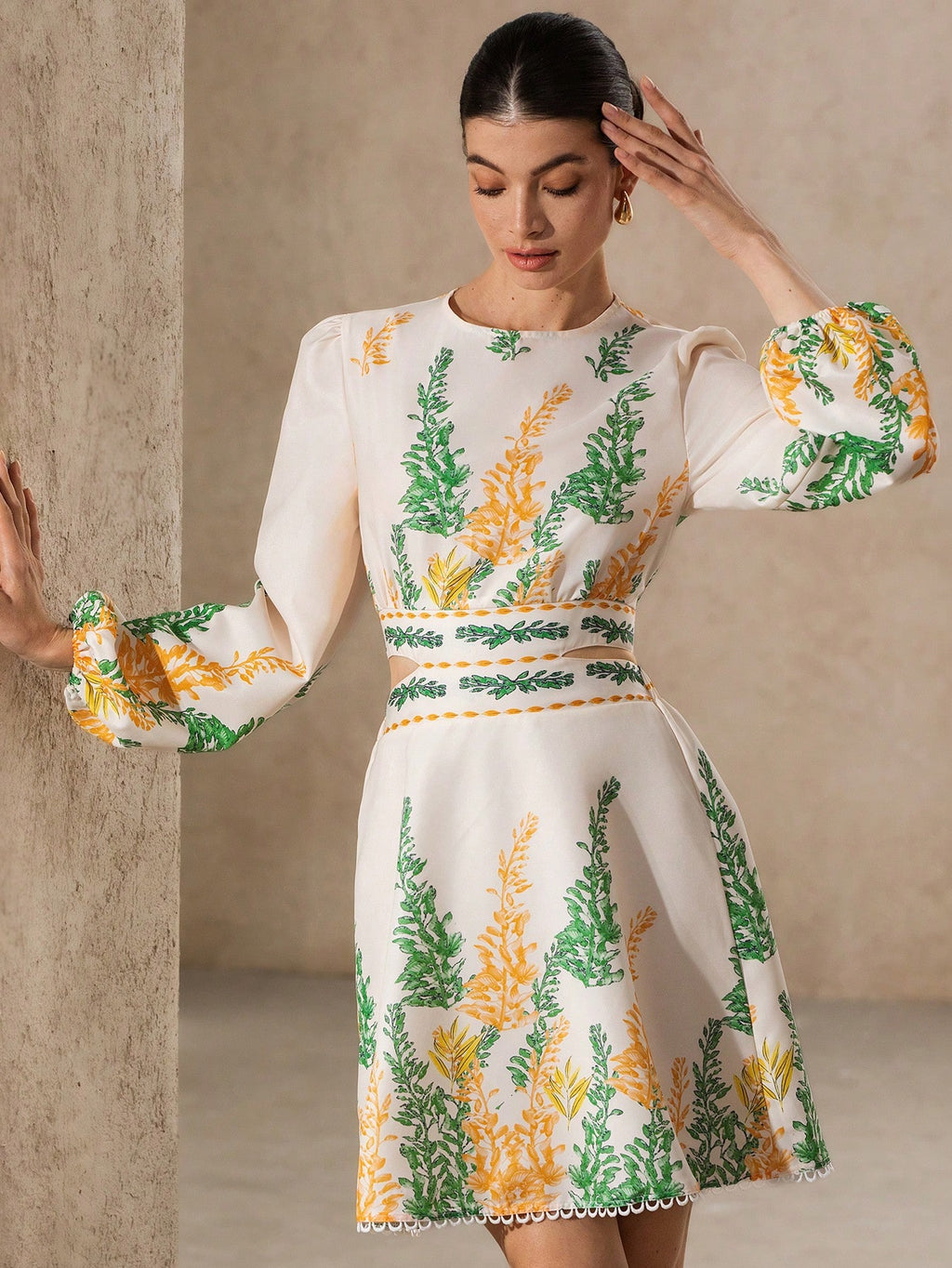MiuVogue Rosie French Retro Palace Style Elegant A-Line Mini Dress, Small Round Neck, Waist Hollow Design, Lantern Sleeves, Retro Placement Print, Waist Cinching Design Boho Vacation FashionableStyle For Spring Fall