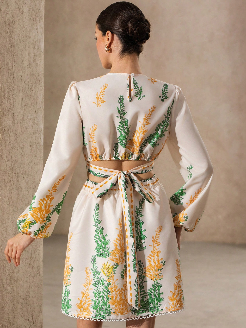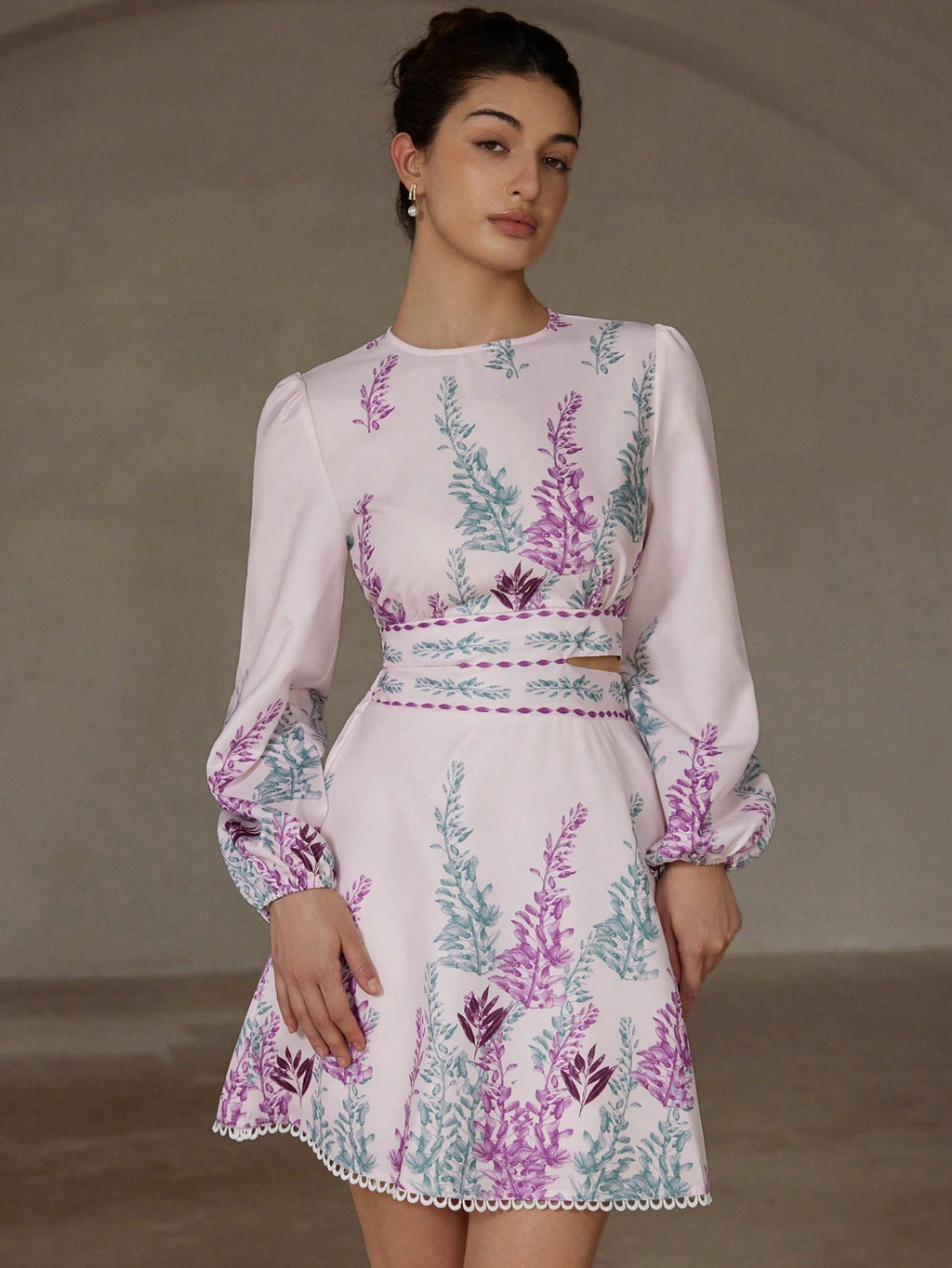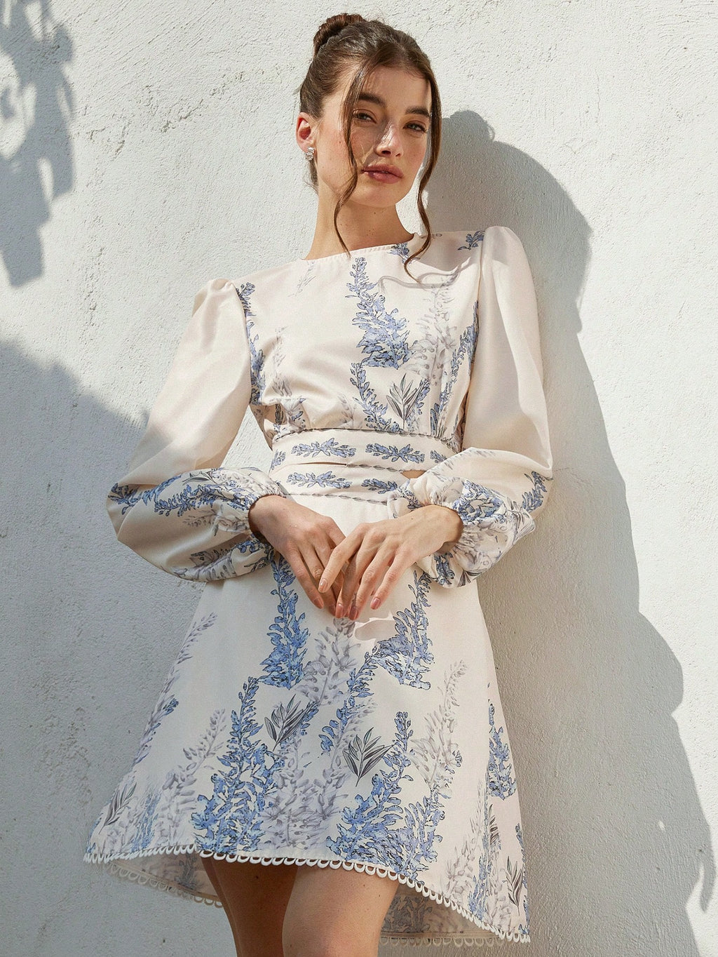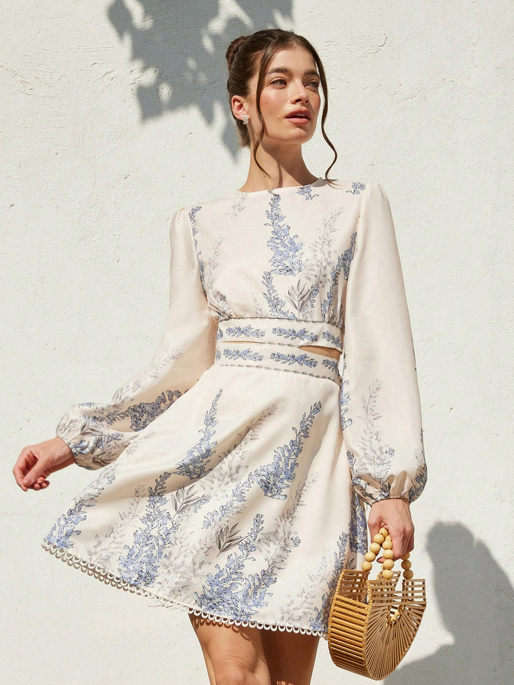 MiuVogue Rosie French Retro Palace Style Elegant A-Line Mini Dress, Small Round Neck, Waist Hollow Design, Lantern Sleeves, Retro Placement Print, Waist Cinching Design Boho Vacation FashionableStyle For Spring Fall