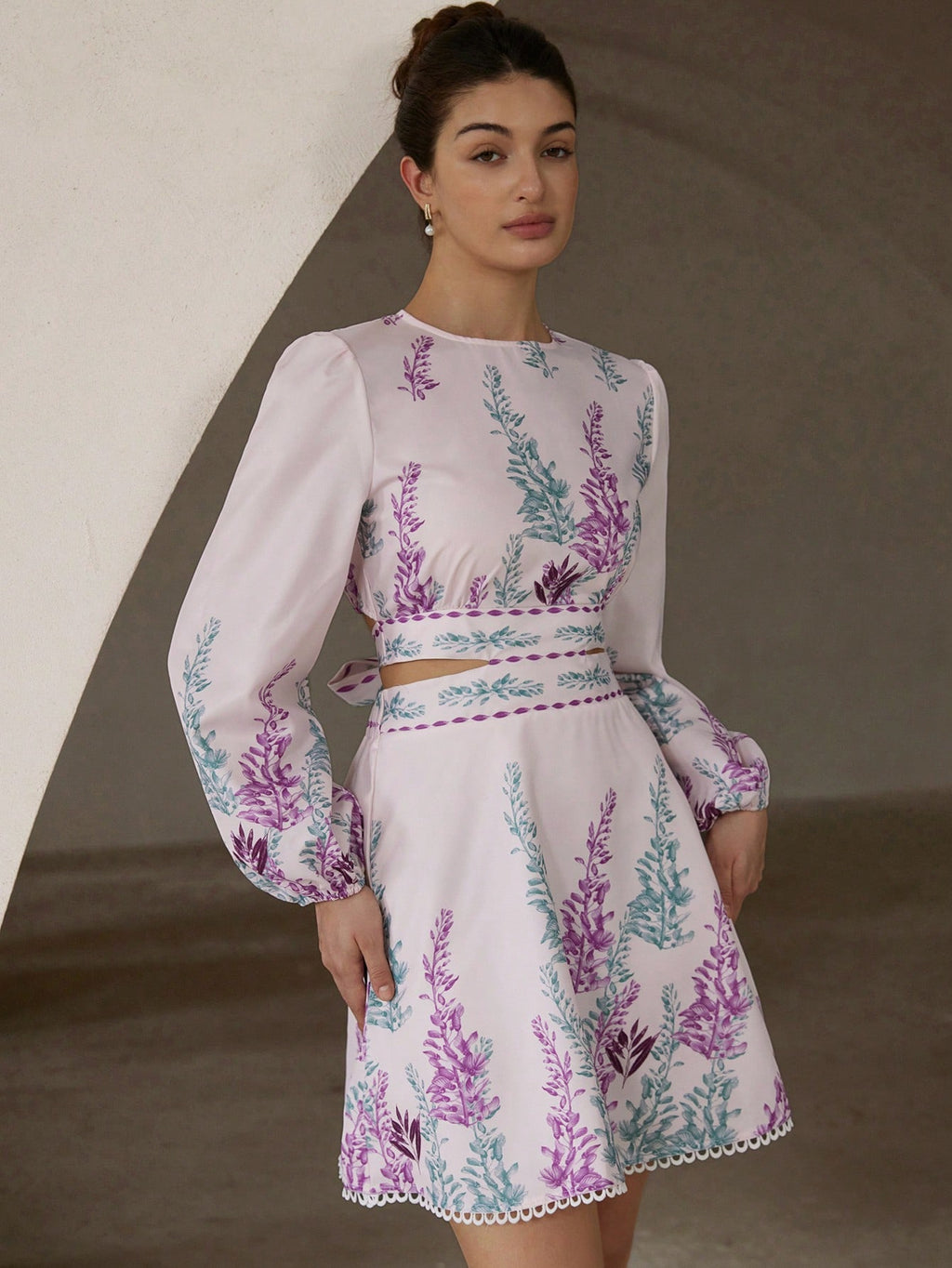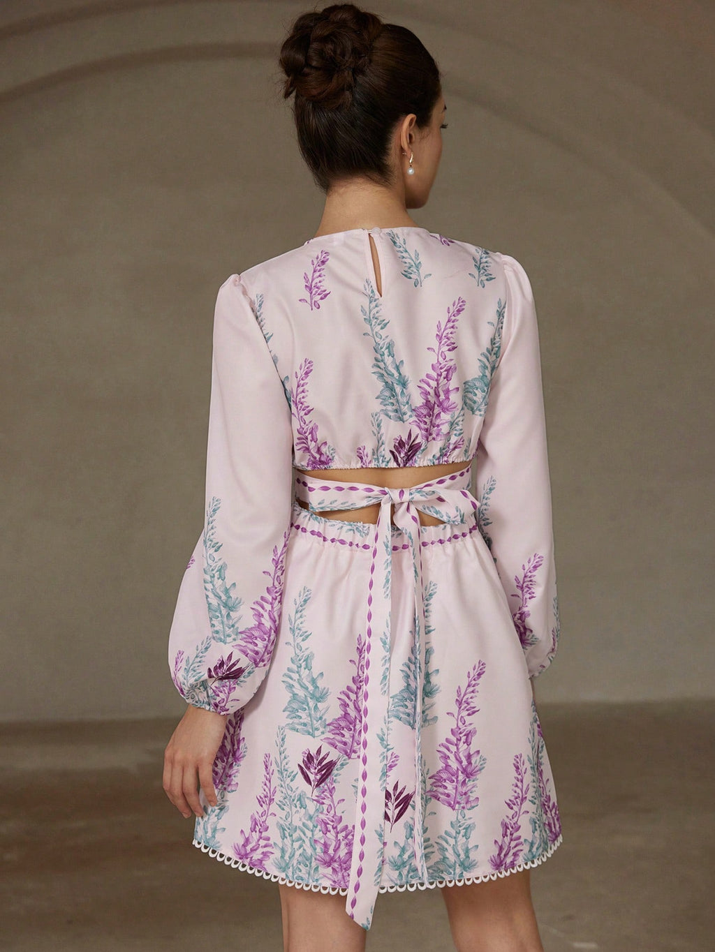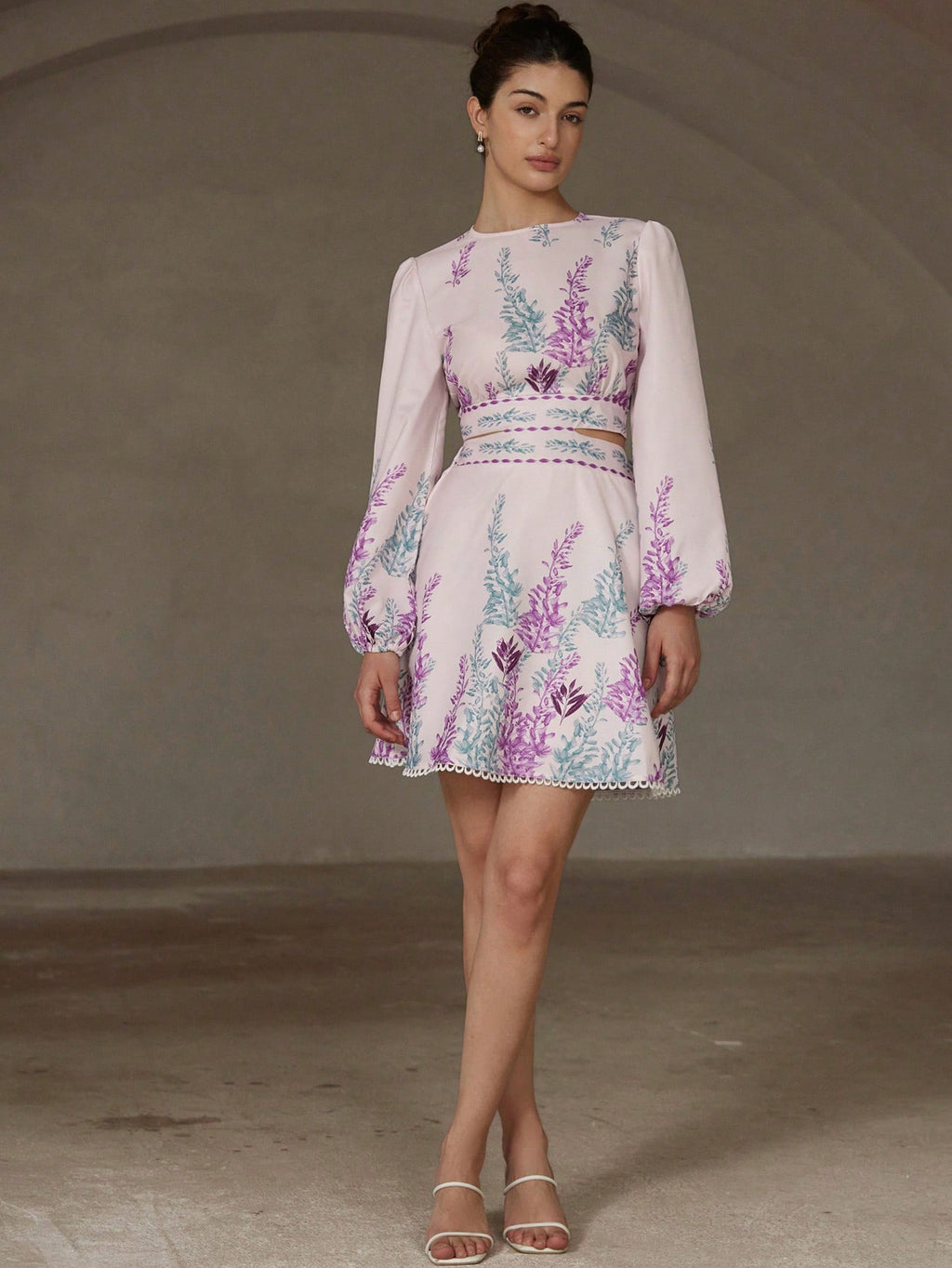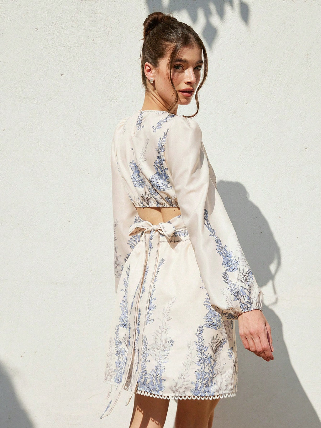 MiuVogue Rosie French Retro Palace Style Elegant A-Line Mini Dress, Small Round Neck, Waist Hollow Design, Lantern Sleeves, Retro Placement Print, Waist Cinching Design Boho Vacation FashionableStyle For Spring Fall