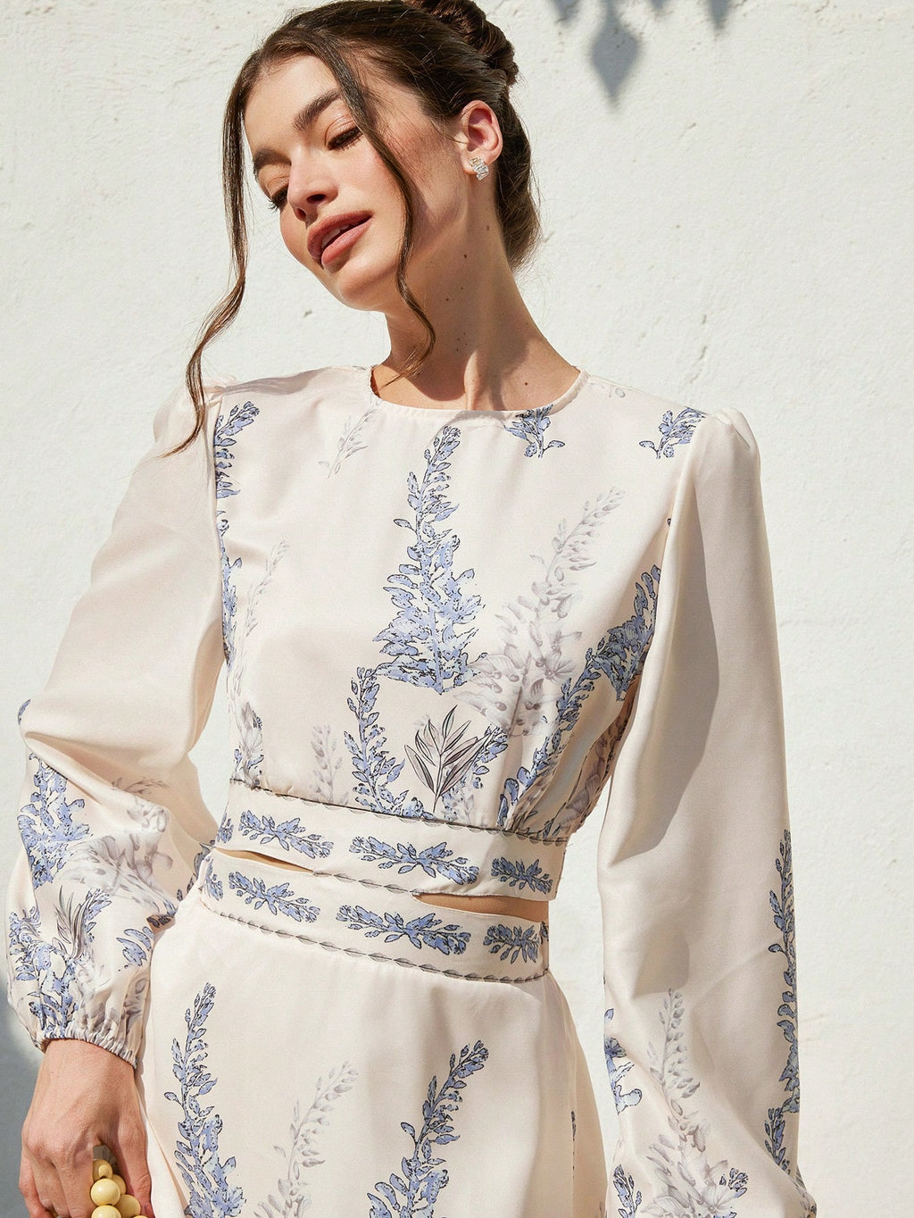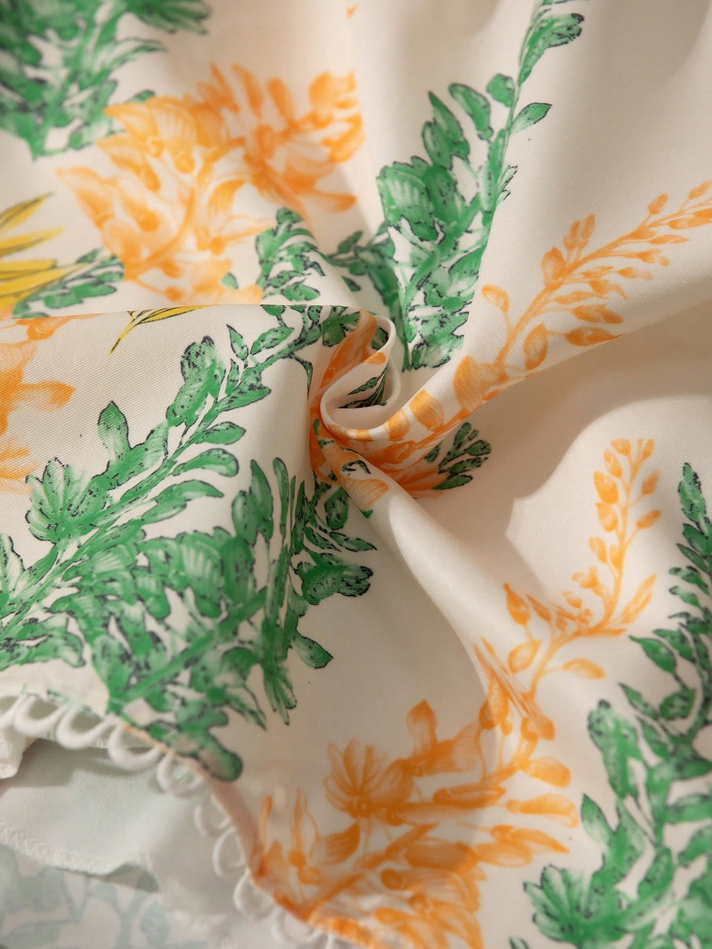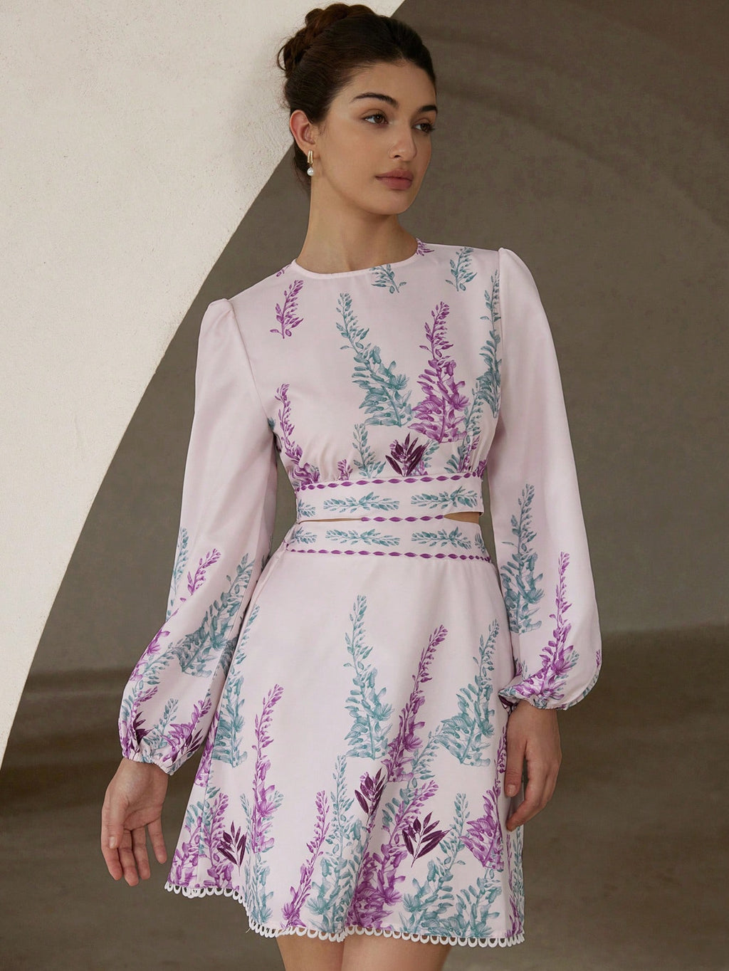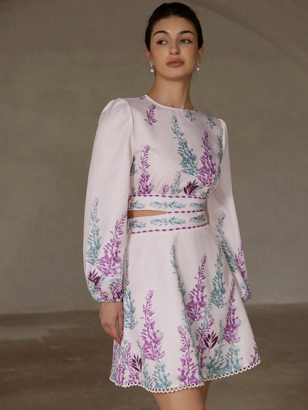 MiuVogue Rosie French Retro Palace Style Elegant A-Line Mini Dress, Small Round Neck, Waist Hollow Design, Lantern Sleeves, Retro Placement Print, Waist Cinching Design Boho Vacation FashionableStyle For Spring Fall
