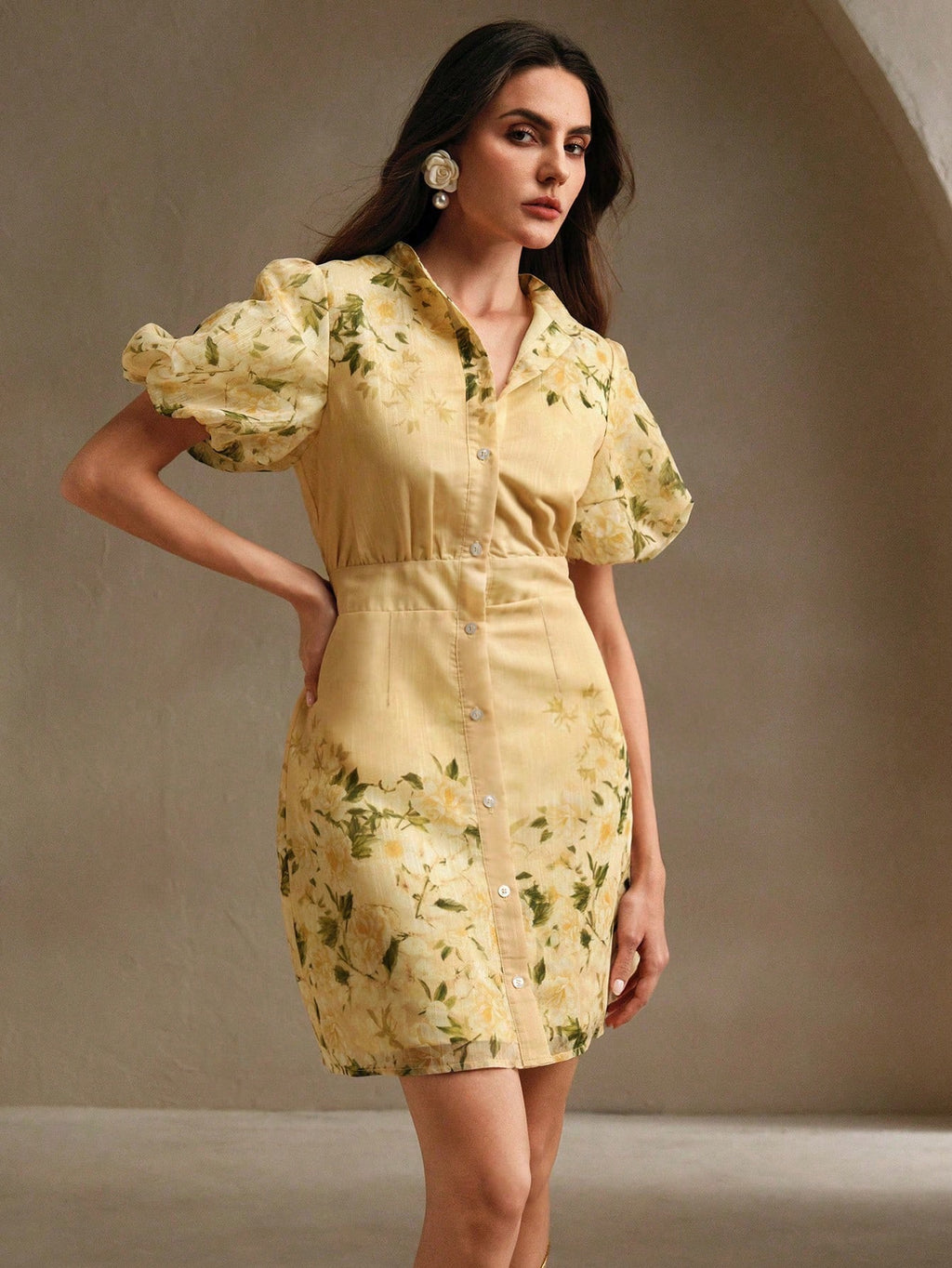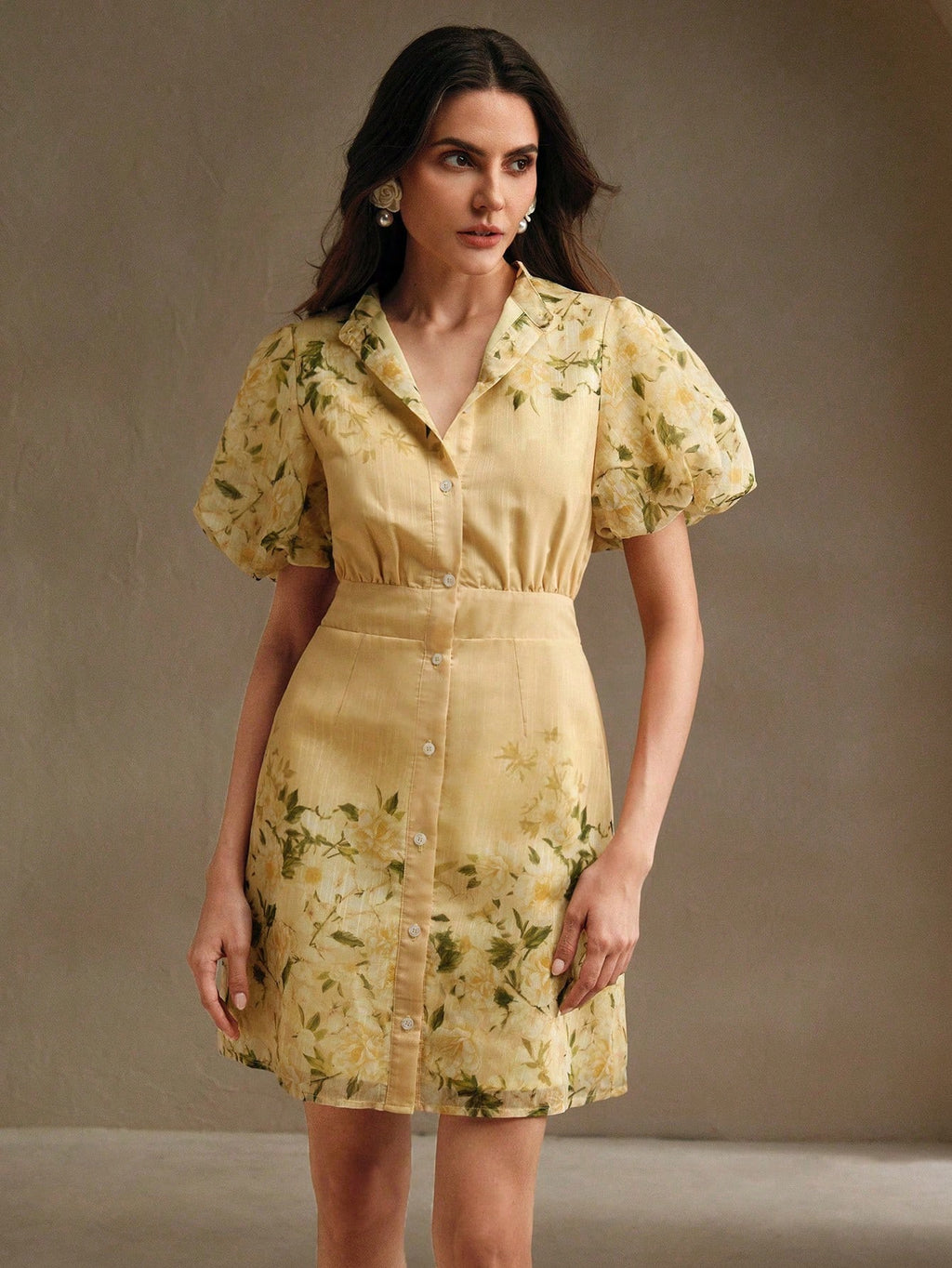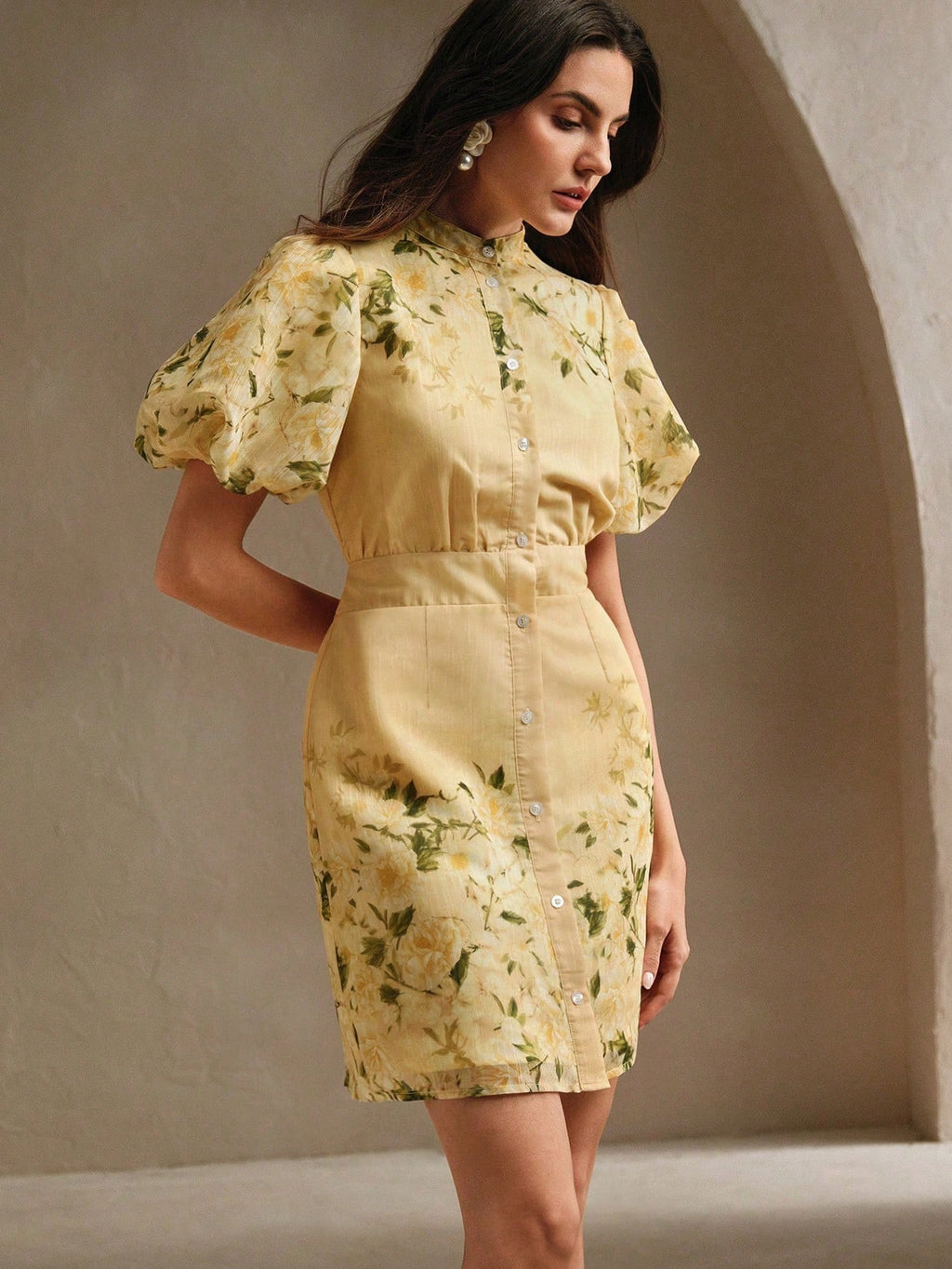 MiuVogue Round Neck Puff Sleeve Printed Front Open A-Line Hem Holiday Mini Dress