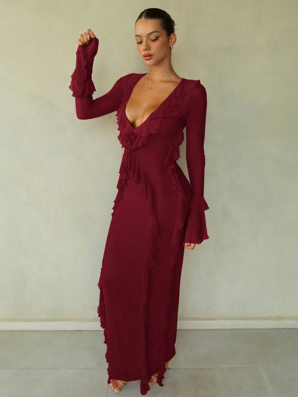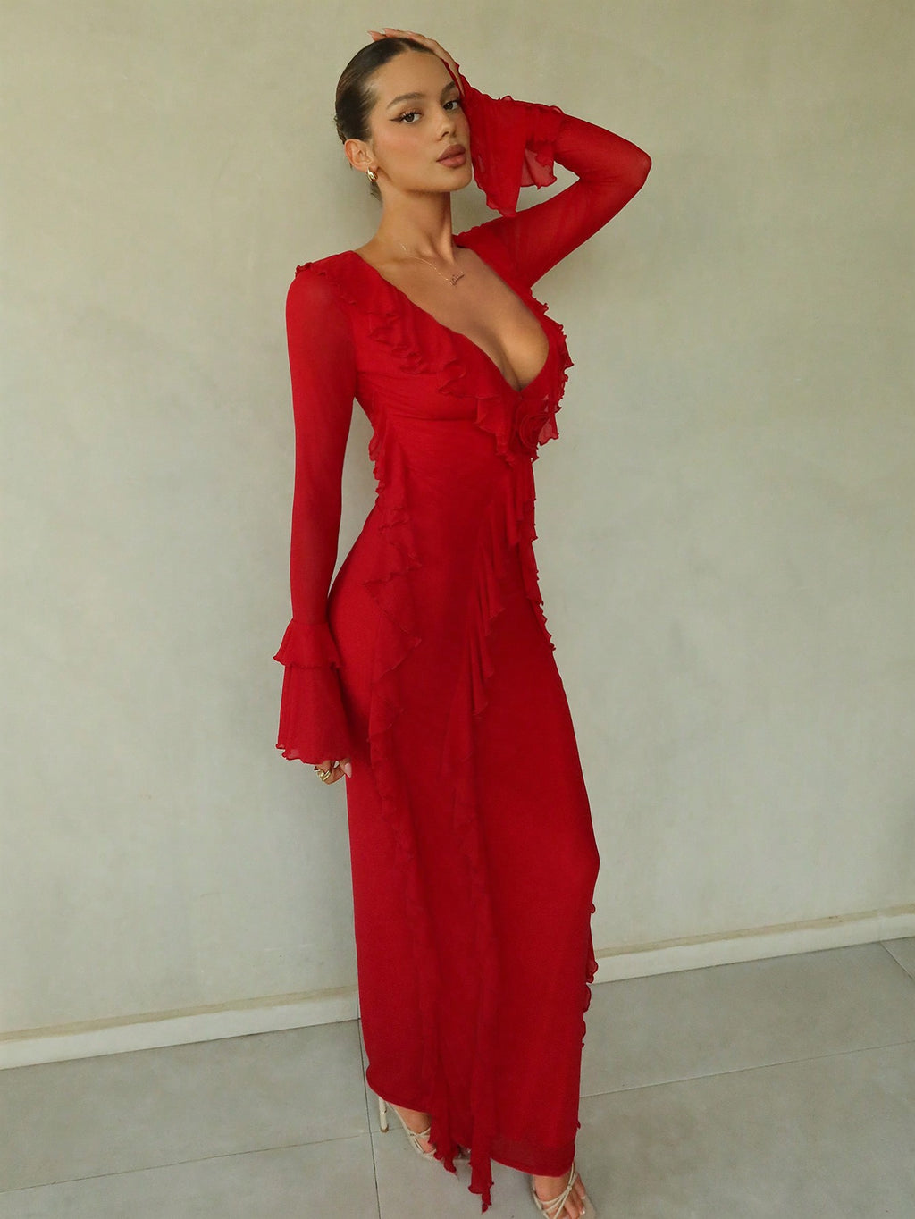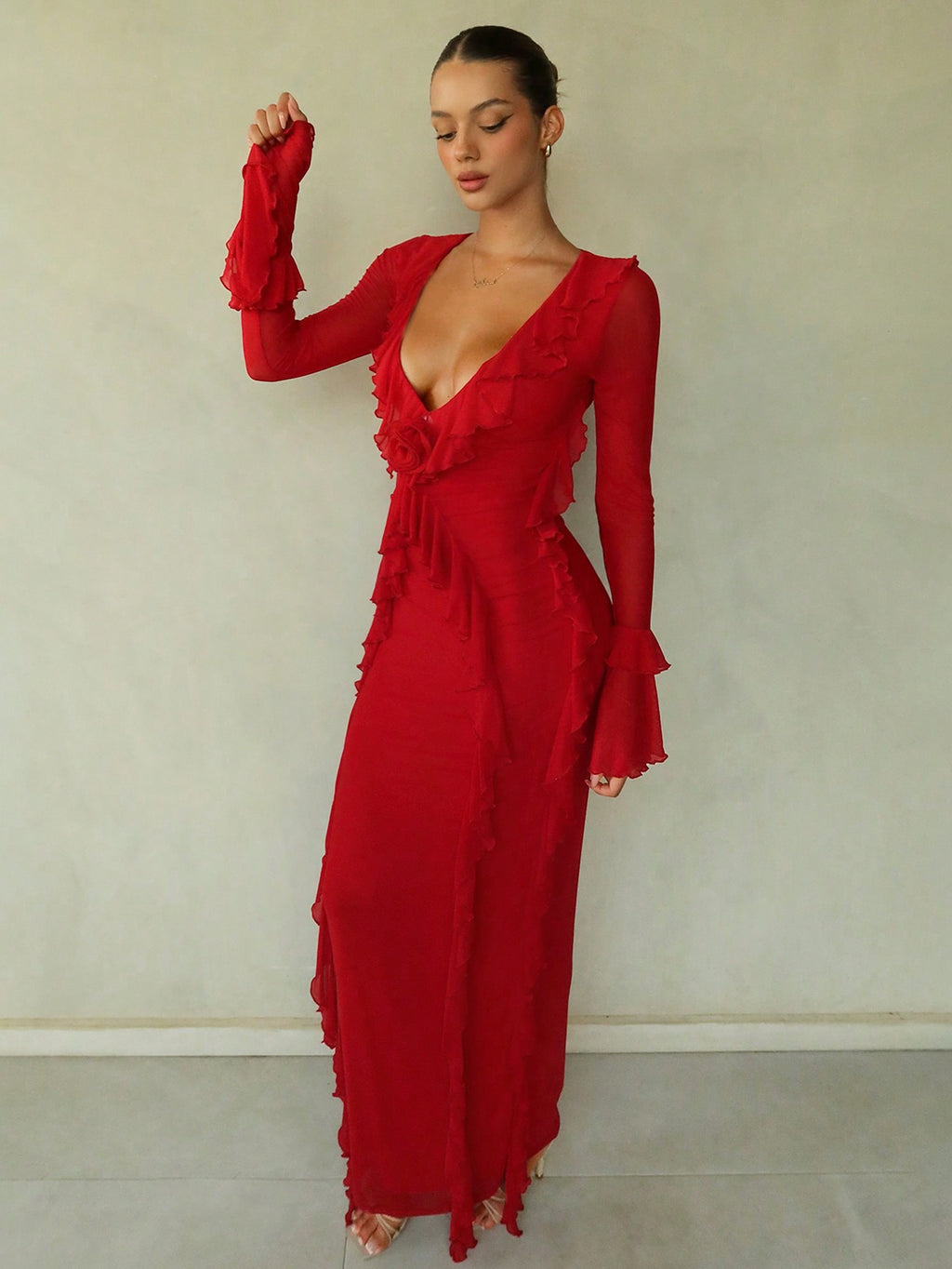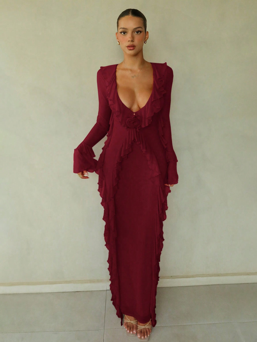 MiuVogue Solid Red Sexy Deep V-Neck Ruffle Trim Long Sleeve Dress, Elegant Minimalist Style Suitable For Autumn/Winter Layering, Cocktail Party, Date Night, Wedding Guest, Evening Occasion, Halloween, Christmas