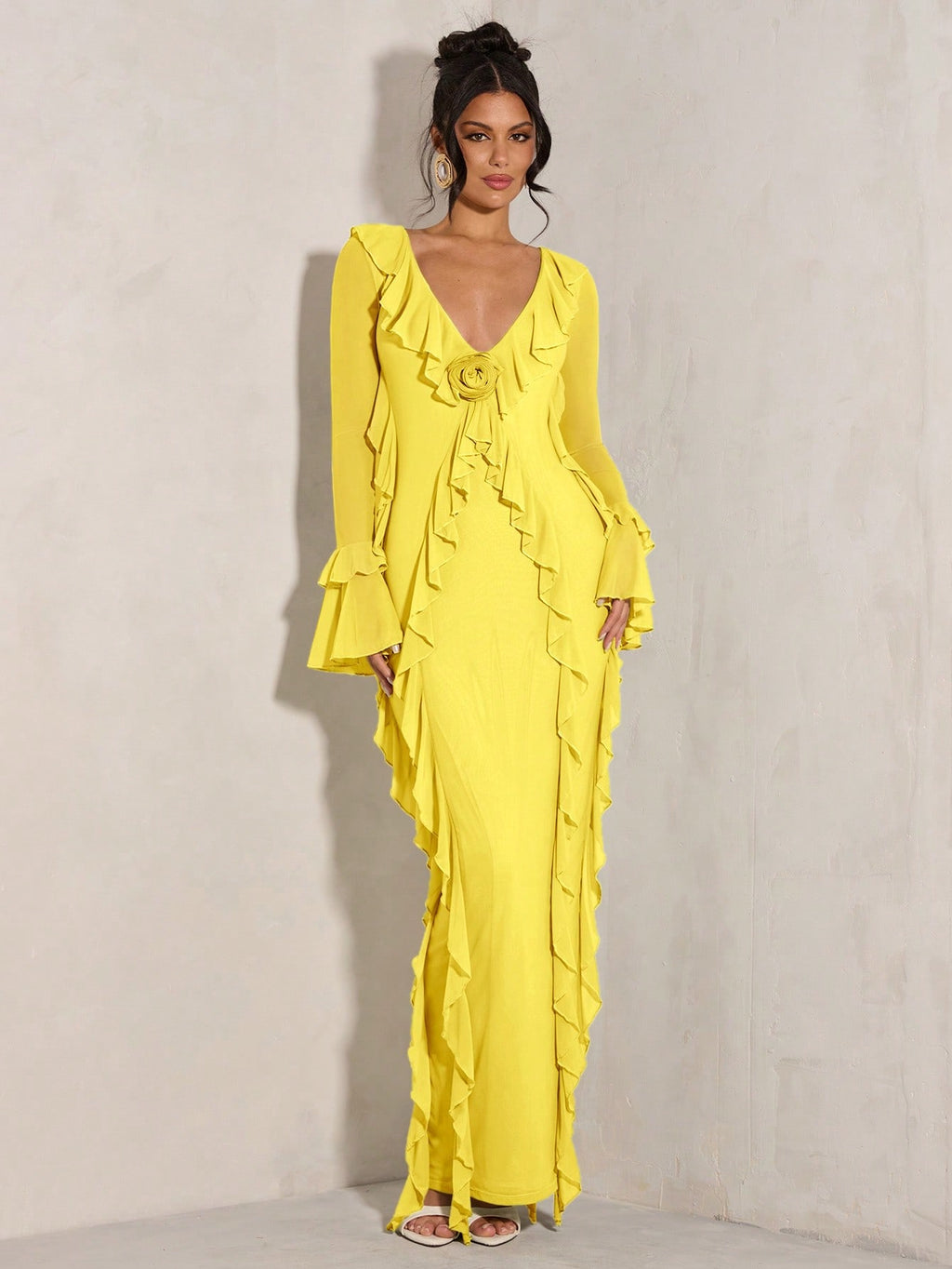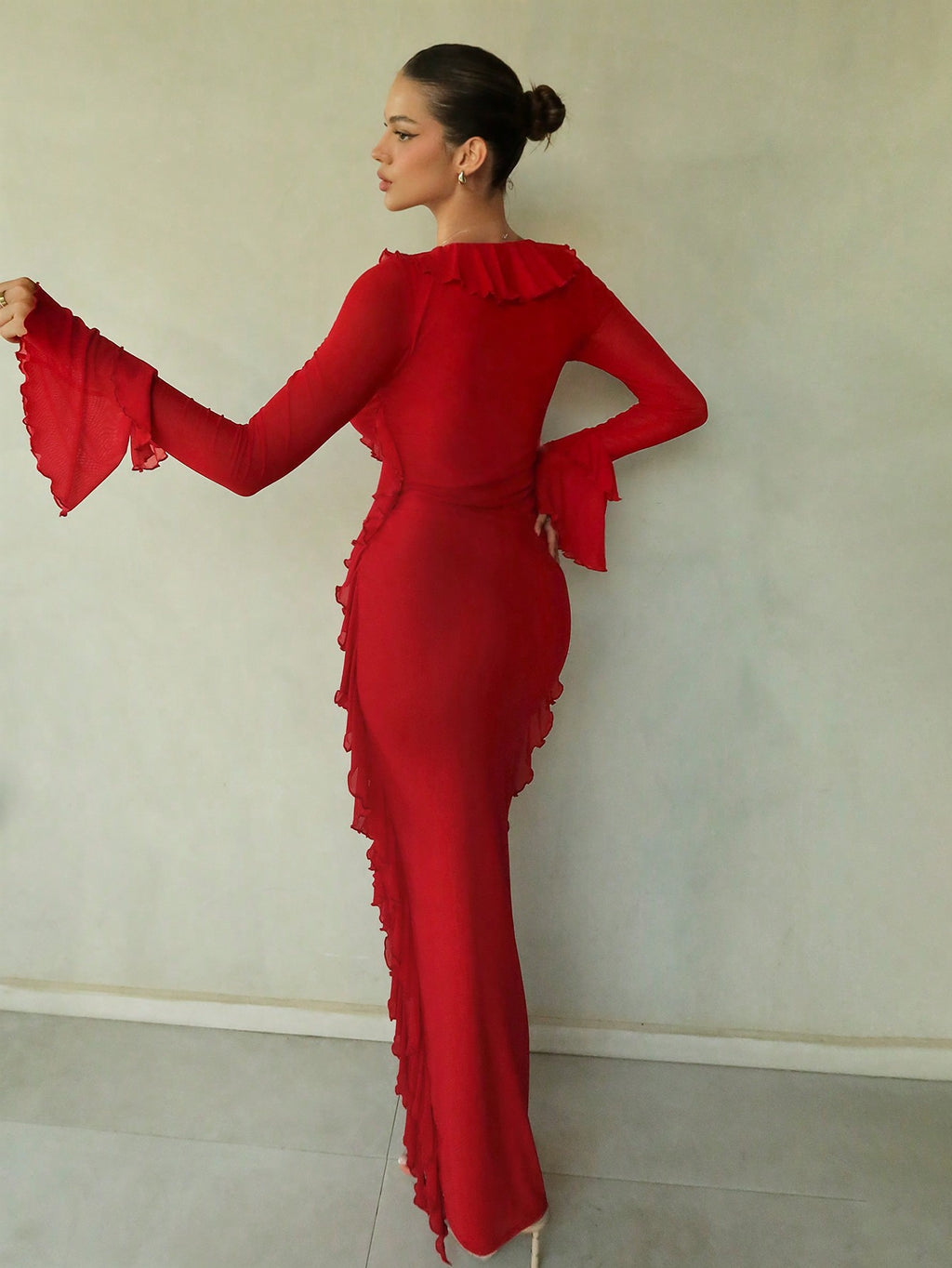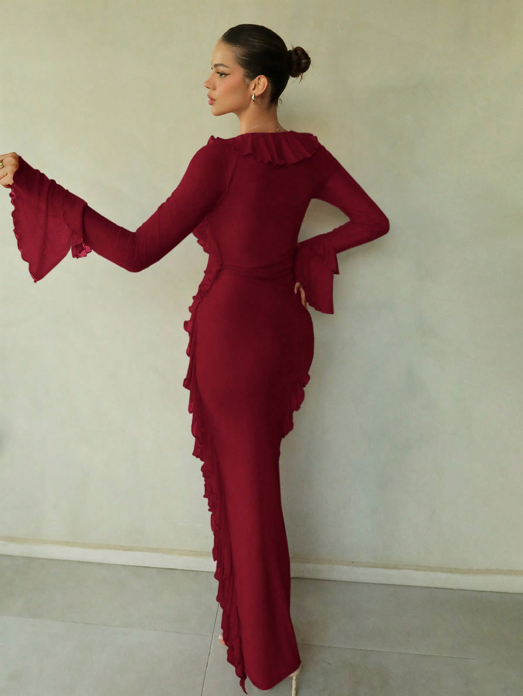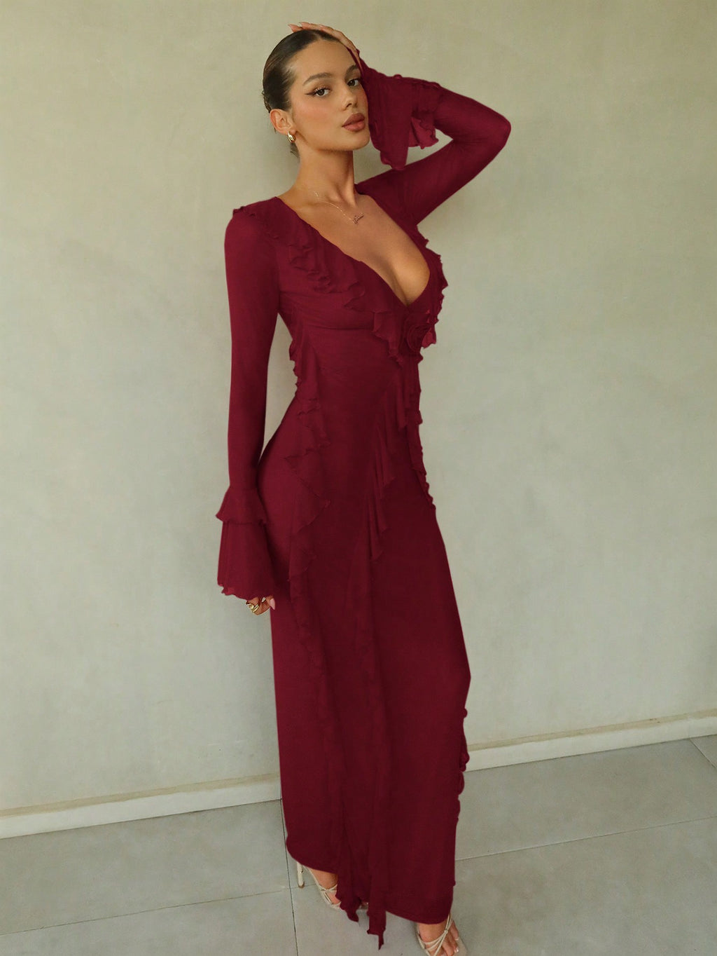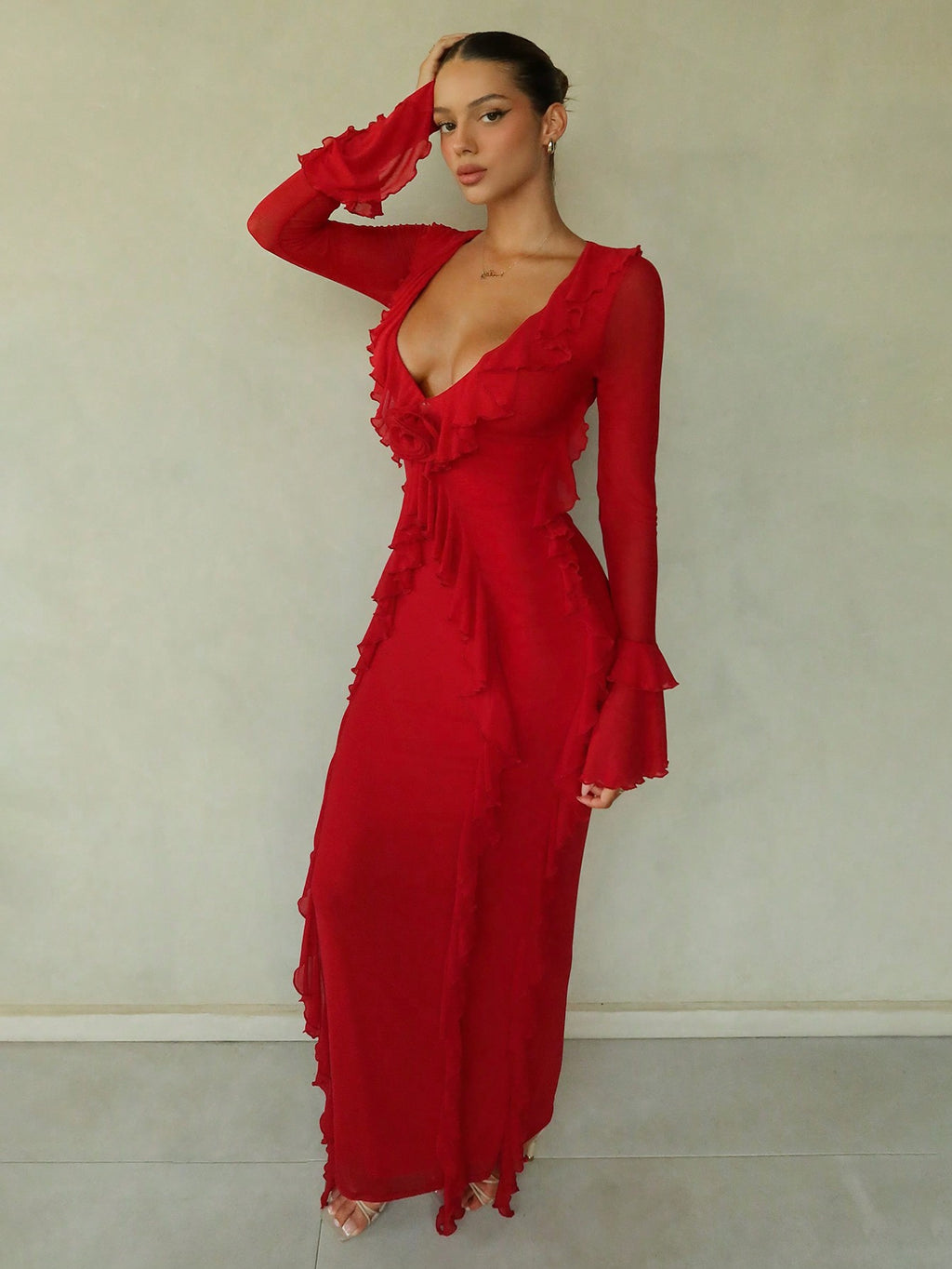 MiuVogue Solid Red Sexy Deep V-Neck Ruffle Trim Long Sleeve Dress, Elegant Minimalist Style Suitable For Autumn/Winter Layering, Cocktail Party, Date Night, Wedding Guest, Evening Occasion, Halloween, Christmas