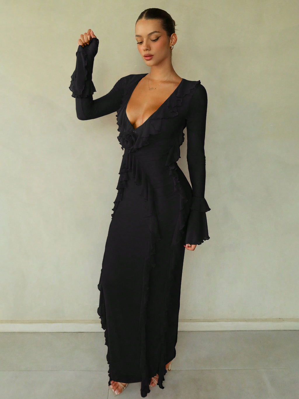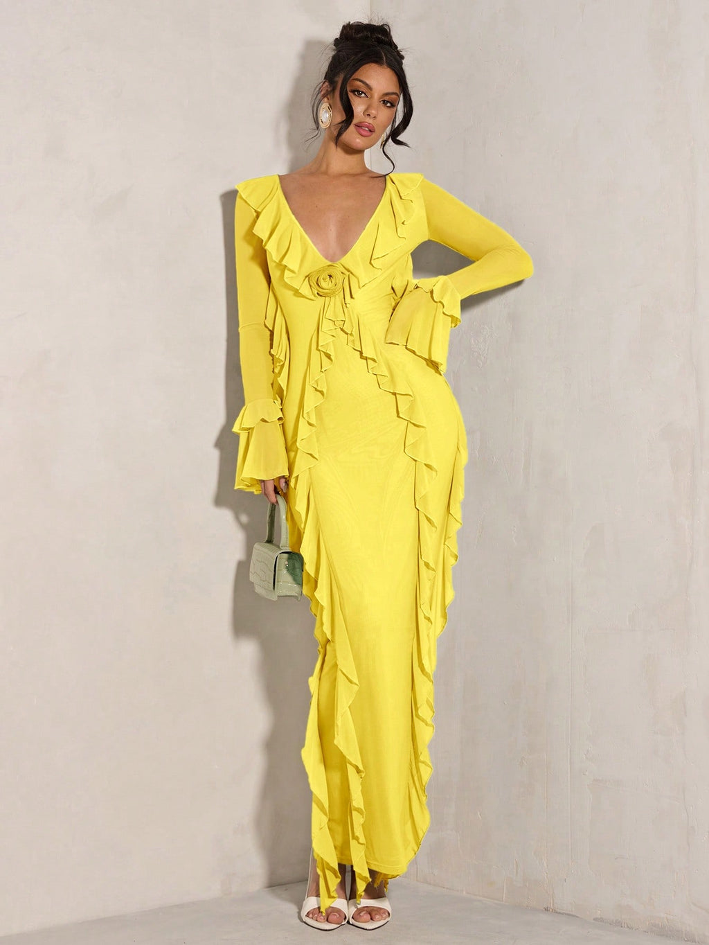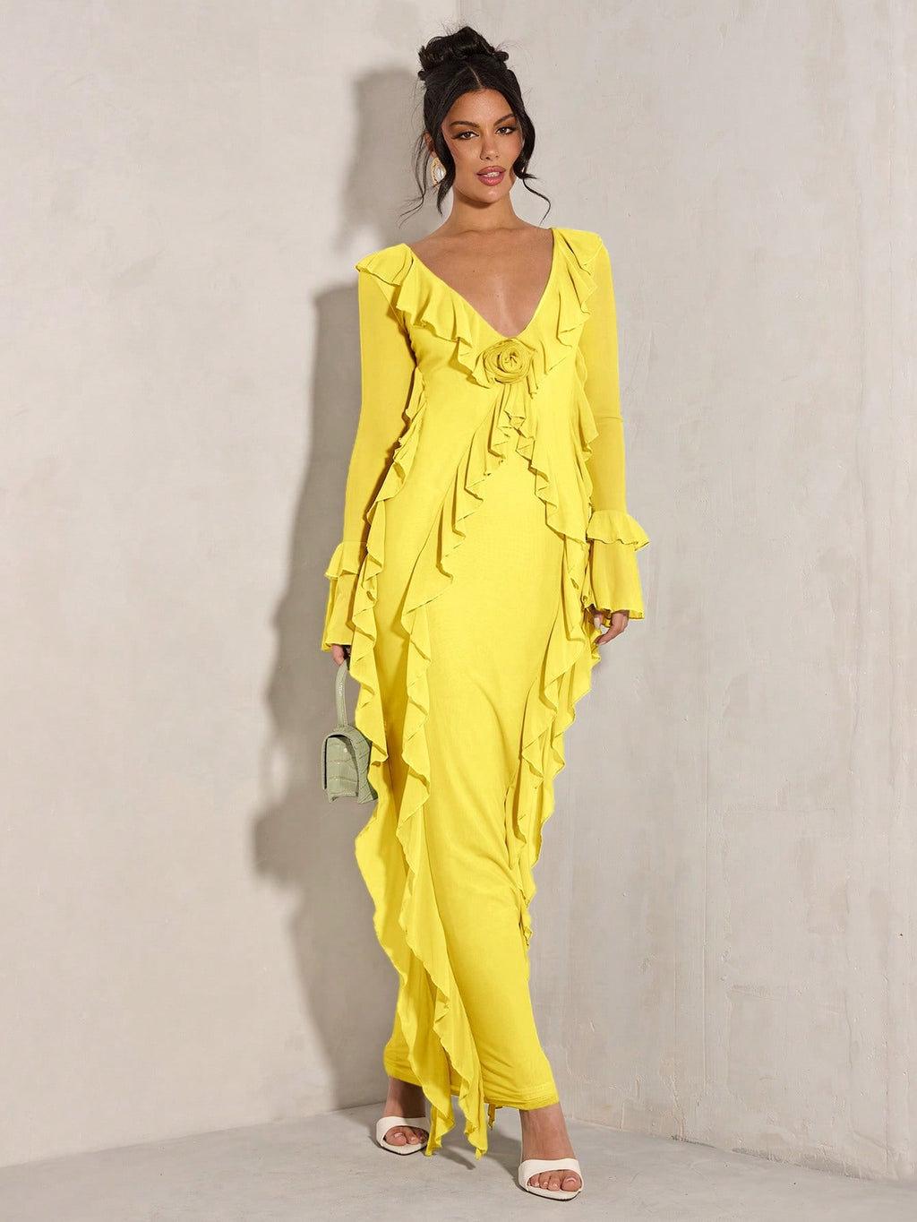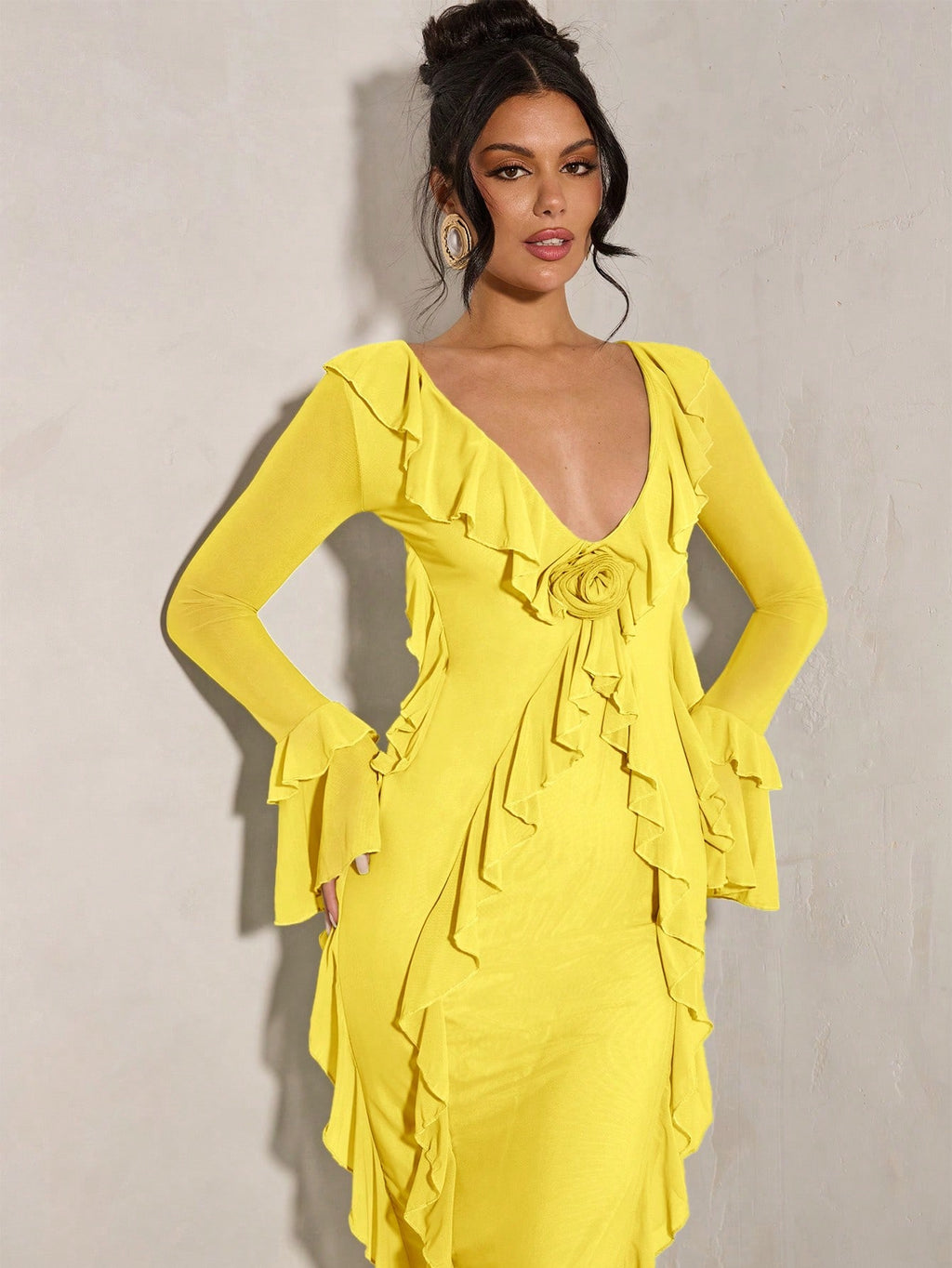 MiuVogue Solid Red Sexy Deep V-Neck Ruffle Trim Long Sleeve Dress, Elegant Minimalist Style Suitable For Autumn/Winter Layering, Cocktail Party, Date Night, Wedding Guest, Evening Occasion, Halloween, Christmas