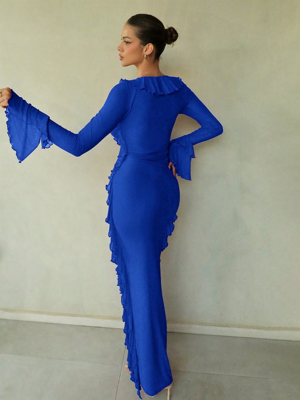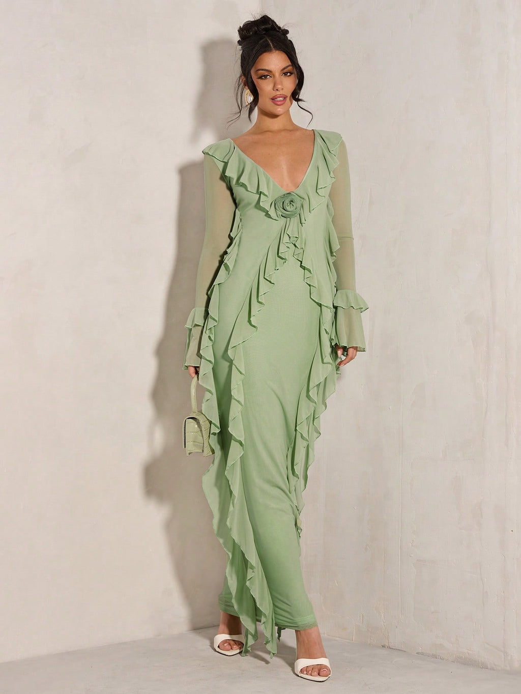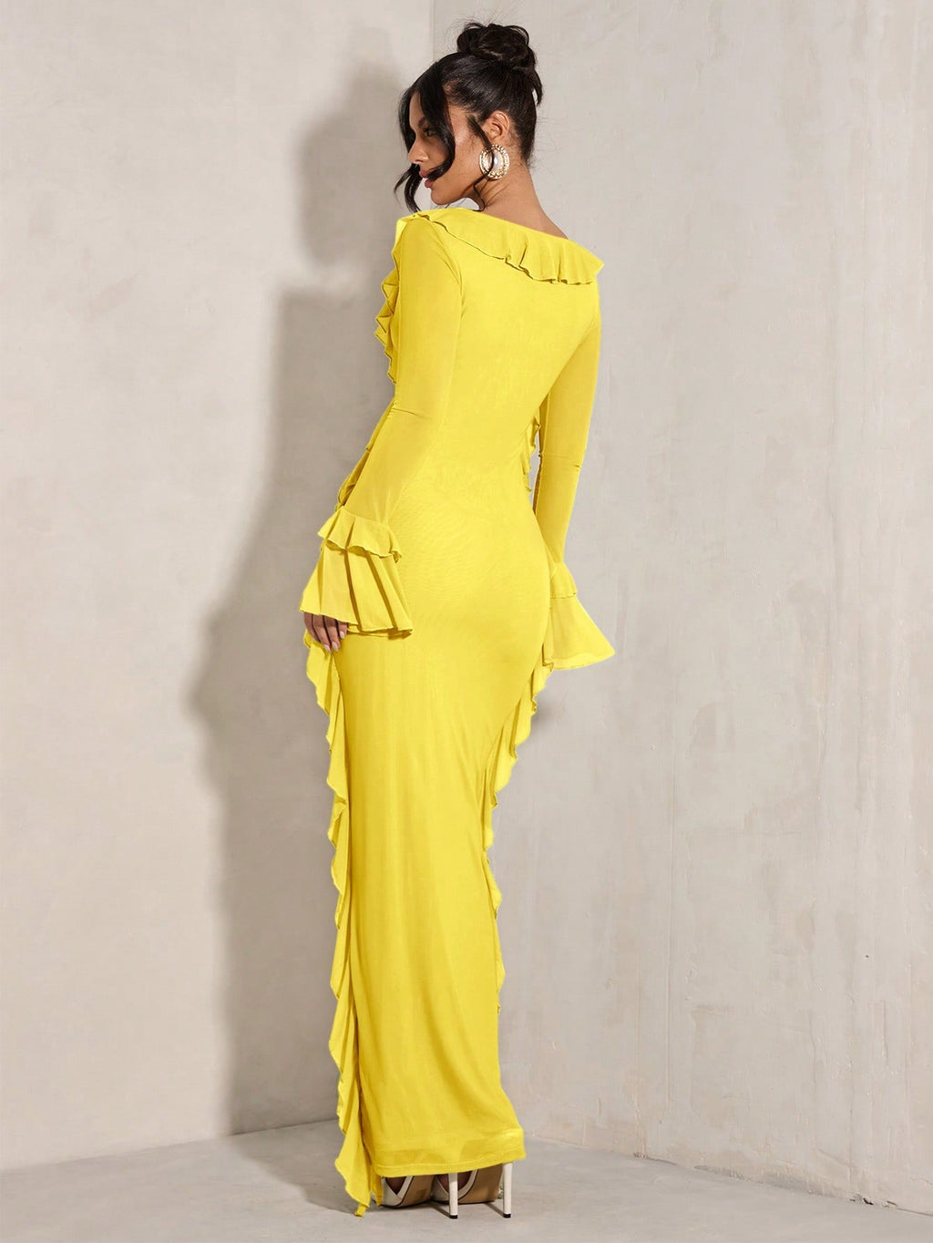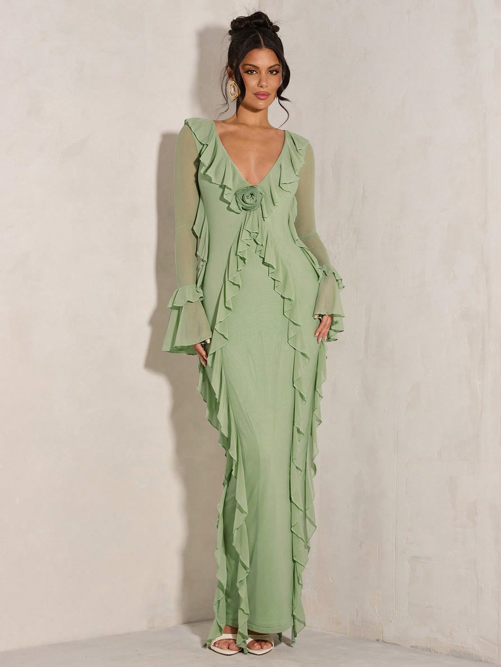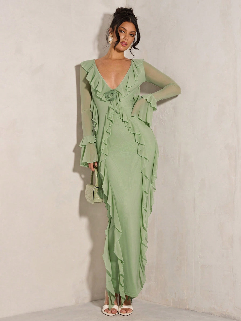 MiuVogue Solid Red Sexy Deep V-Neck Ruffle Trim Long Sleeve Dress, Elegant Minimalist Style Suitable For Autumn/Winter Layering, Cocktail Party, Date Night, Wedding Guest, Evening Occasion, Halloween, Christmas