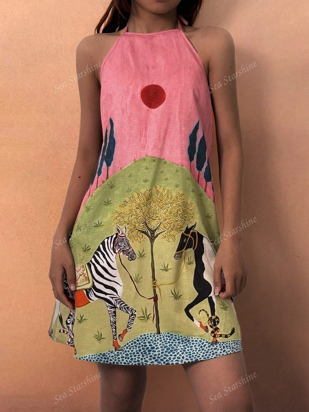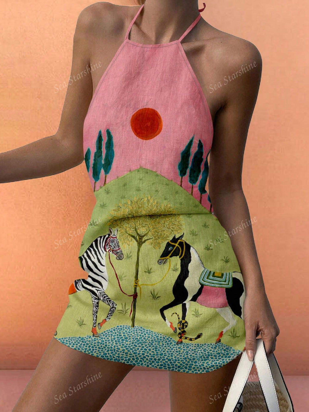 MiuVogue Spring And Summer New Women's Fashion Elegant Casual Holiday Style Lawn Tree Sun Animal Pattern Design Sleeveless Neck Short Dresses