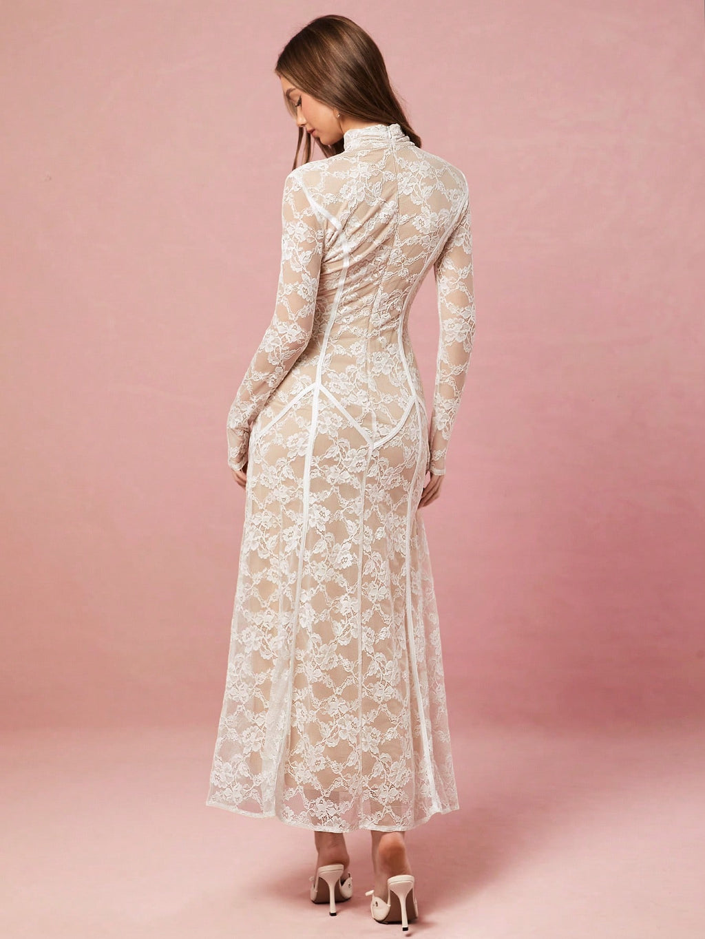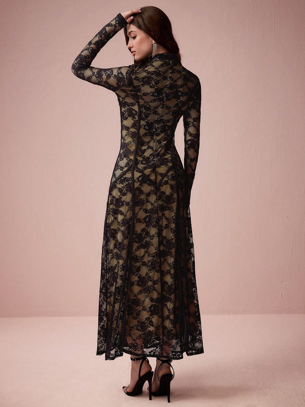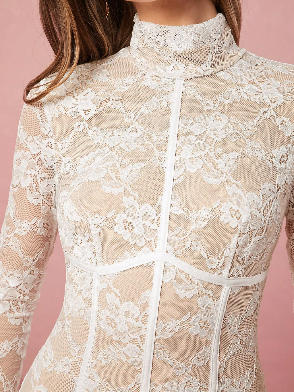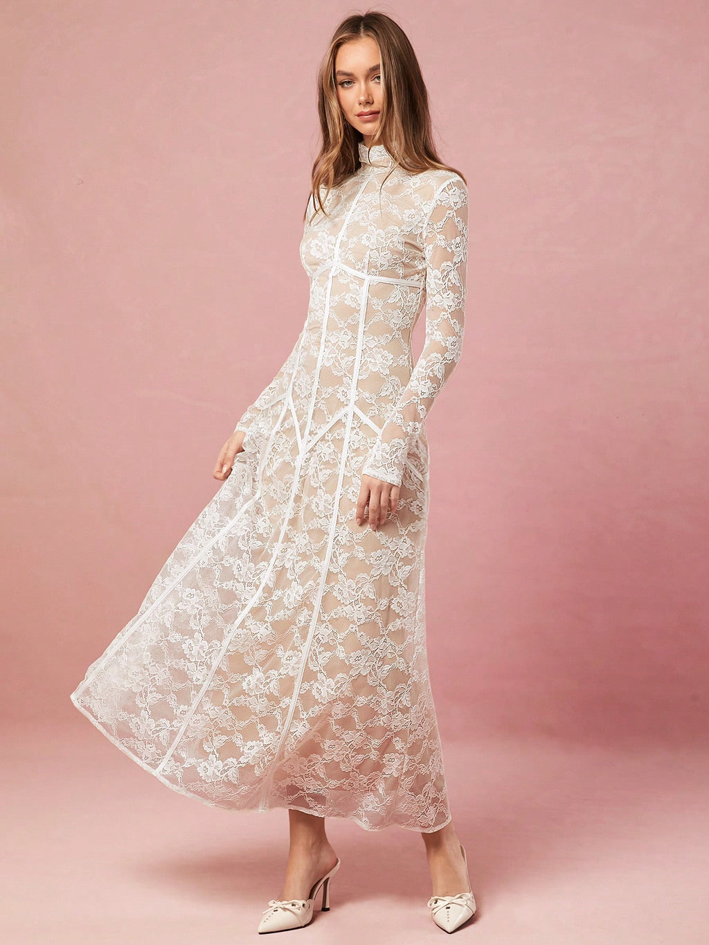 MiuVogue Spring Summer Romantic Sweet Women's Floral Lace Stand Collar Long Sleeve Sexy Dress,For Valentine Day