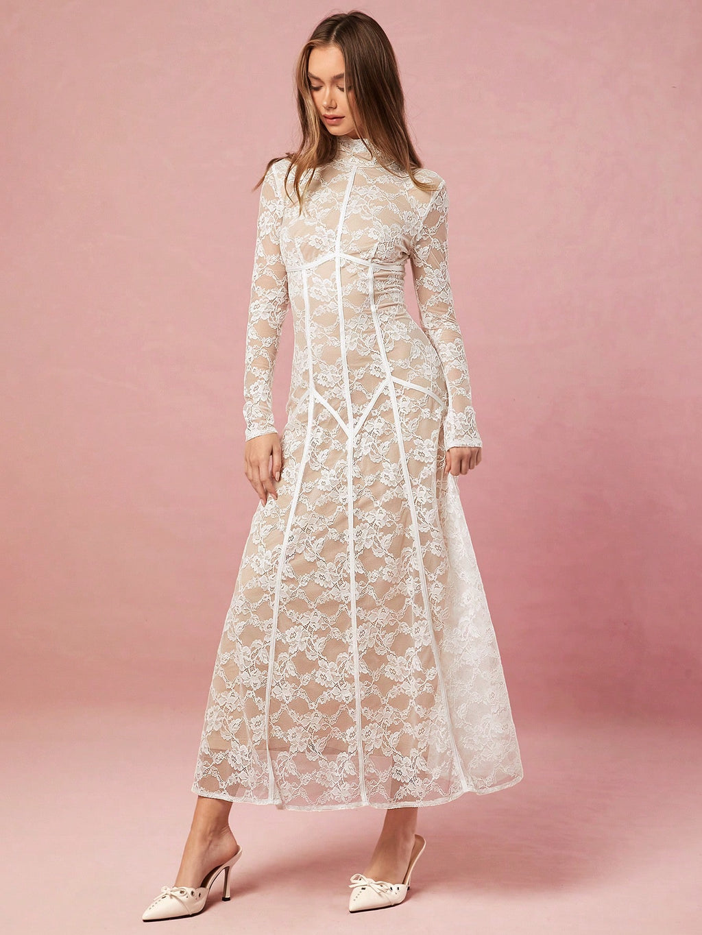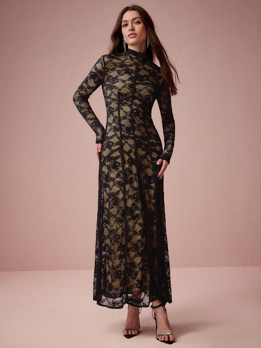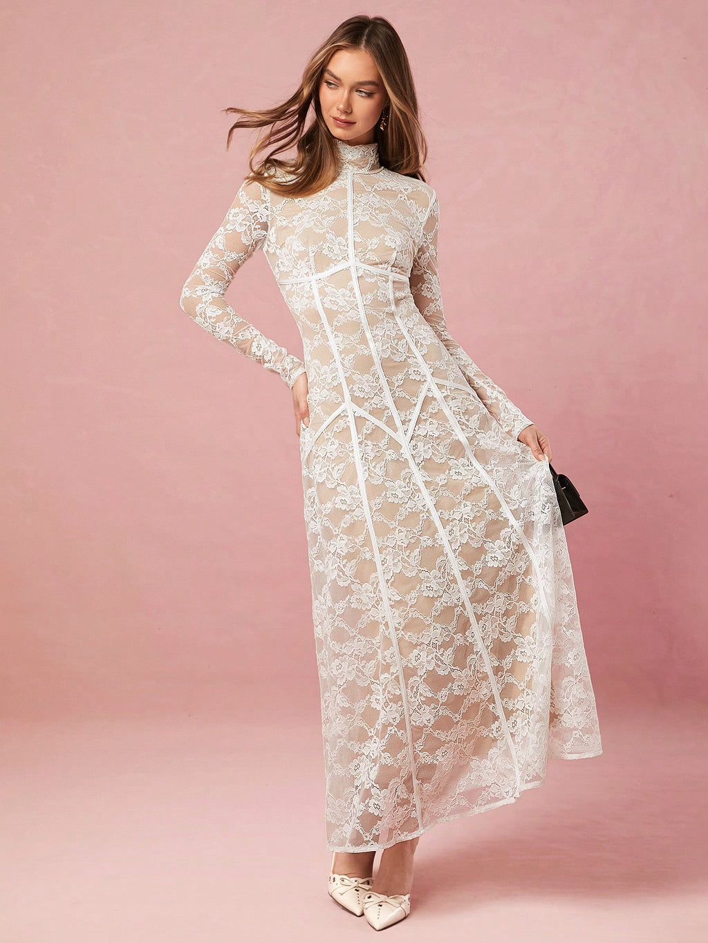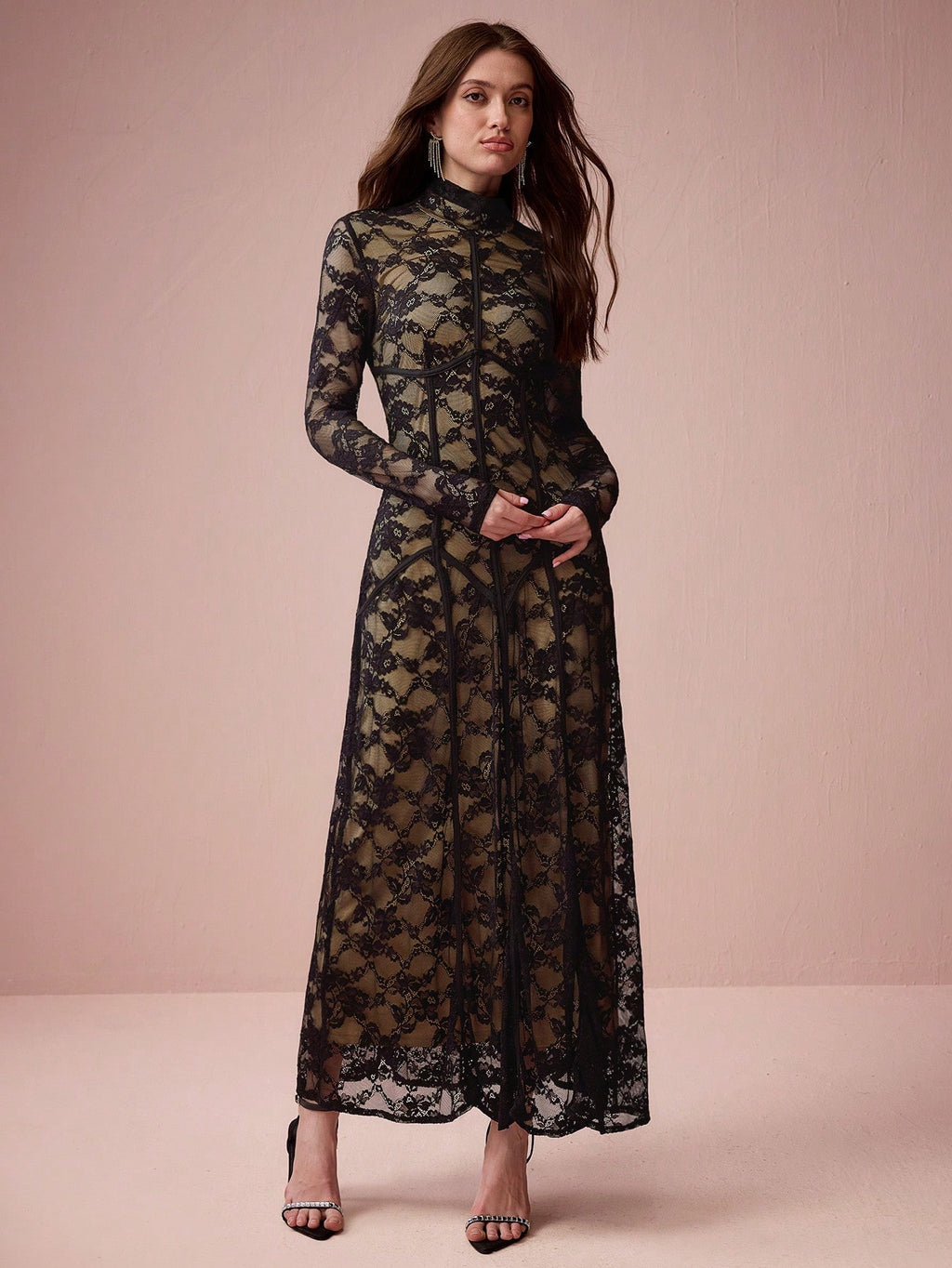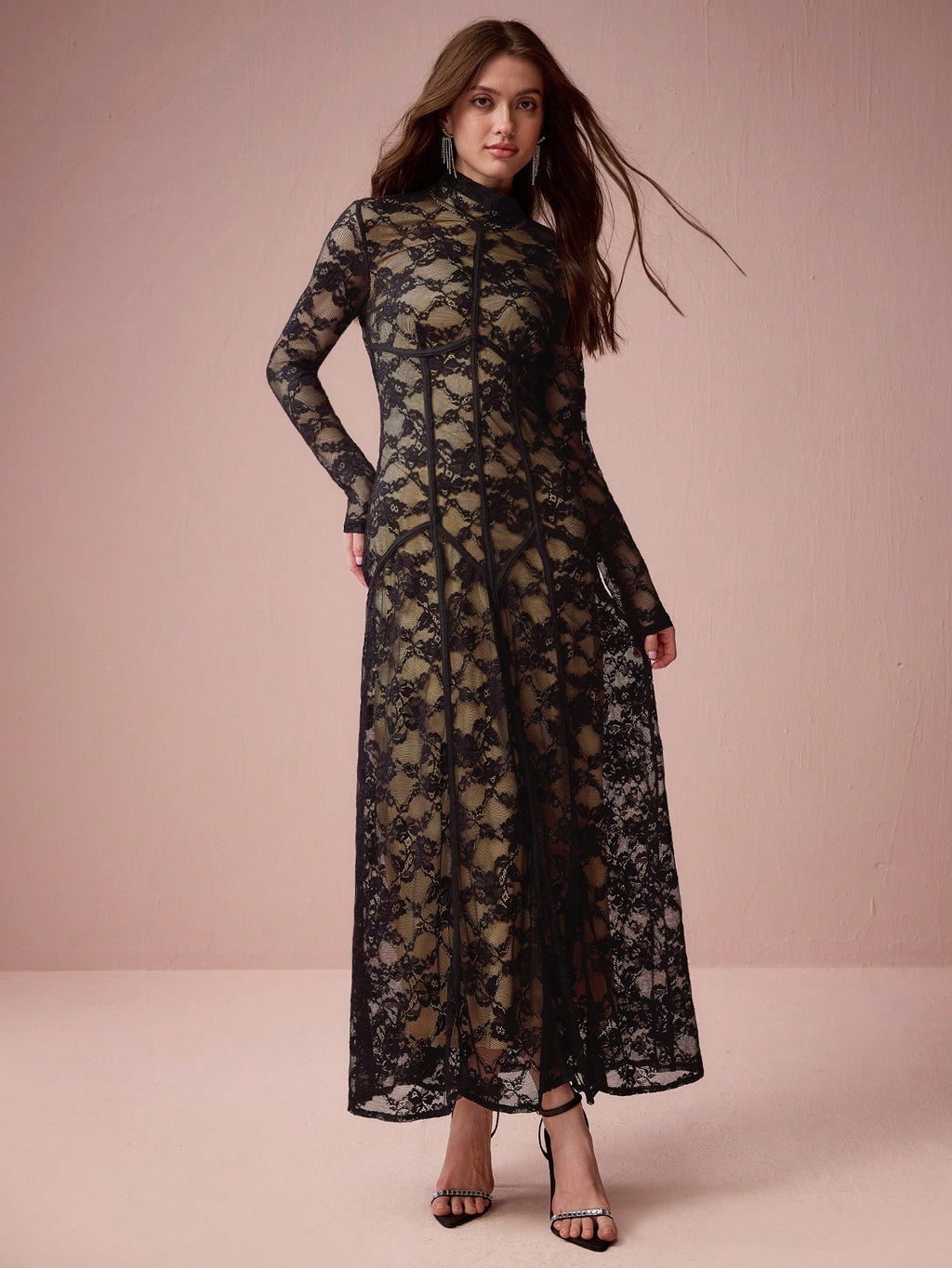 MiuVogue Spring Summer Romantic Sweet Women's Floral Lace Stand Collar Long Sleeve Sexy Dress,For Valentine Day