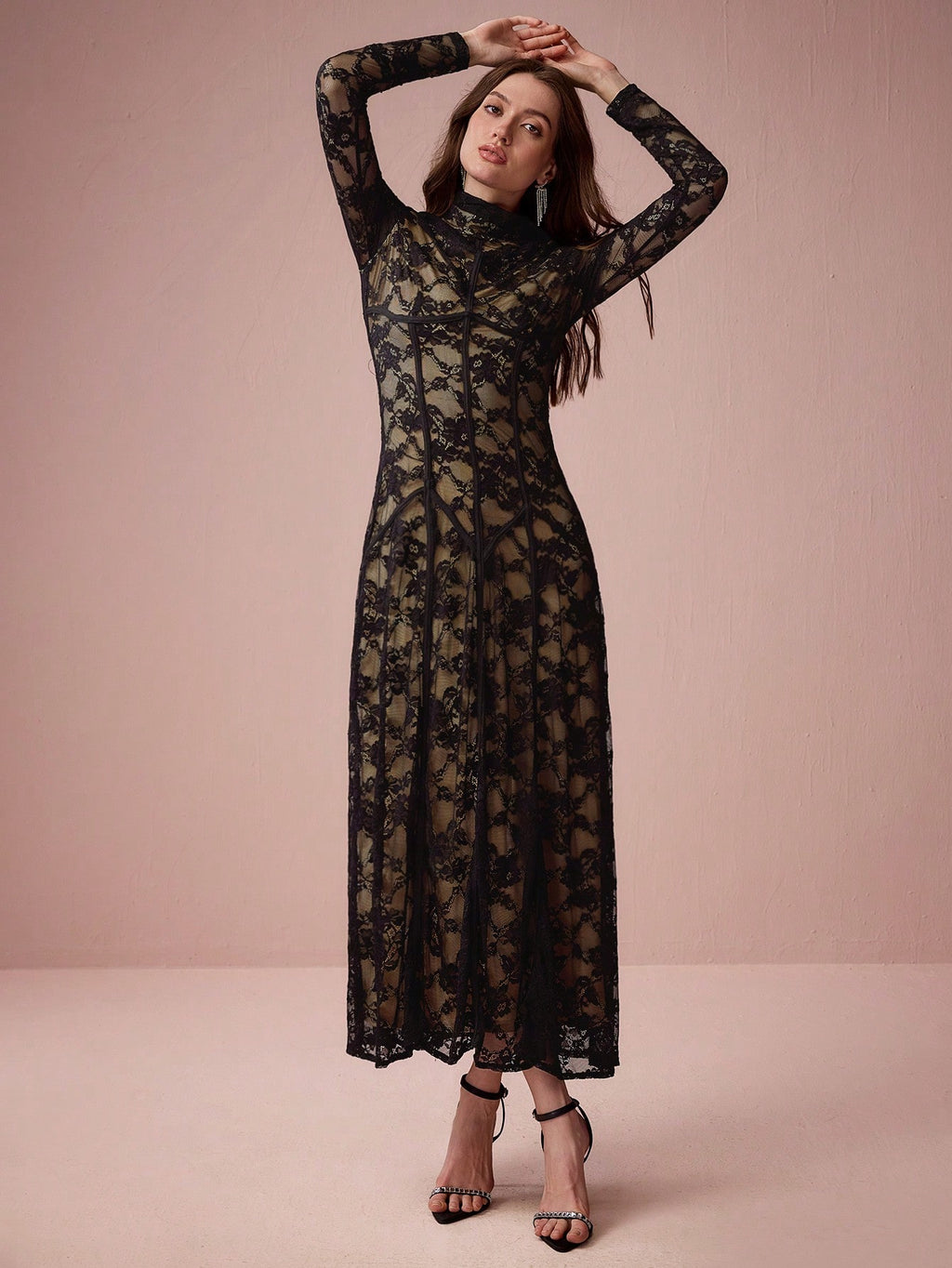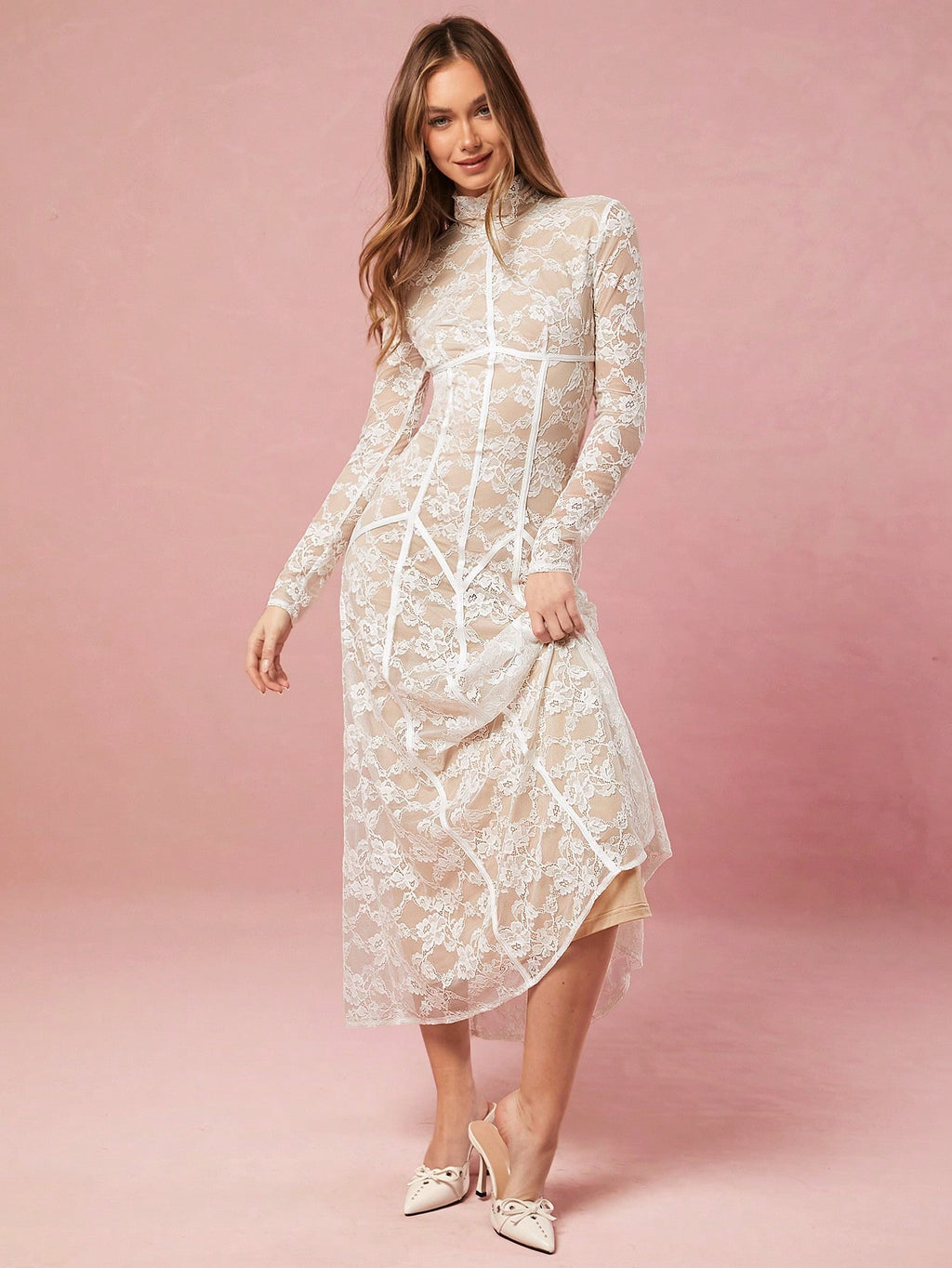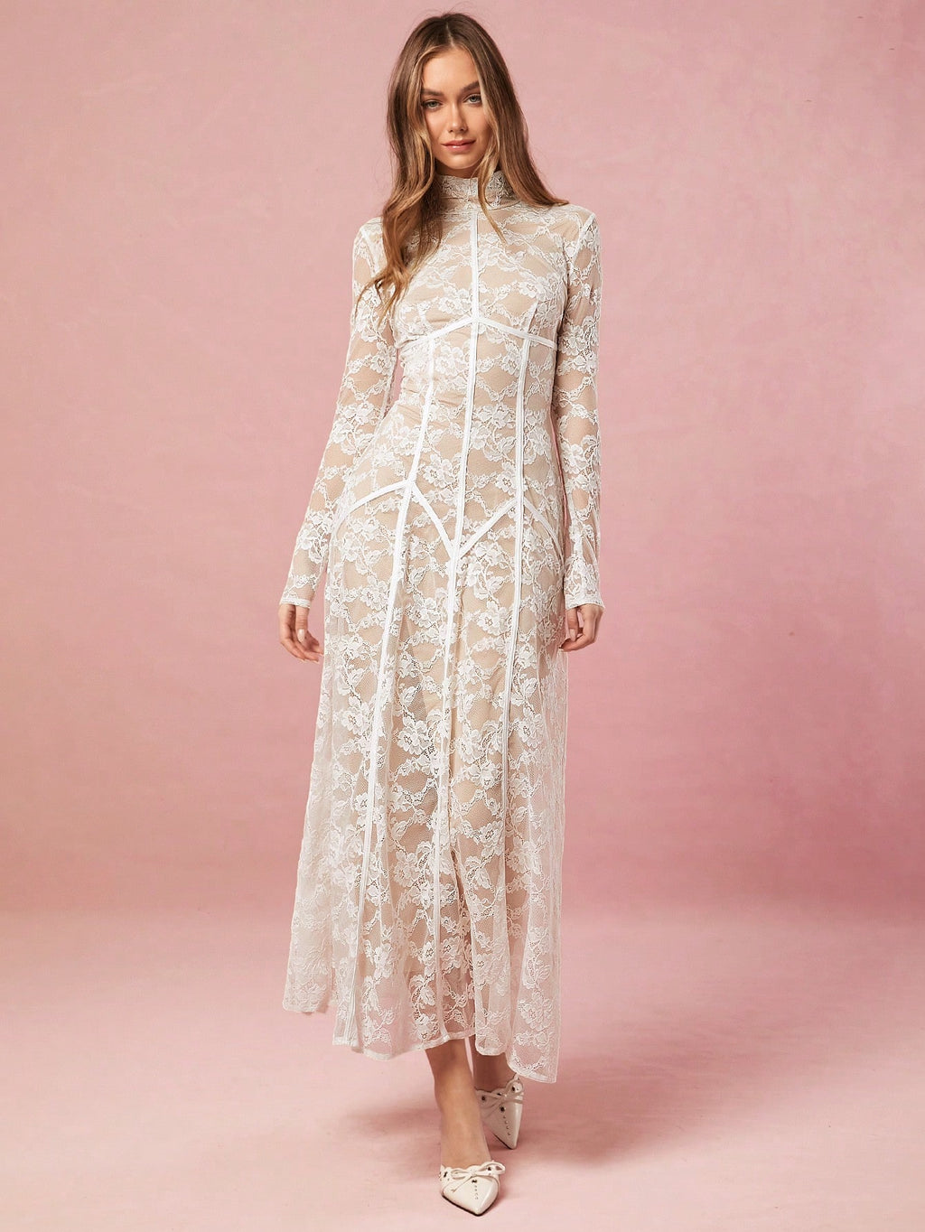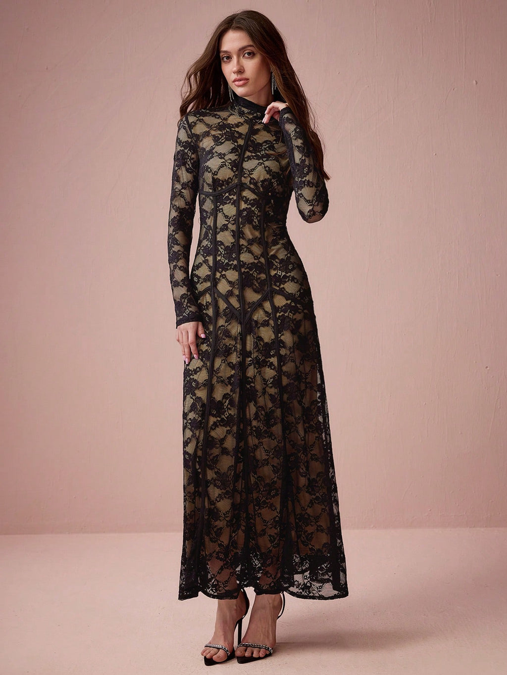 MiuVogue Spring Summer Romantic Sweet Women's Floral Lace Stand Collar Long Sleeve Sexy Dress,For Valentine Day
