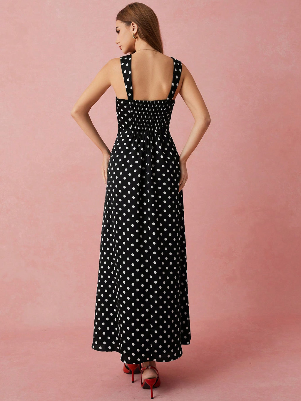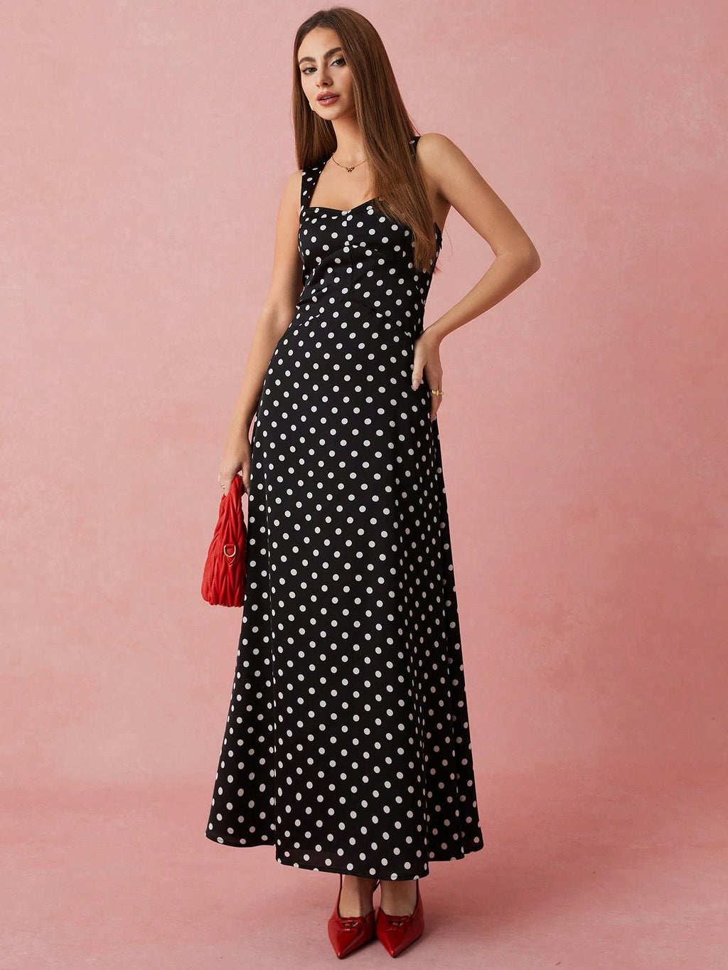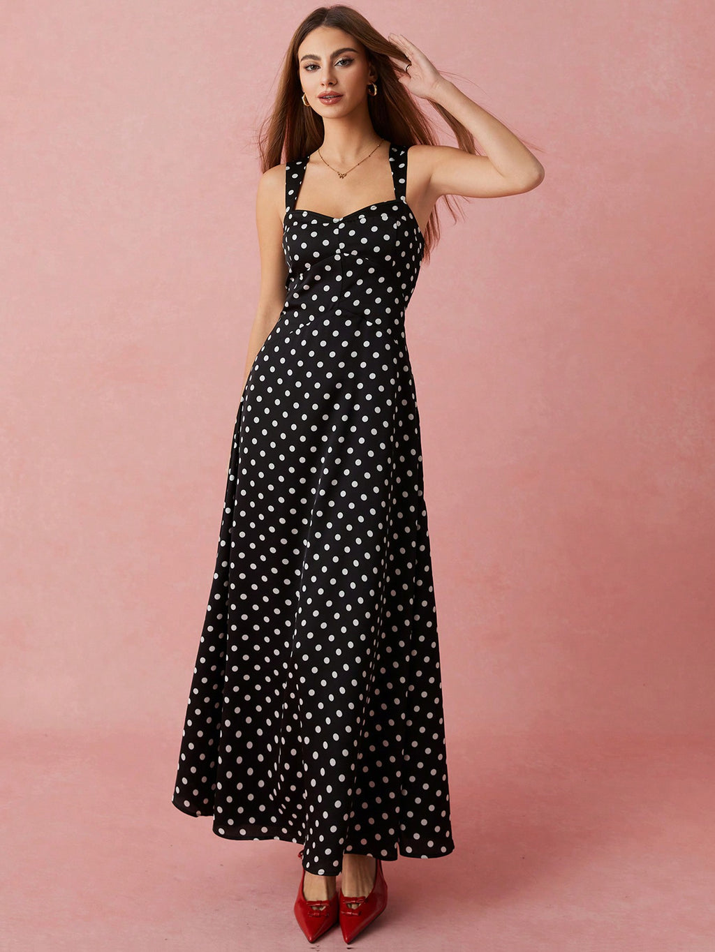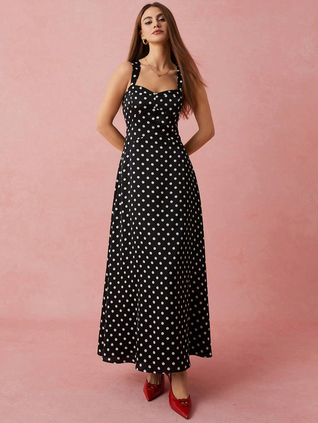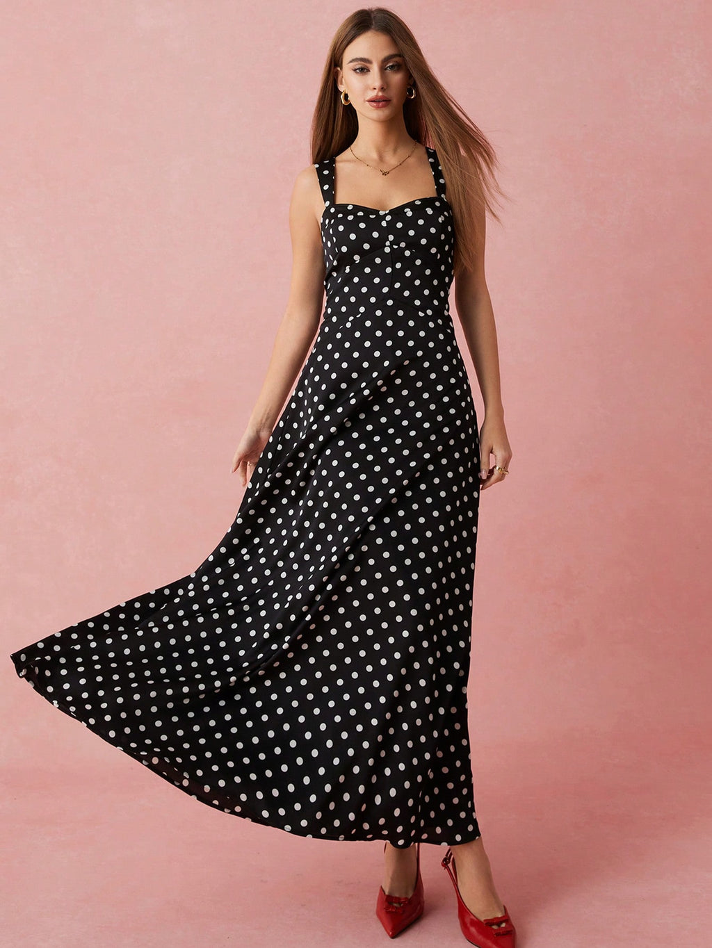 MiuVogue Spring Summer Romantic Women Black Polka Dot Print Long Casual Dress With Wide Straps,For Romantic Dinner Dates,Holiday Dresses,Vacation Dresses,Valentine's Day Dress