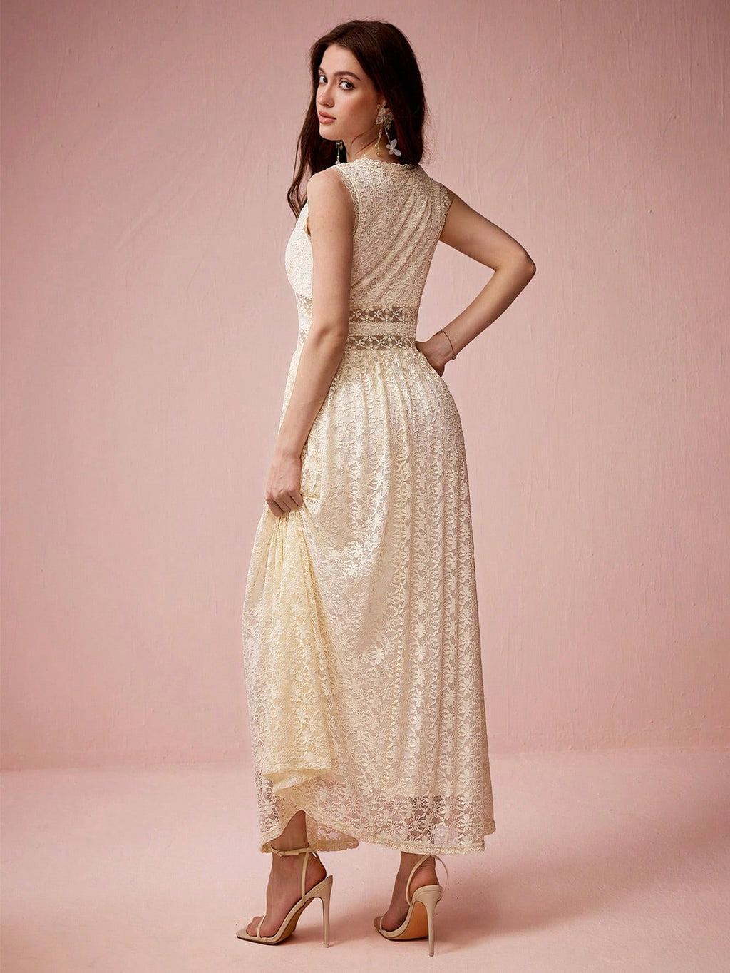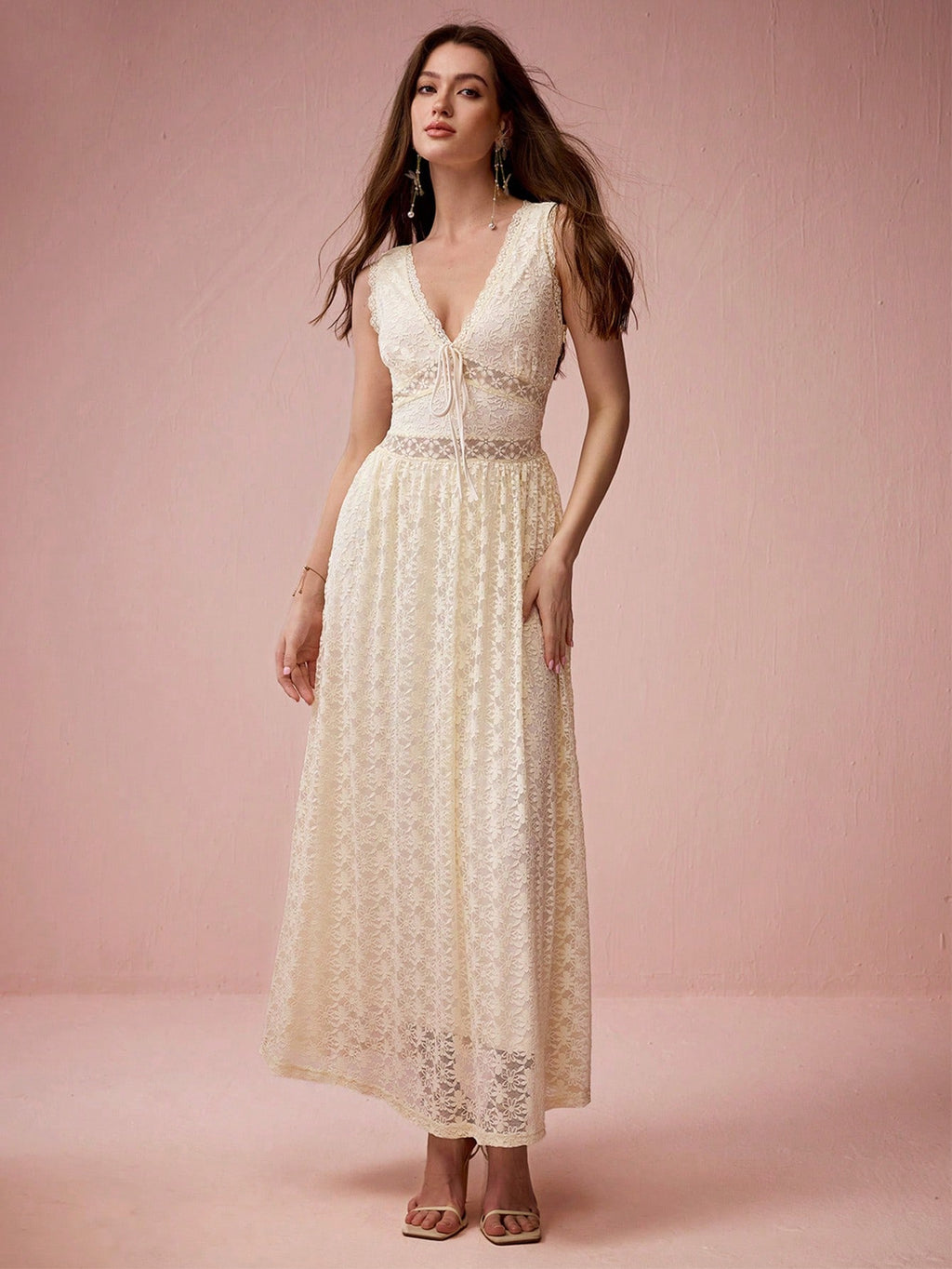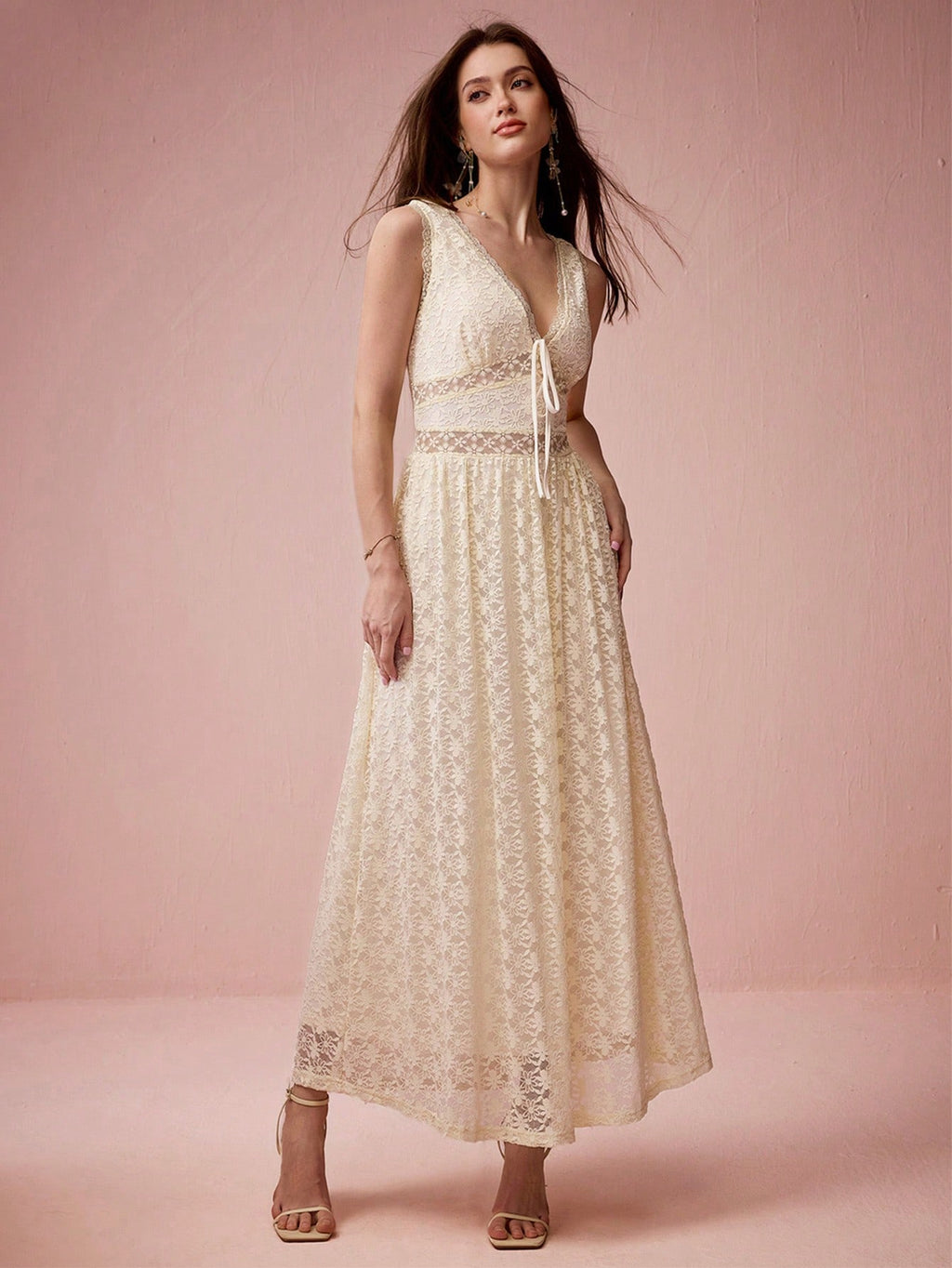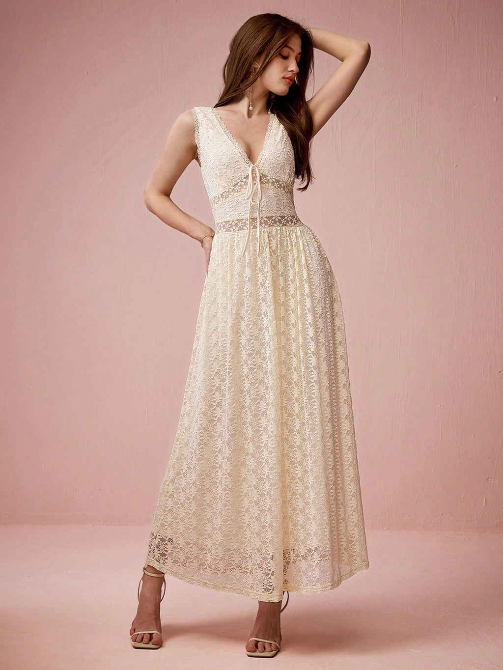 MiuVogue Spring/Summer Romantic Women's Apricot Exquisite Lace Sleeveless Bowknot V-Neck Maxi Dress,Sweet