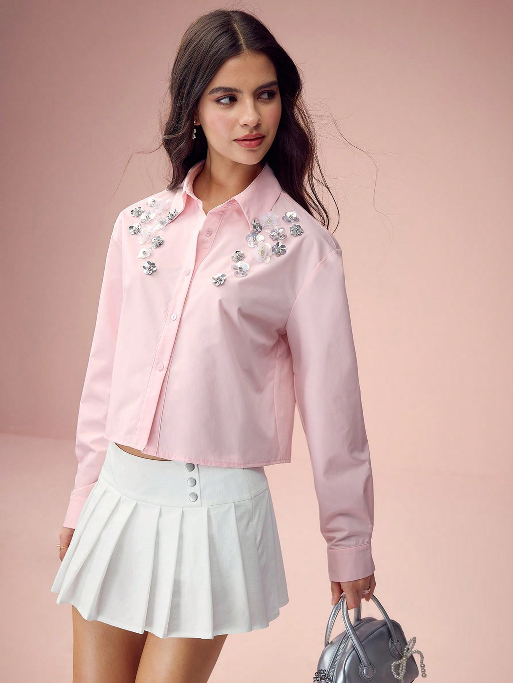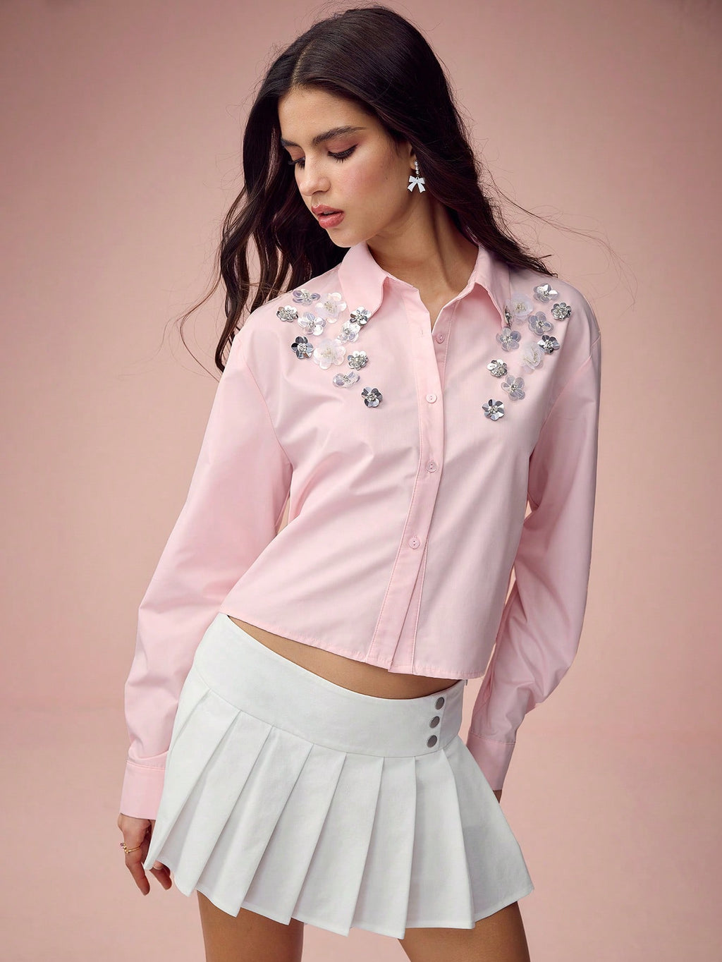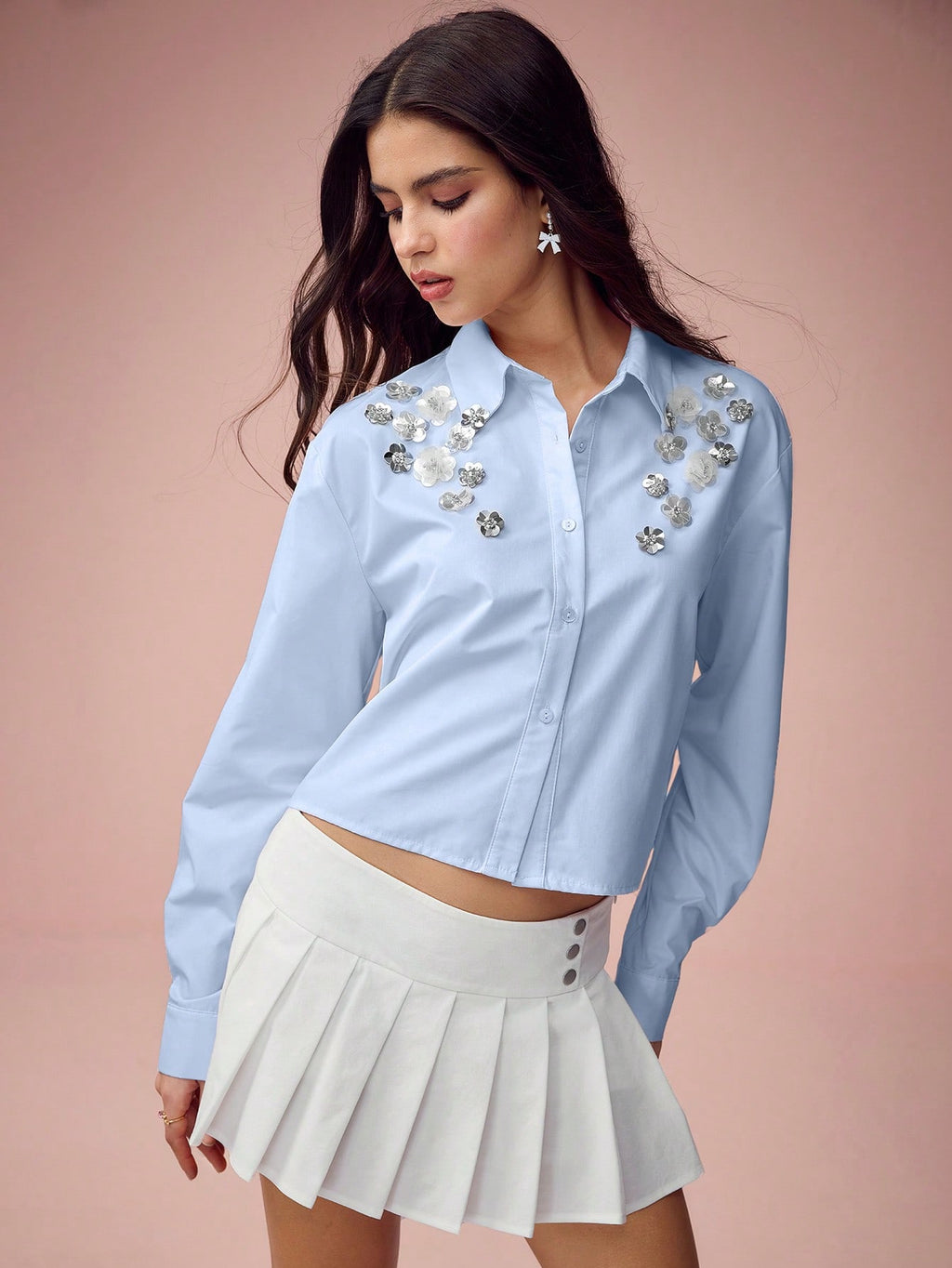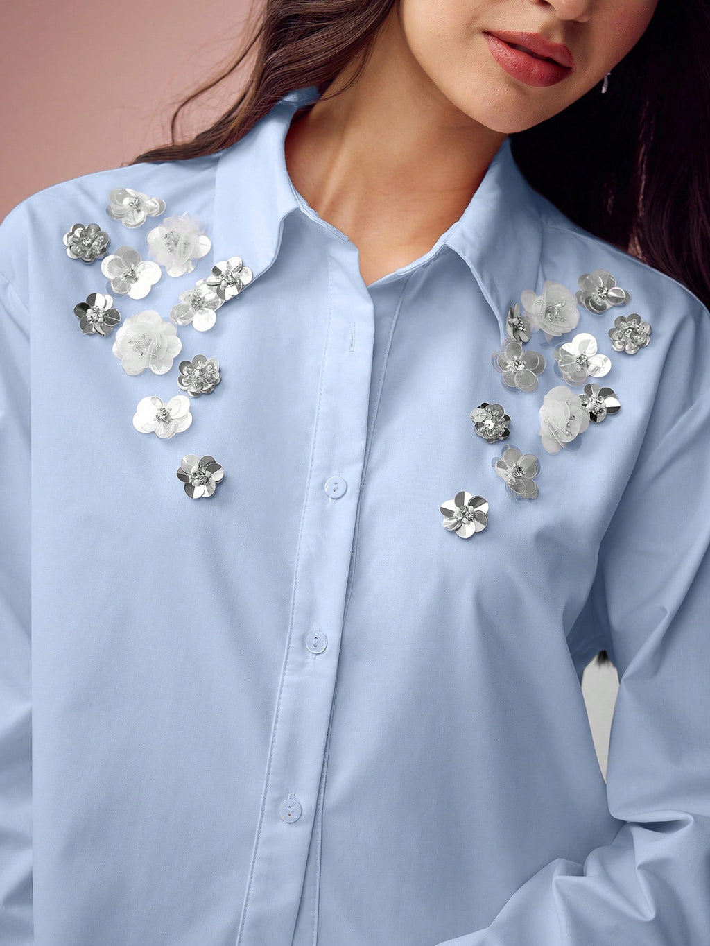 MiuVogue Spring/Summer Romantic Women's Fashionable Cute White Sparkling Sequin 3D Flower Drop Shoulder White Shirt,Sweet