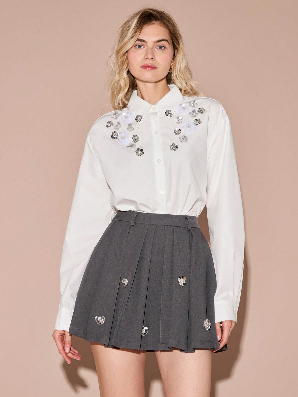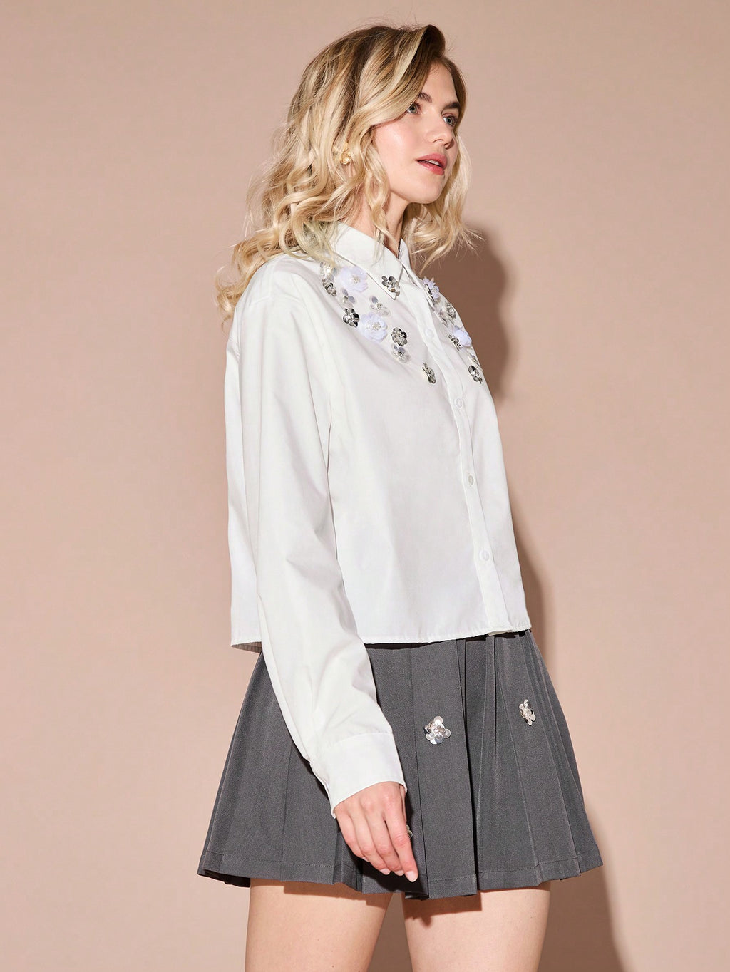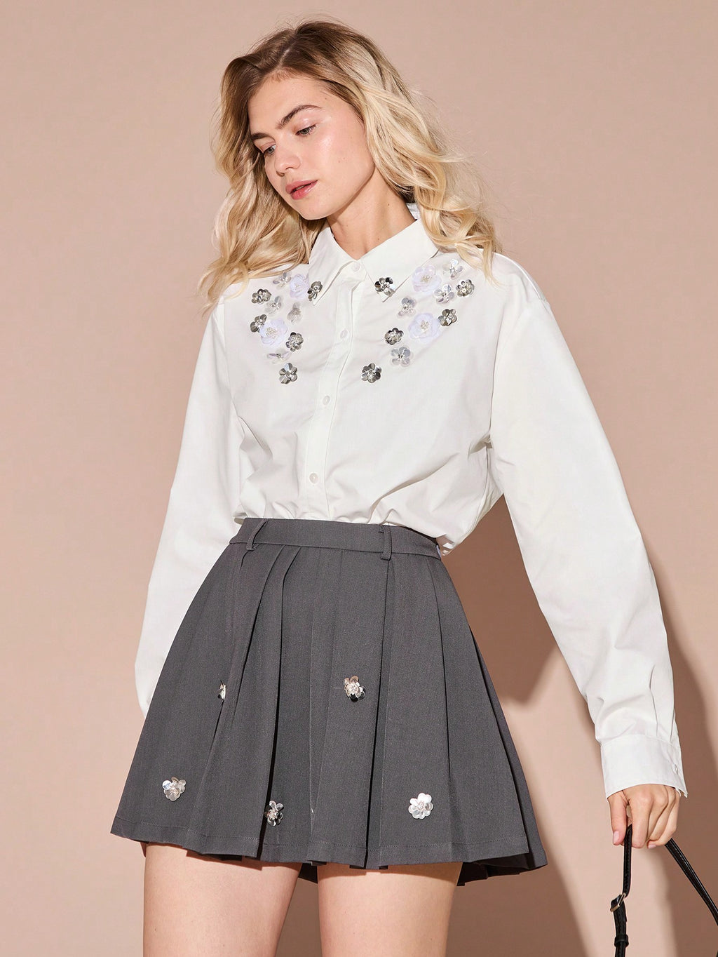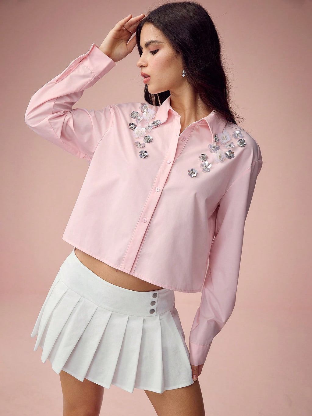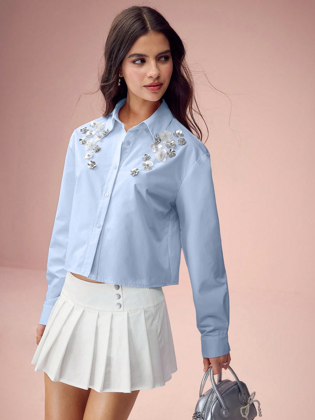 MiuVogue Spring/Summer Romantic Women's Fashionable Cute White Sparkling Sequin 3D Flower Drop Shoulder White Shirt,Sweet