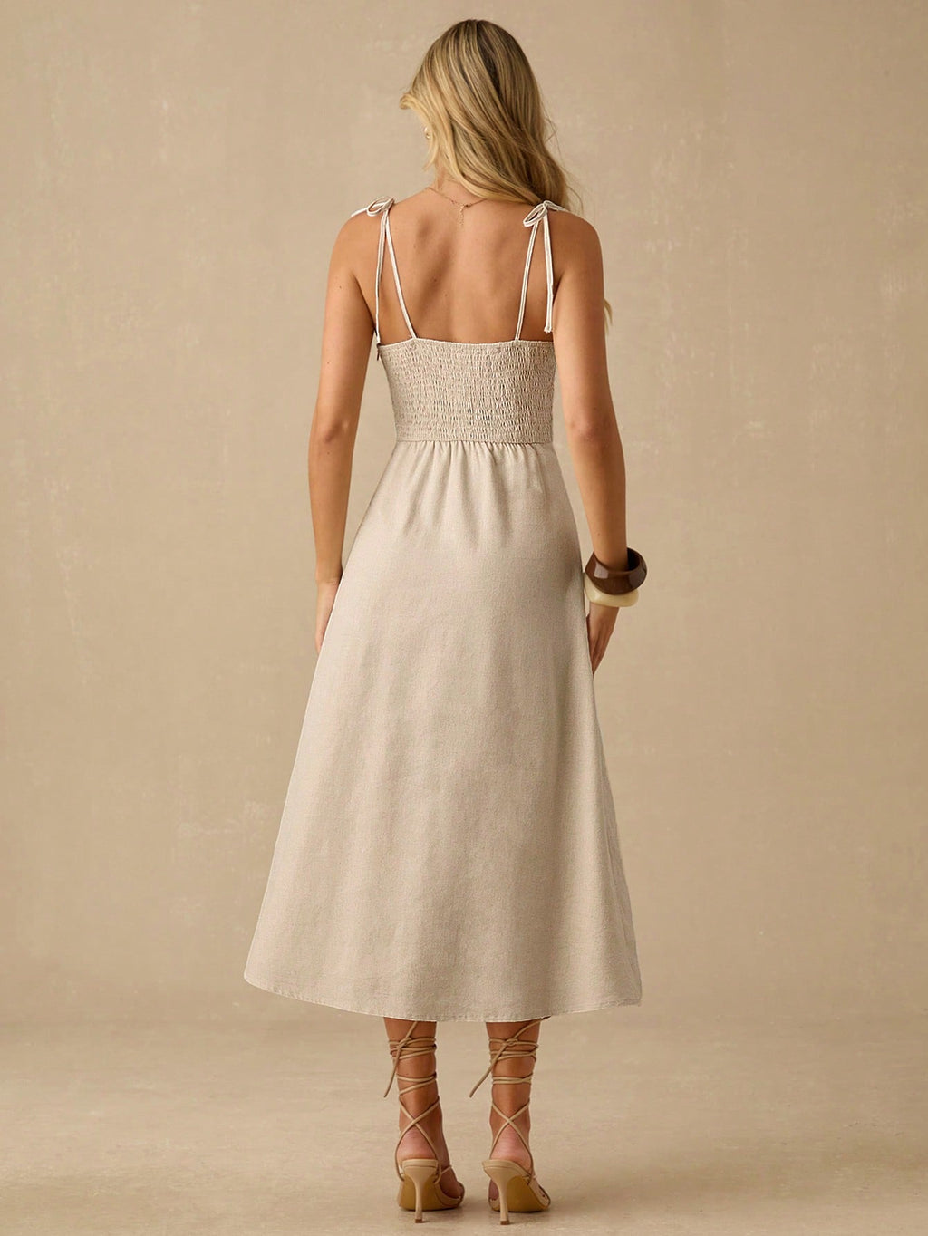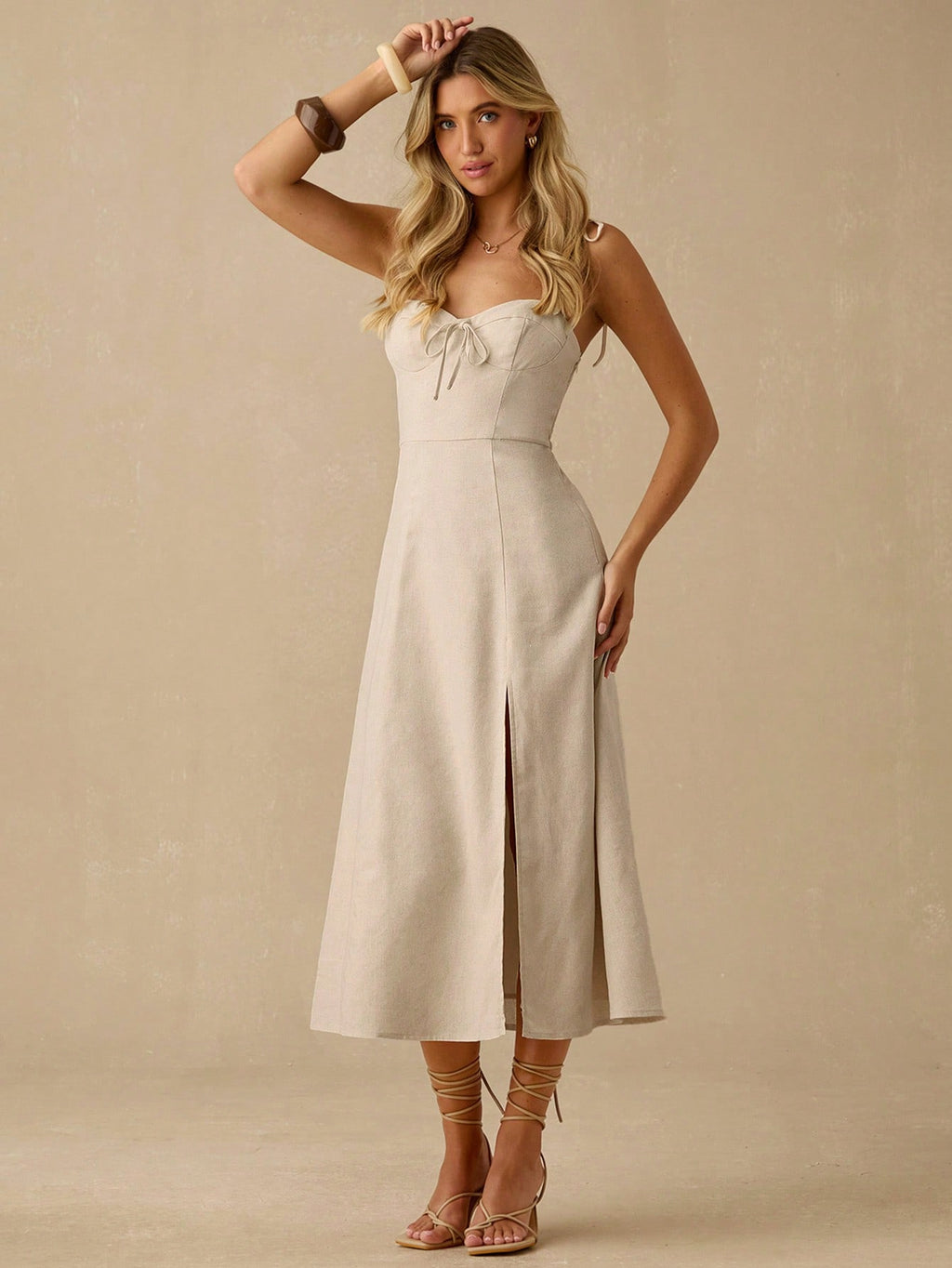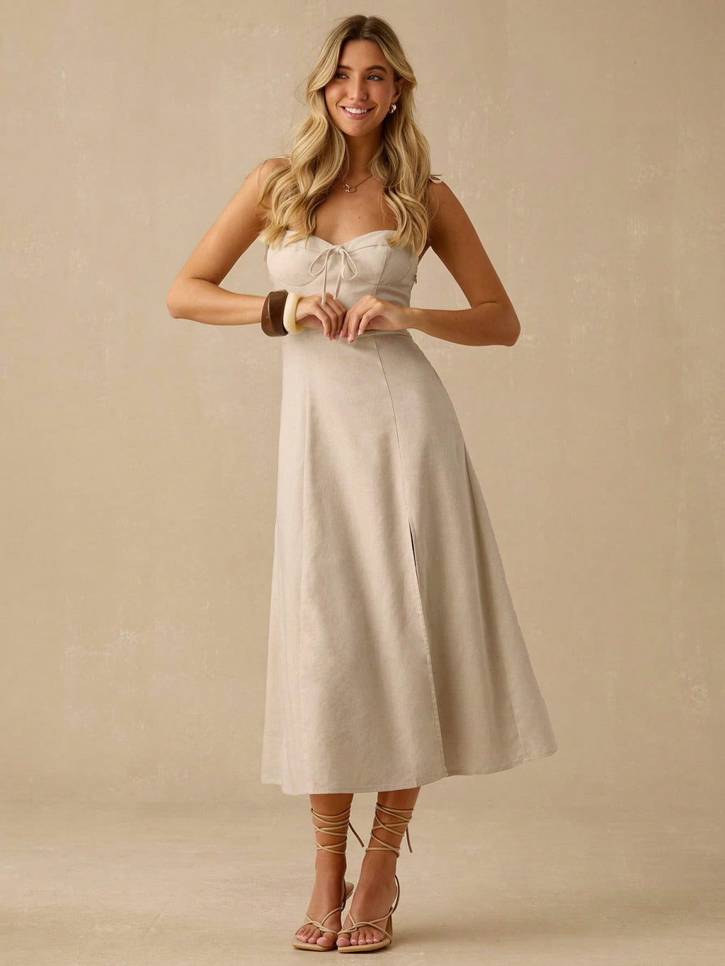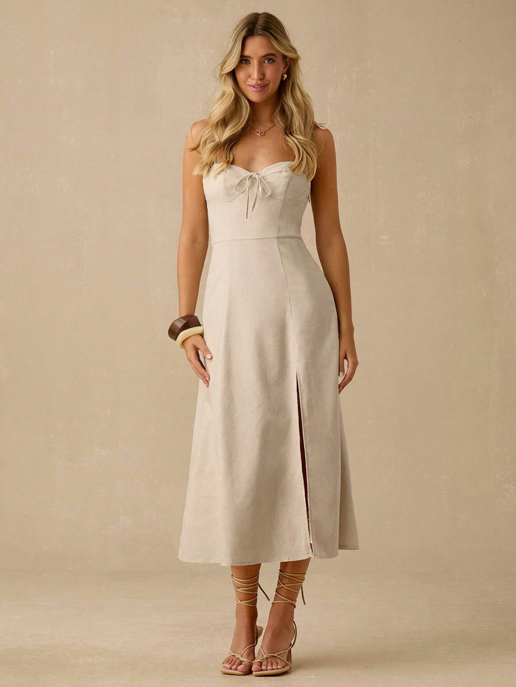 MiuVogue Spring/Summer Romantic Women's Linen Khaki Spaghetti Strap Sweetheart Neck Front Tie Side Slit Long Dress,Sweet