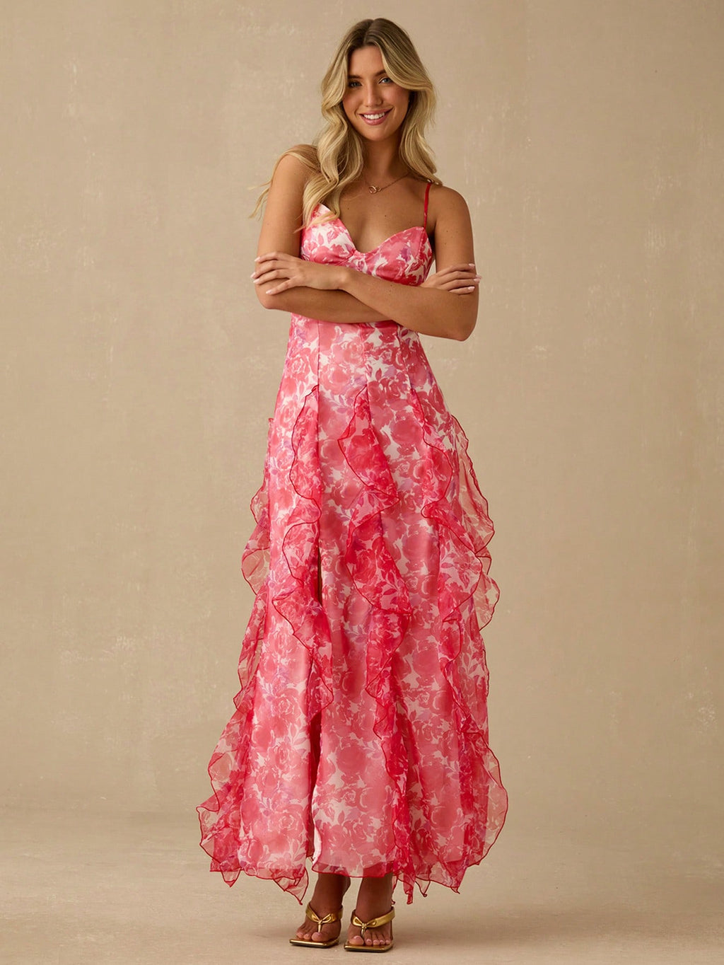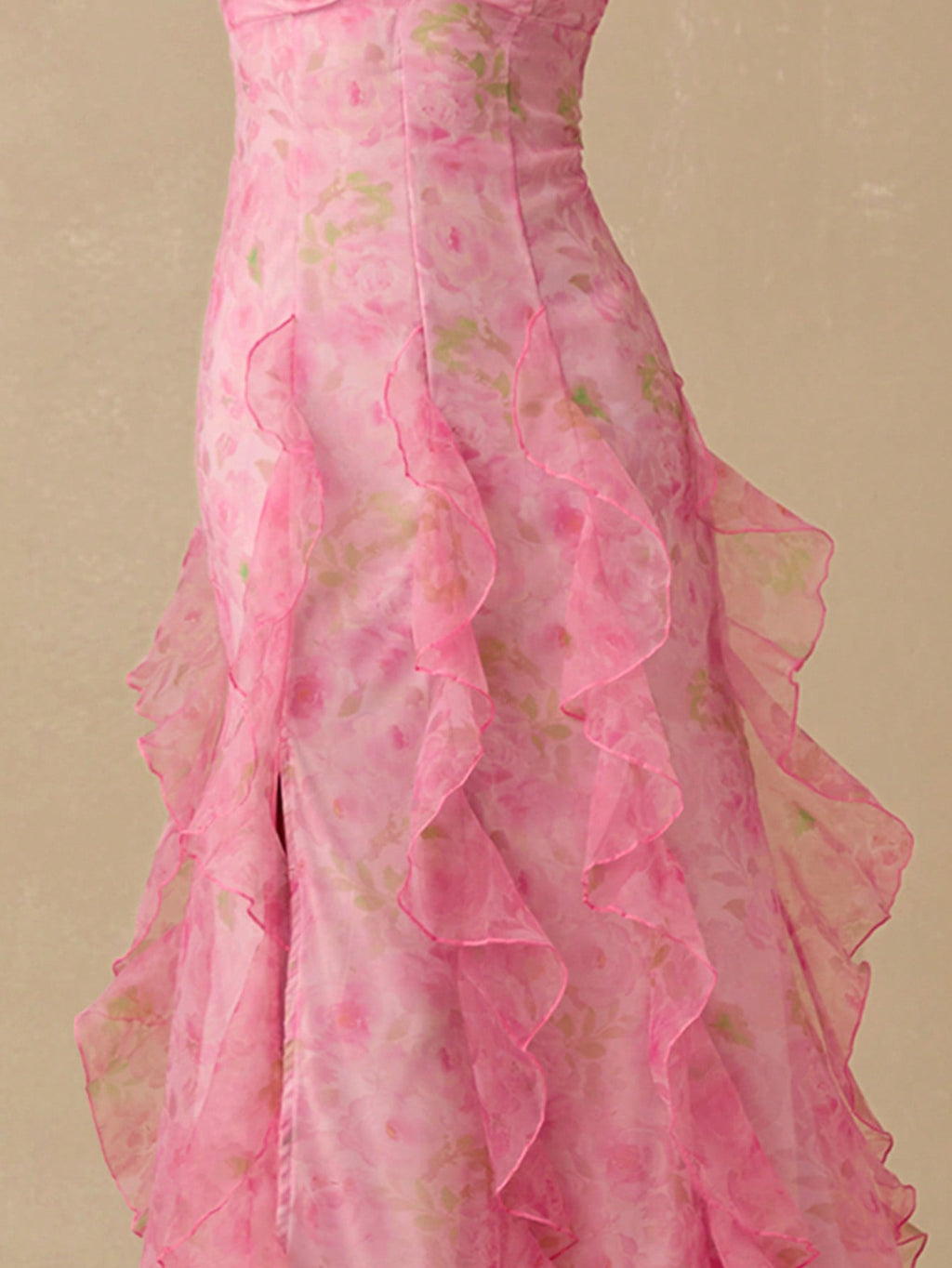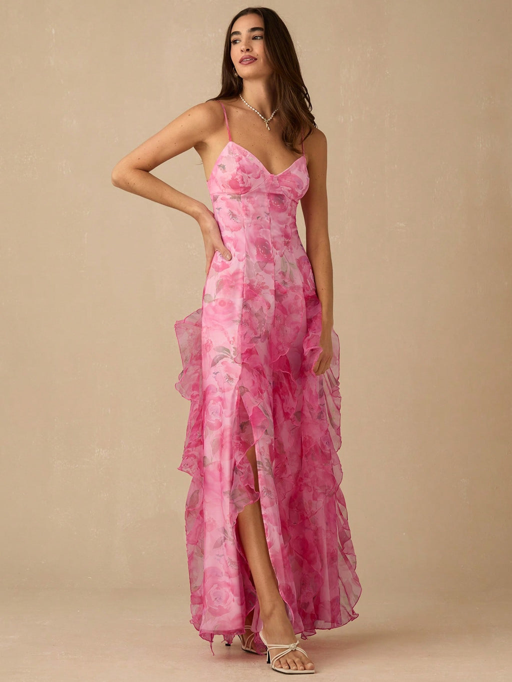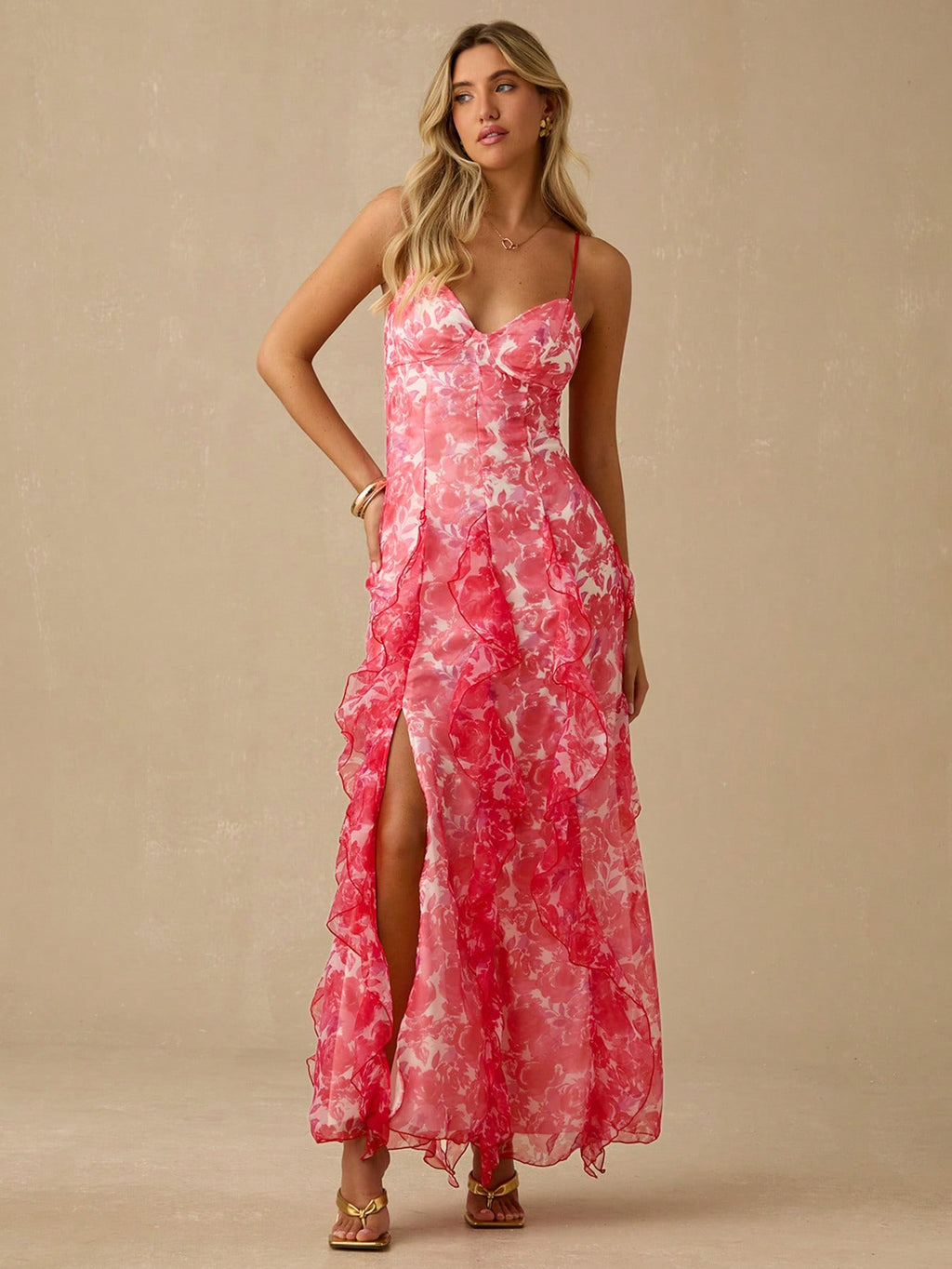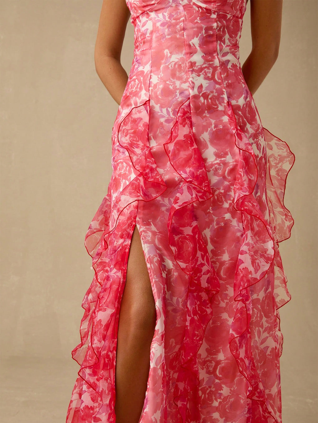 MiuVogue Spring/Summer Romantic Women's Red Floral Print Spaghetti Strap Organza Slit Dress,Sweet