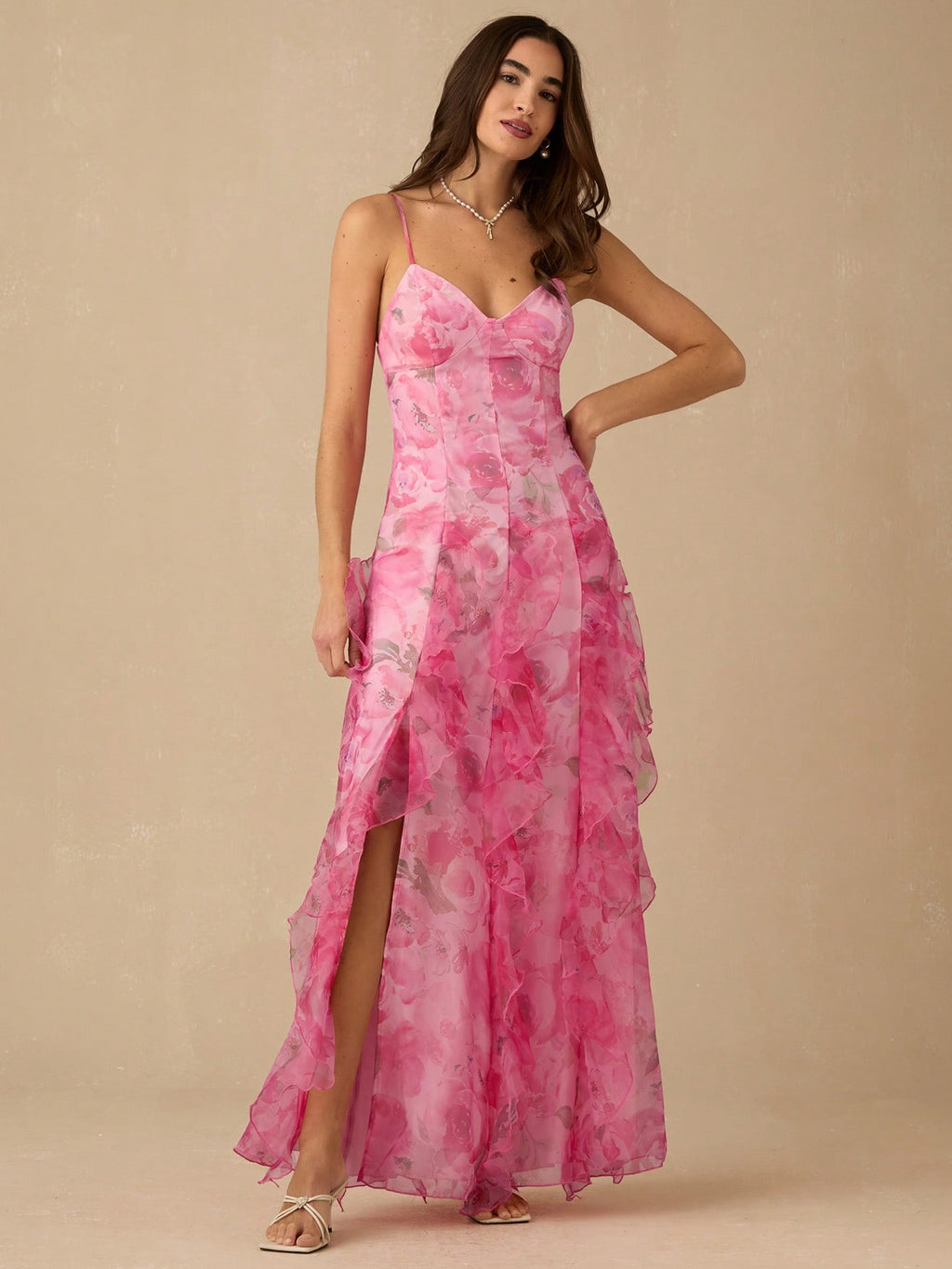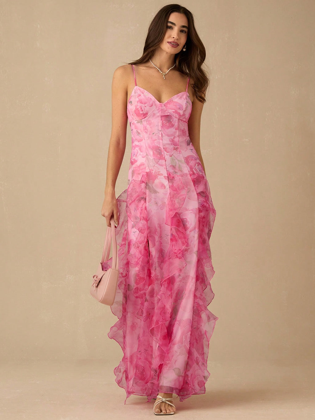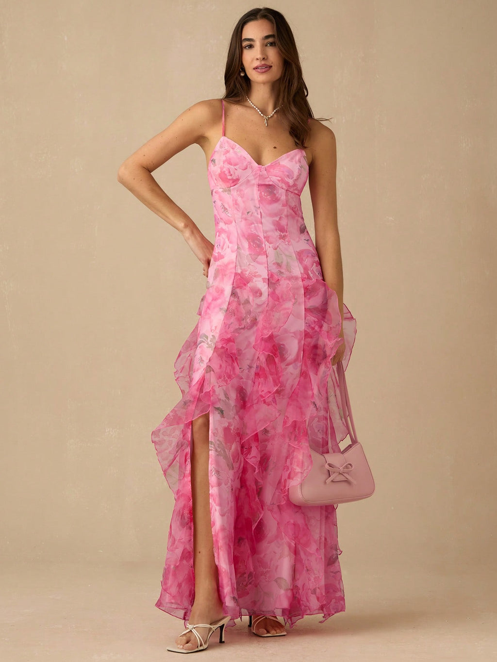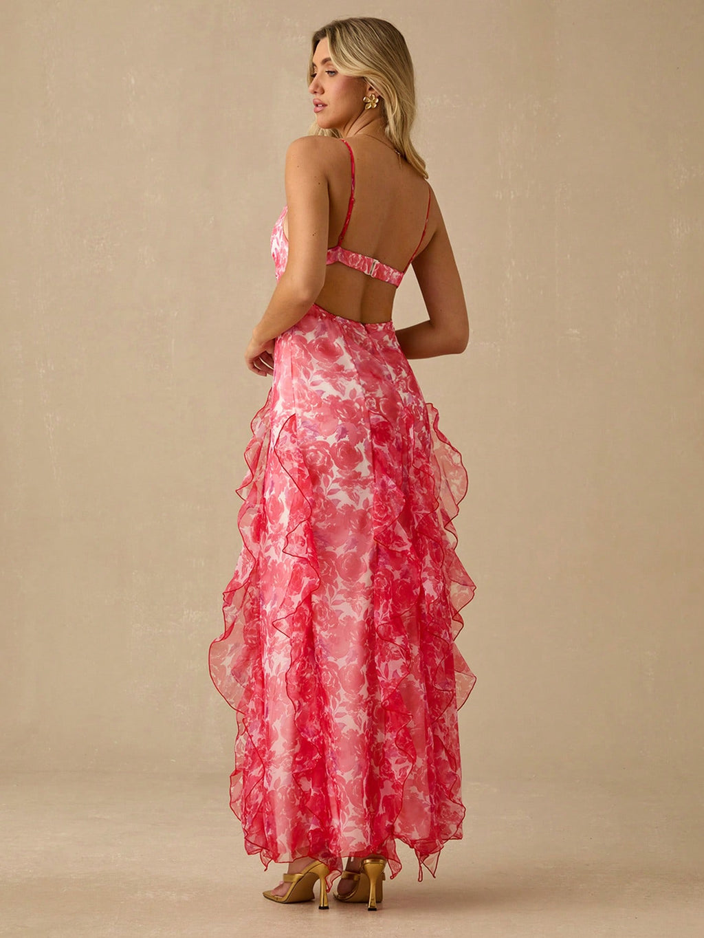 MiuVogue Spring/Summer Romantic Women's Red Floral Print Spaghetti Strap Organza Slit Dress,Sweet