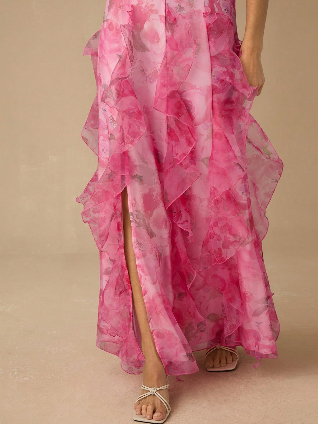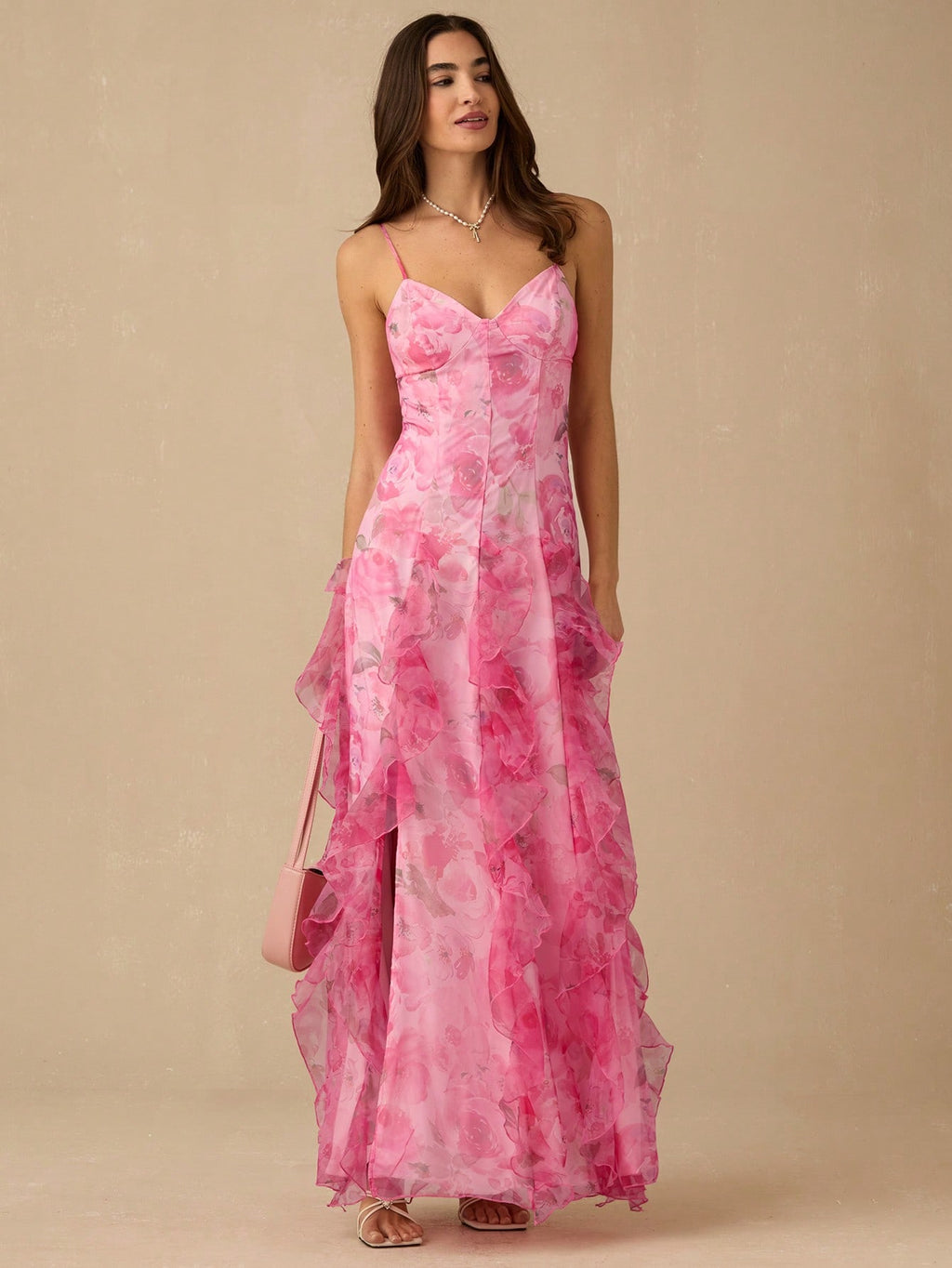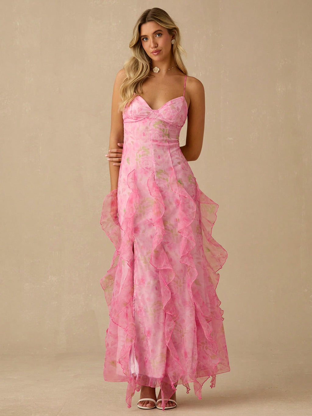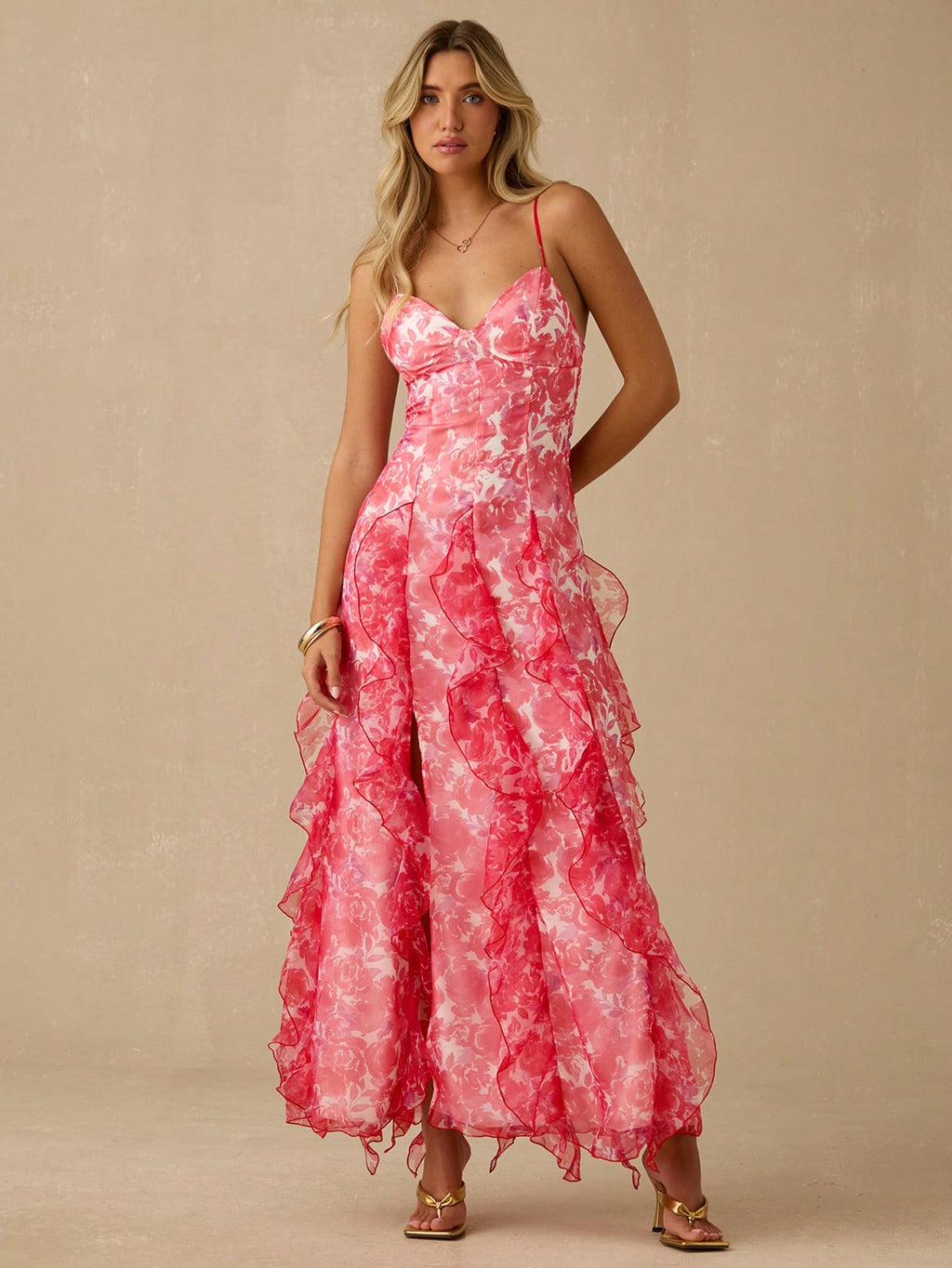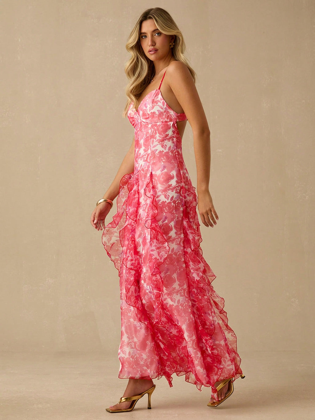 MiuVogue Spring/Summer Romantic Women's Red Floral Print Spaghetti Strap Organza Slit Dress,Sweet