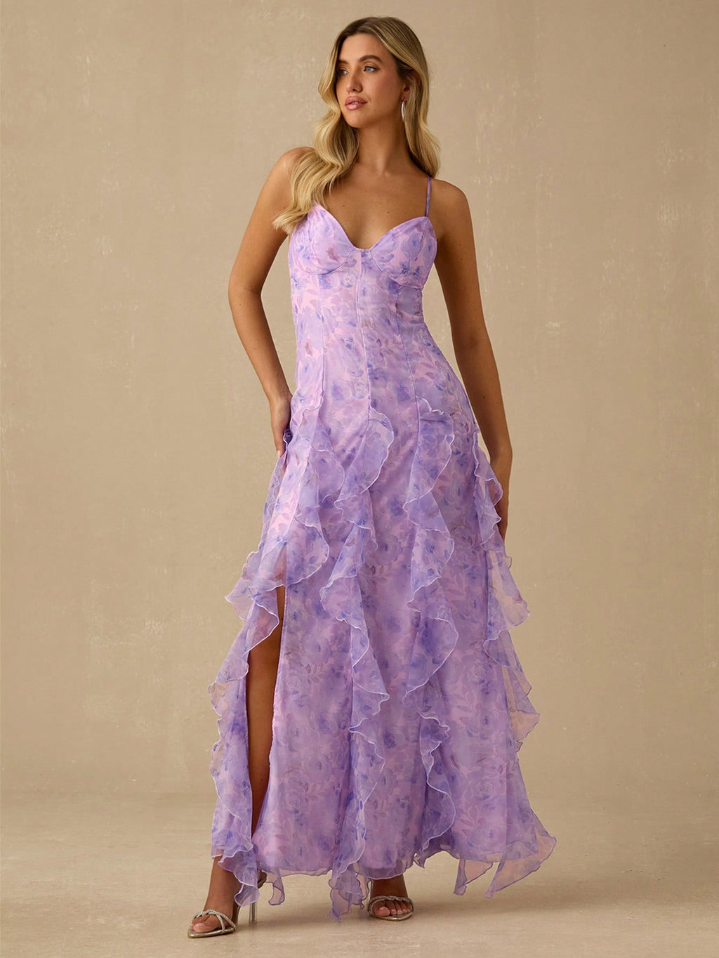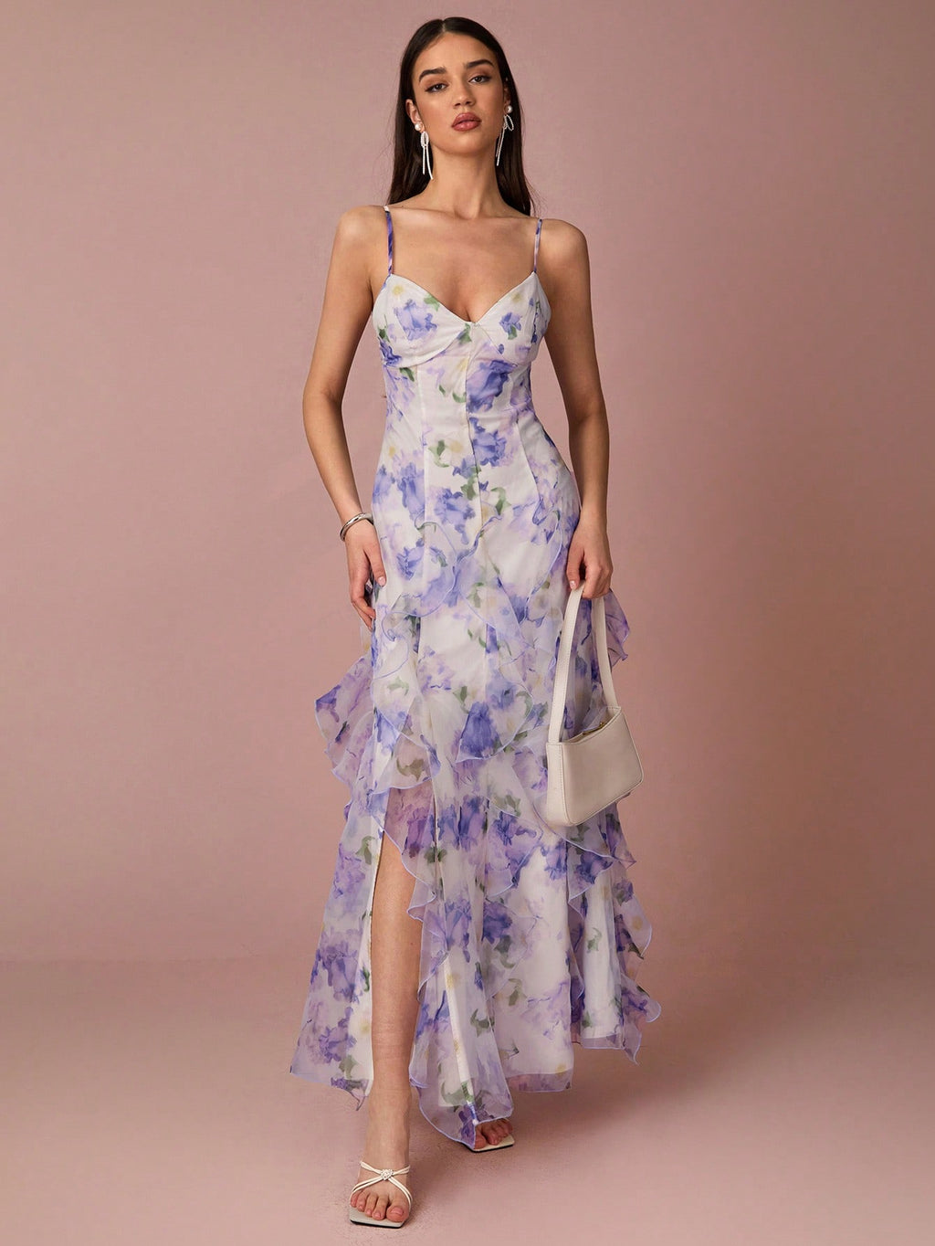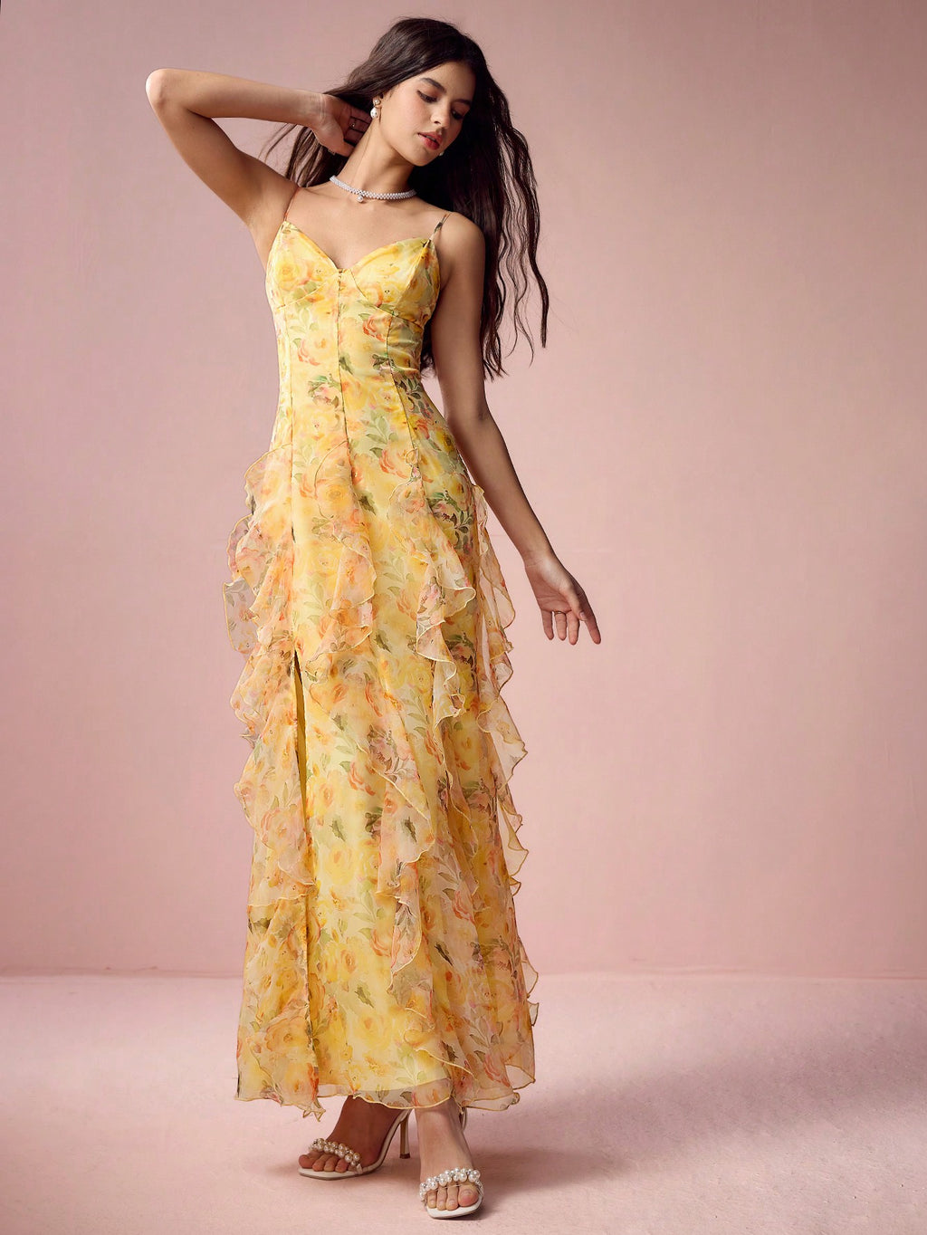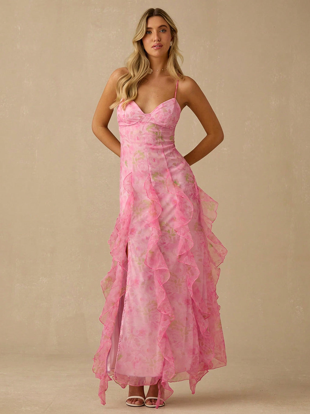 MiuVogue Spring/Summer Romantic Women's Red Floral Print Spaghetti Strap Organza Slit Dress,Sweet