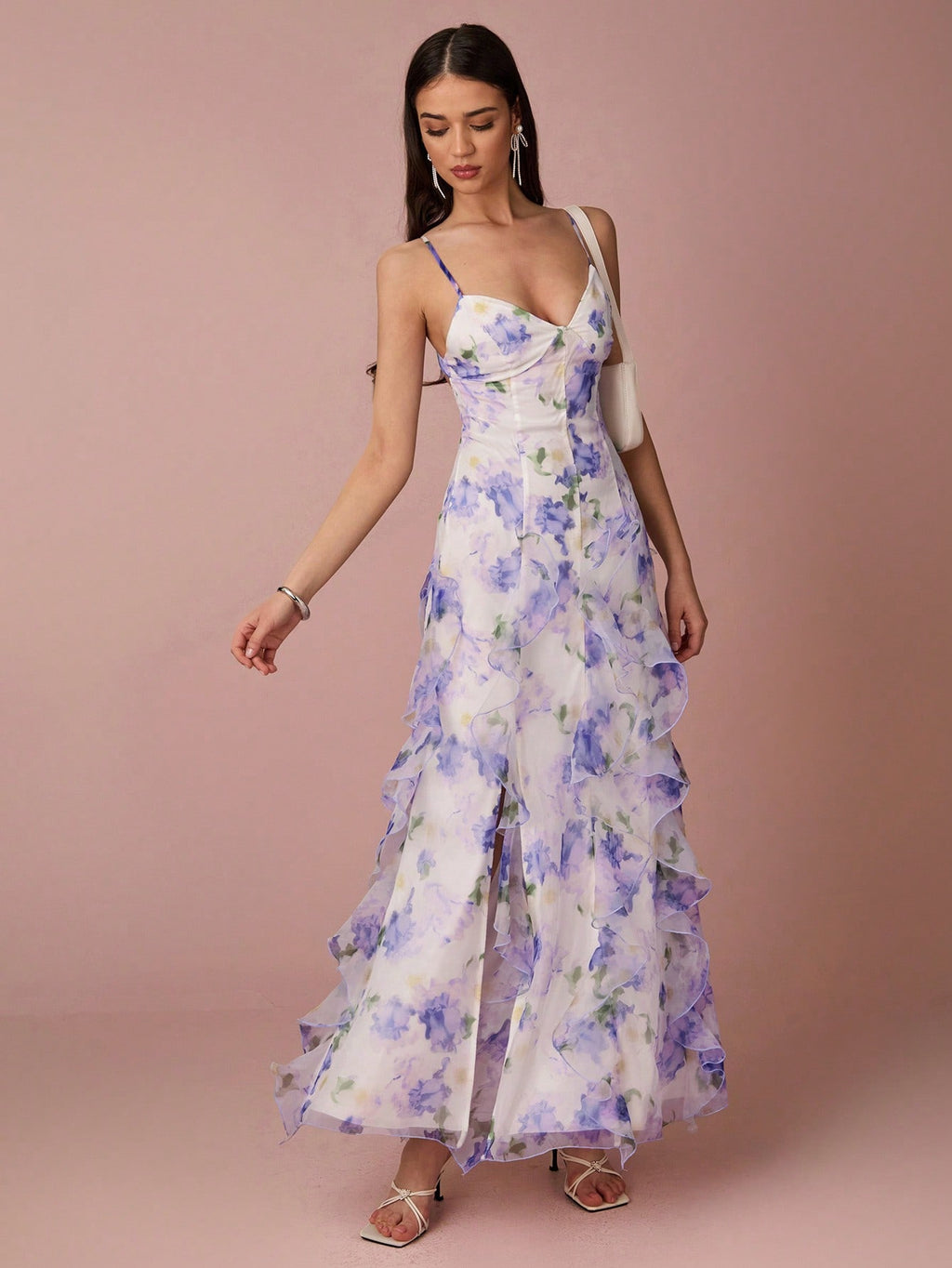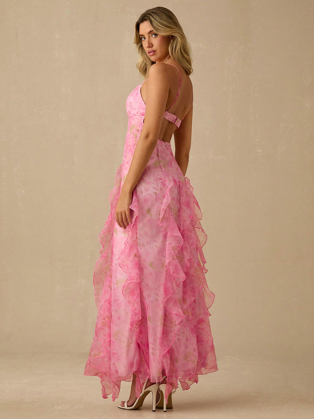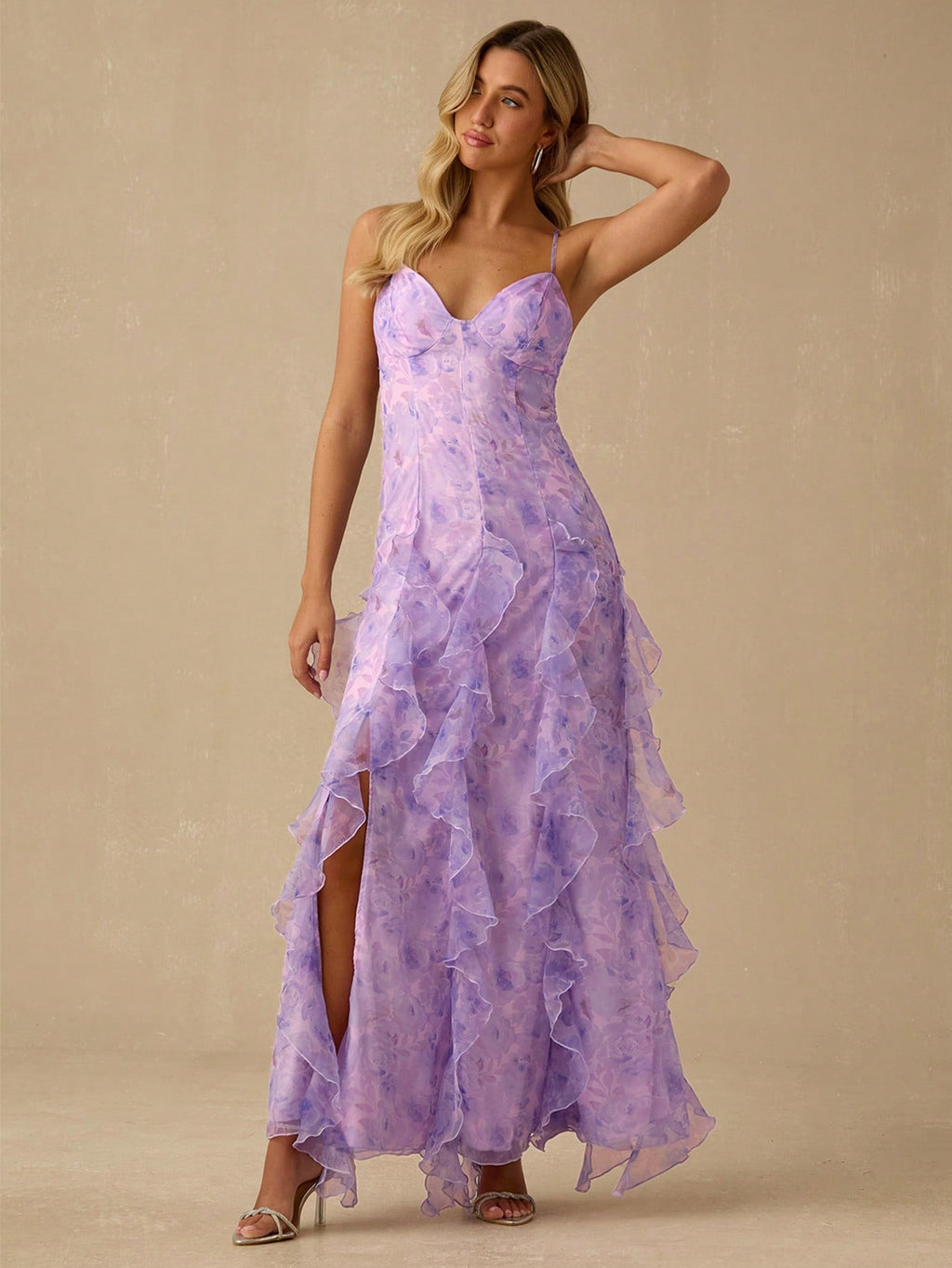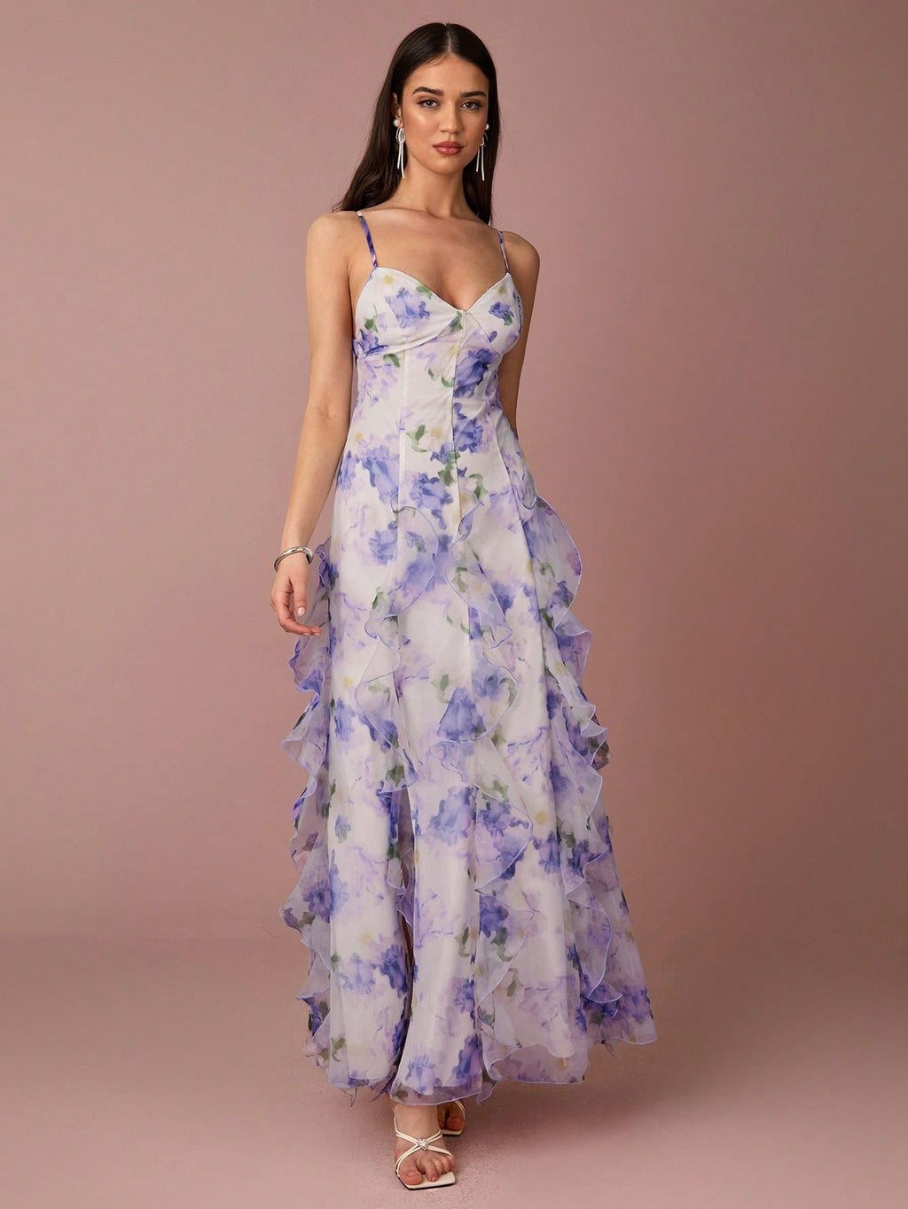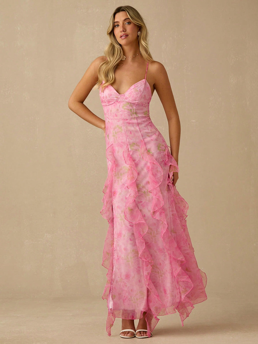 MiuVogue Spring/Summer Romantic Women's Red Floral Print Spaghetti Strap Organza Slit Dress,Sweet