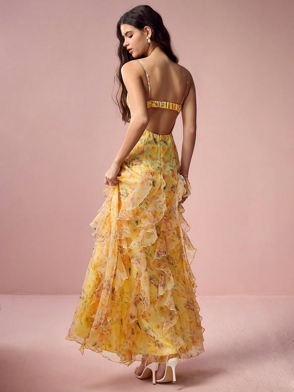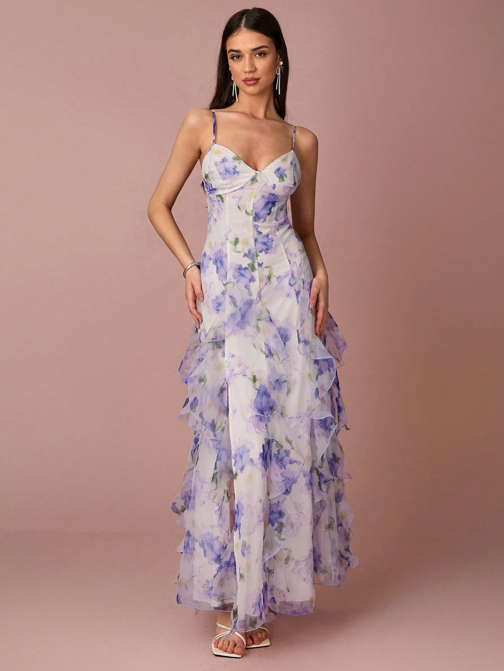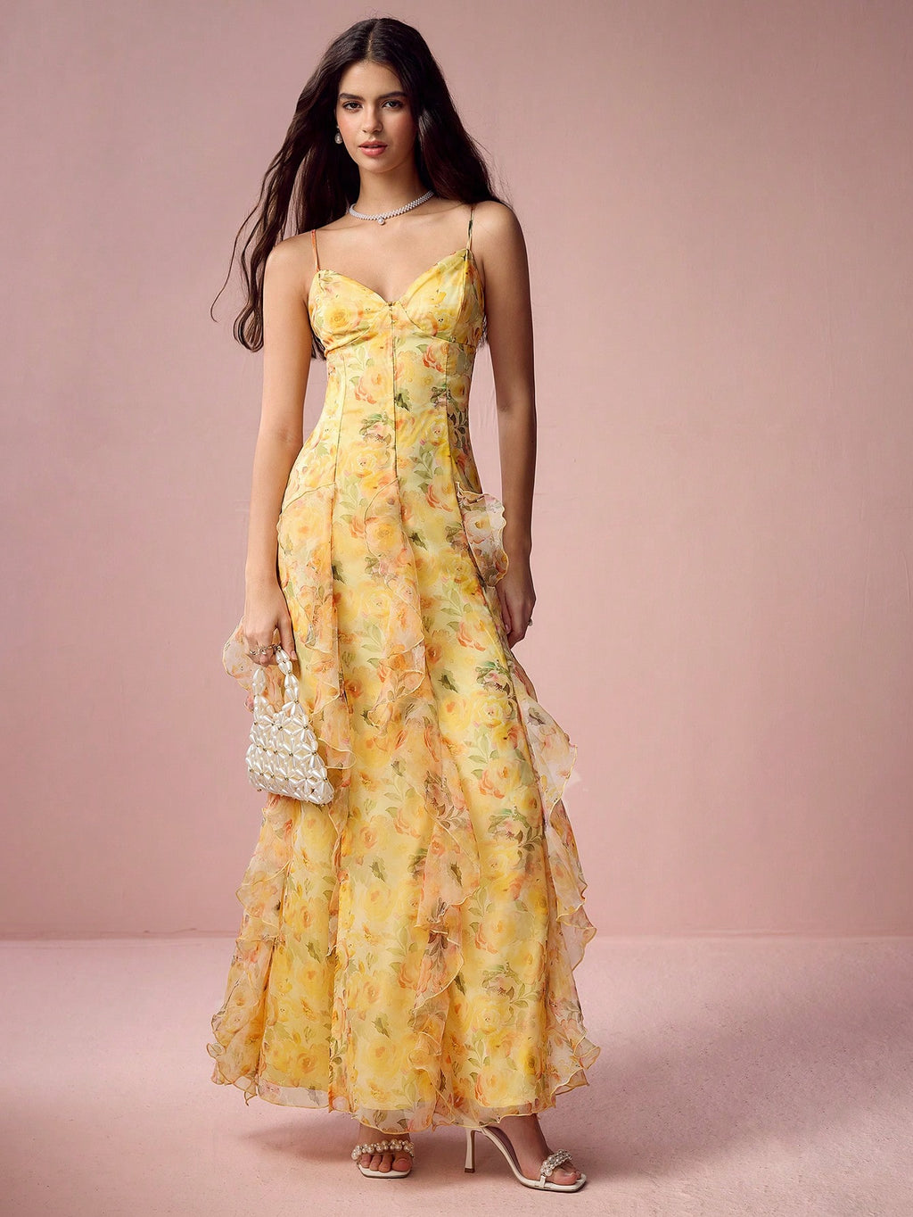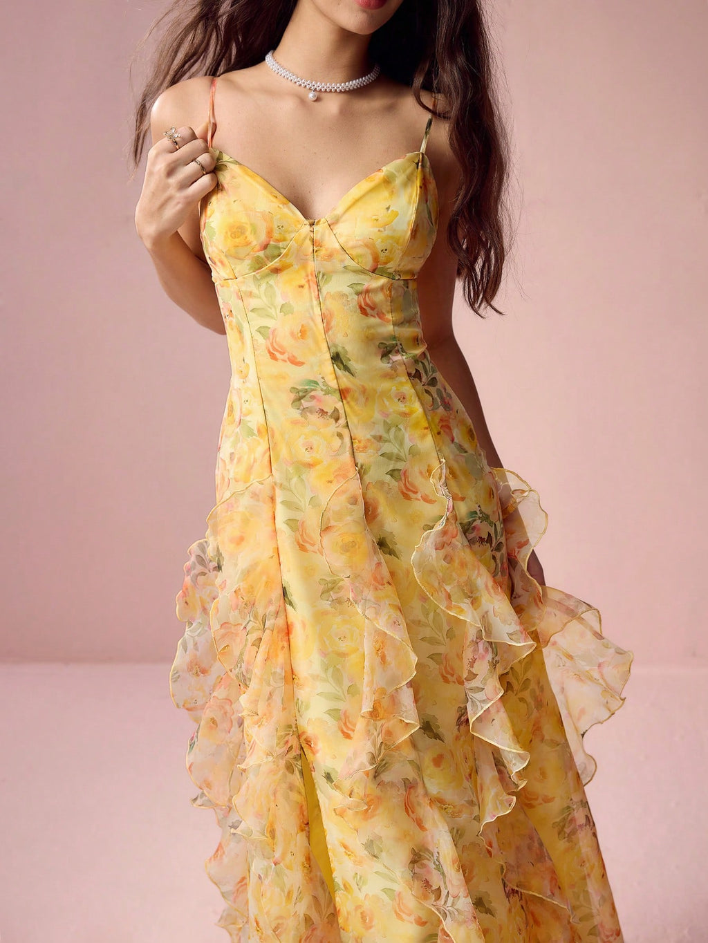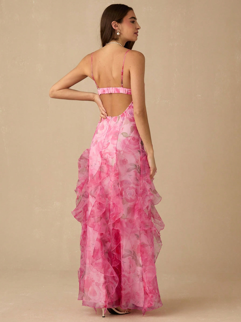 MiuVogue Spring/Summer Romantic Women's Red Floral Print Spaghetti Strap Organza Slit Dress,Sweet