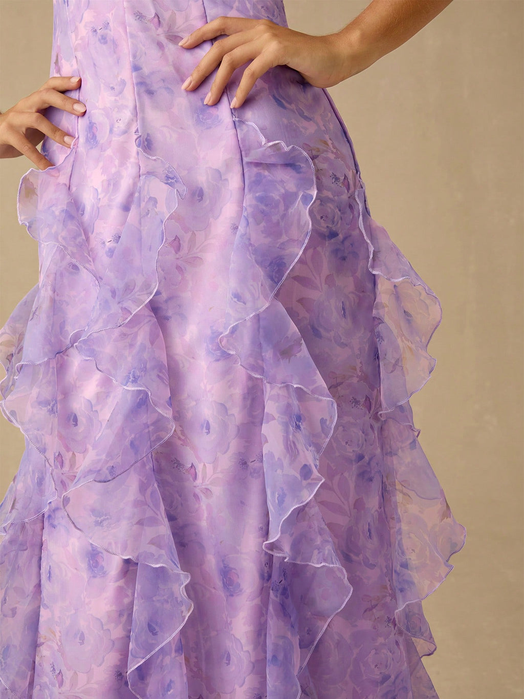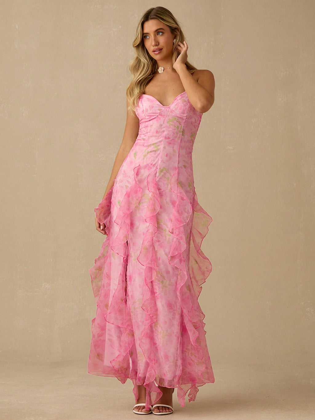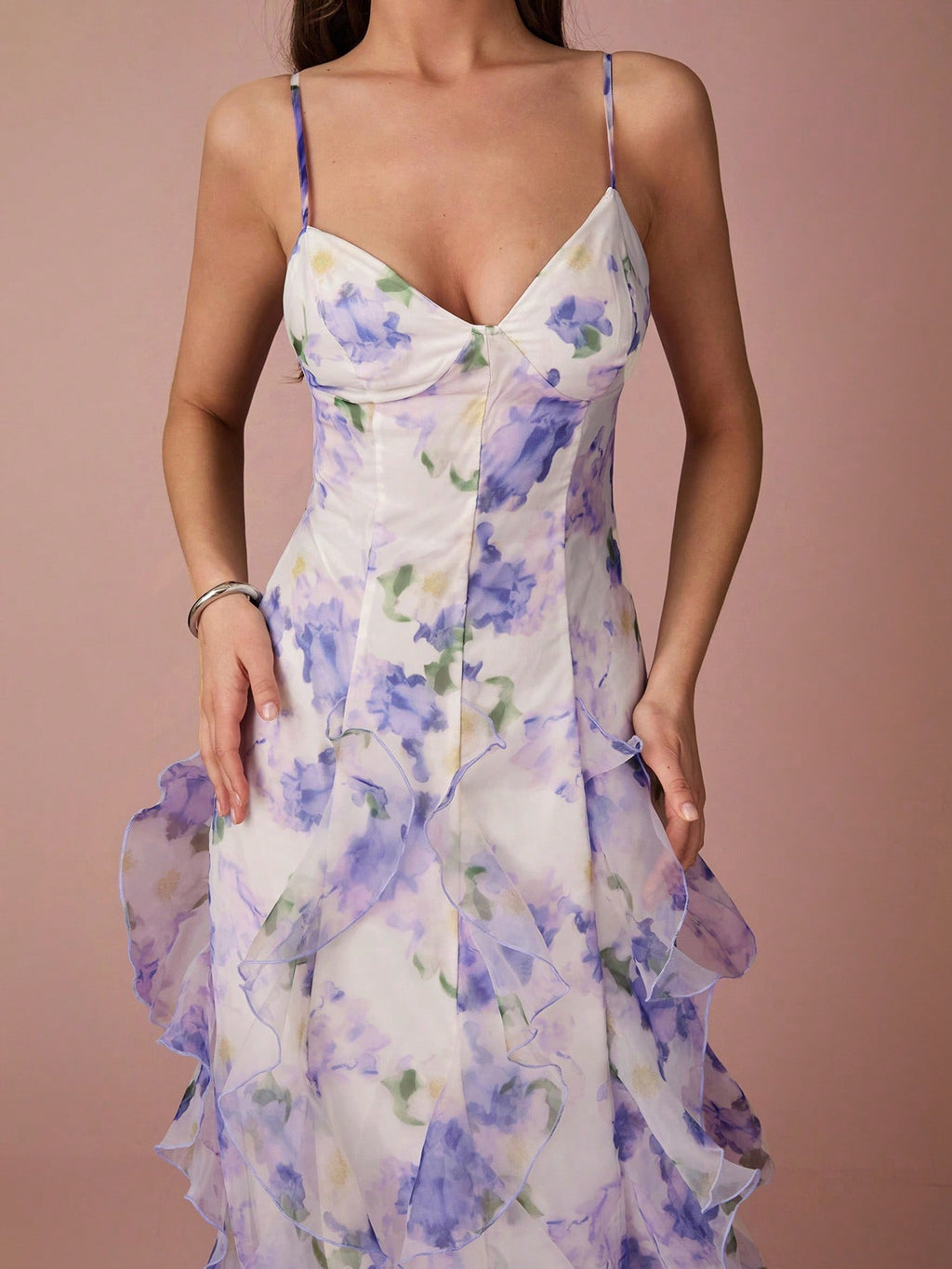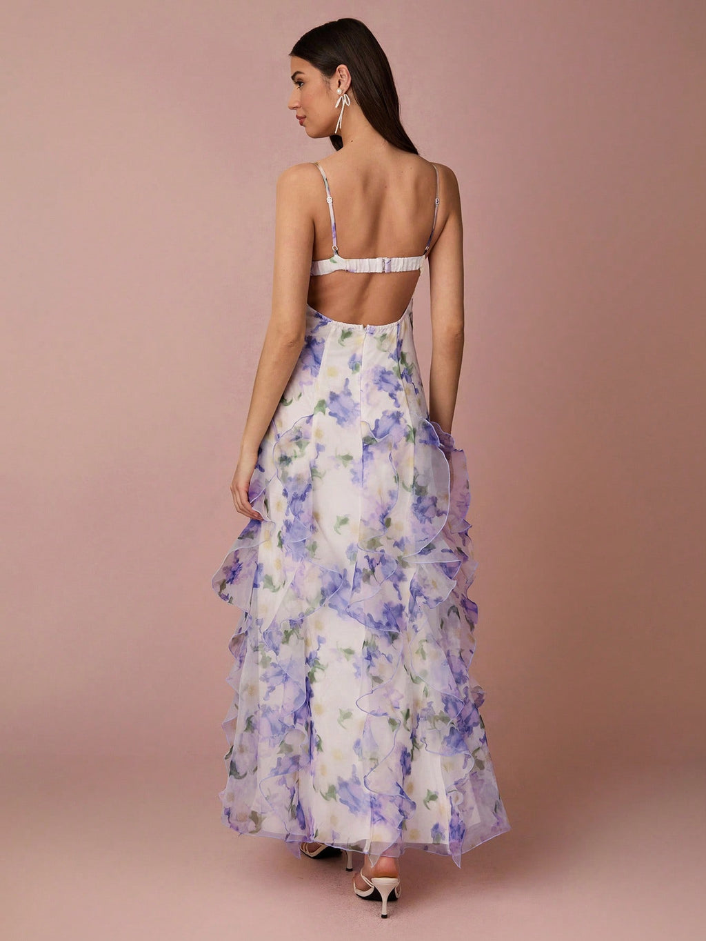 MiuVogue Spring/Summer Romantic Women's Red Floral Print Spaghetti Strap Organza Slit Dress,Sweet