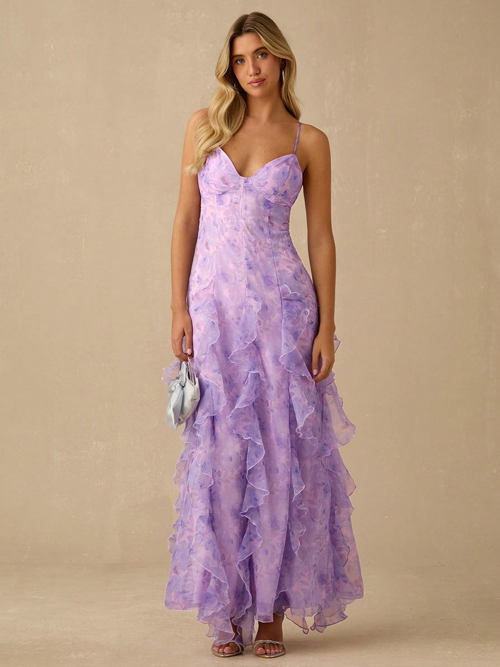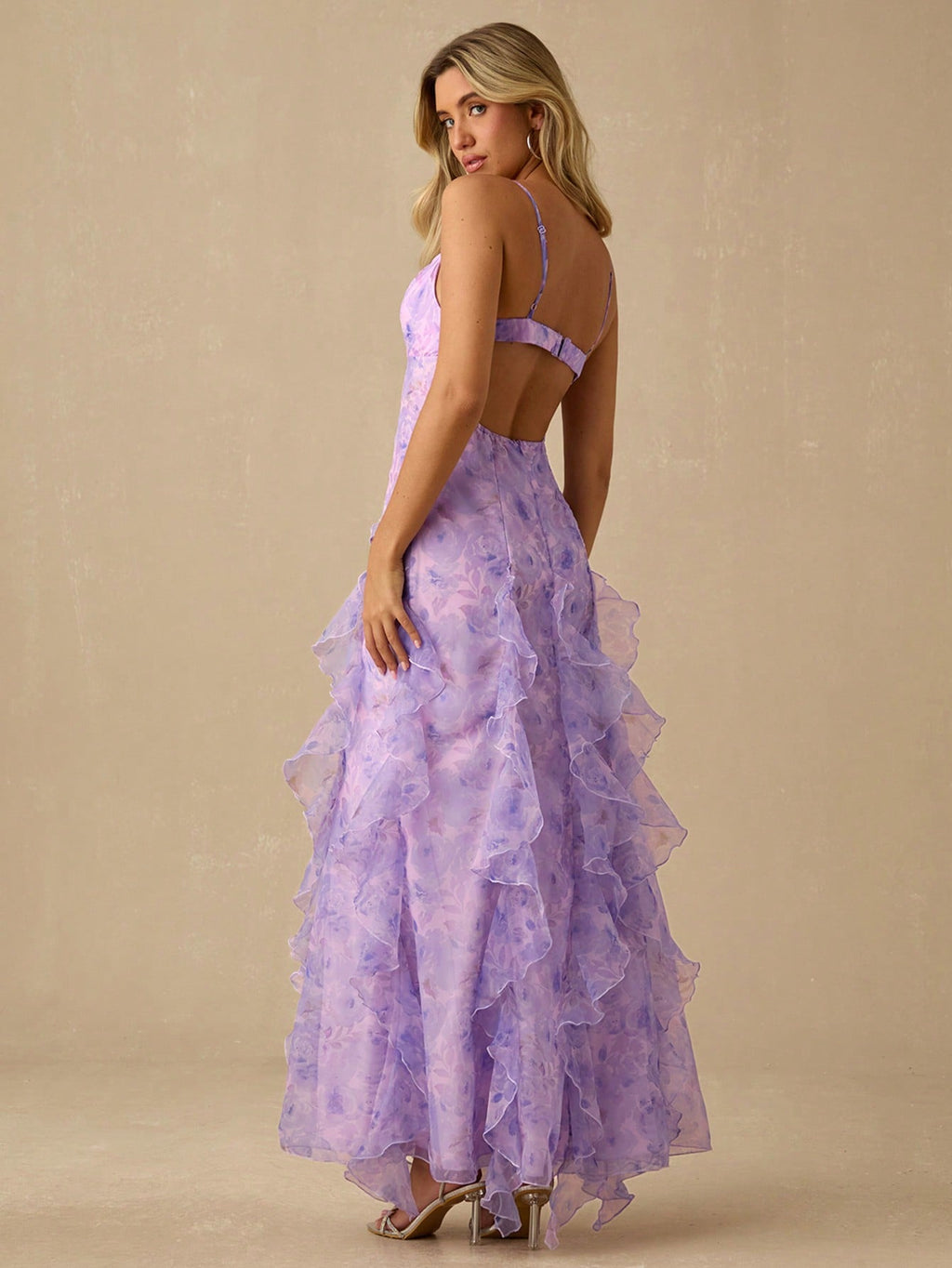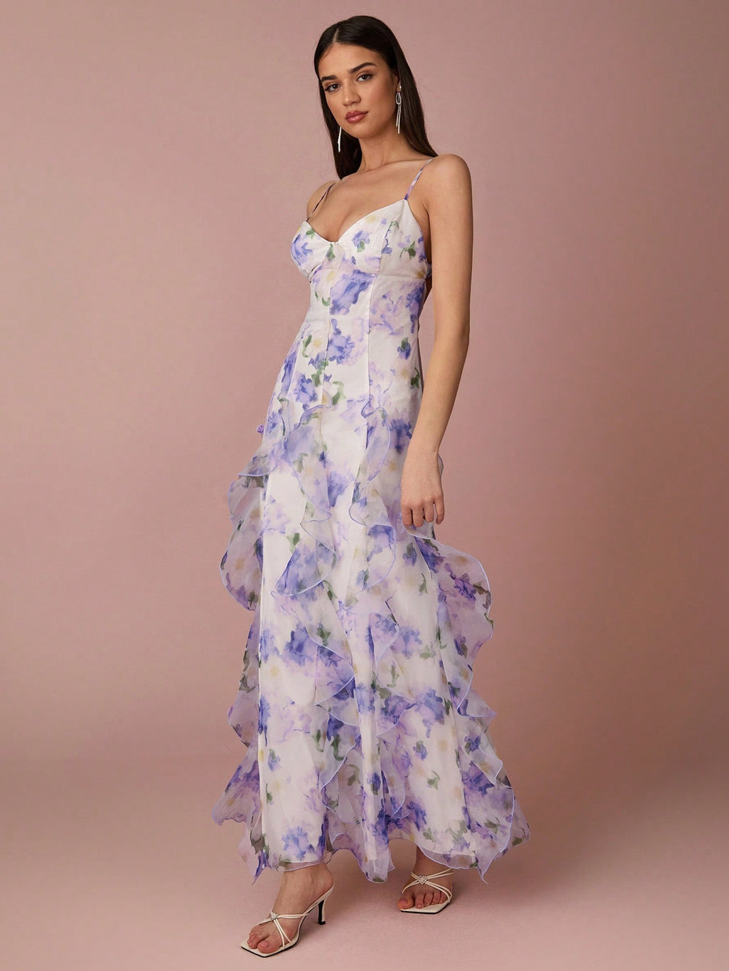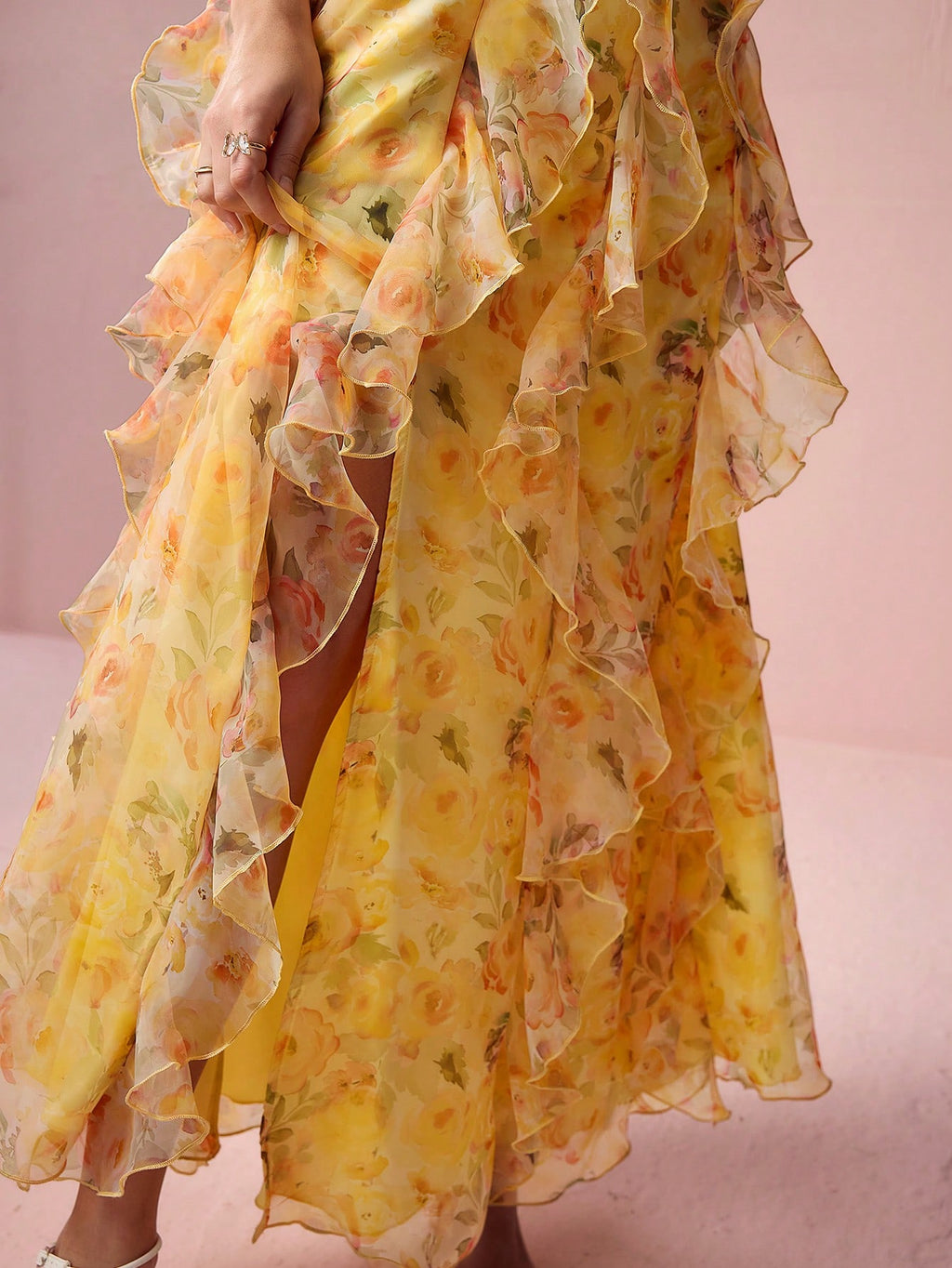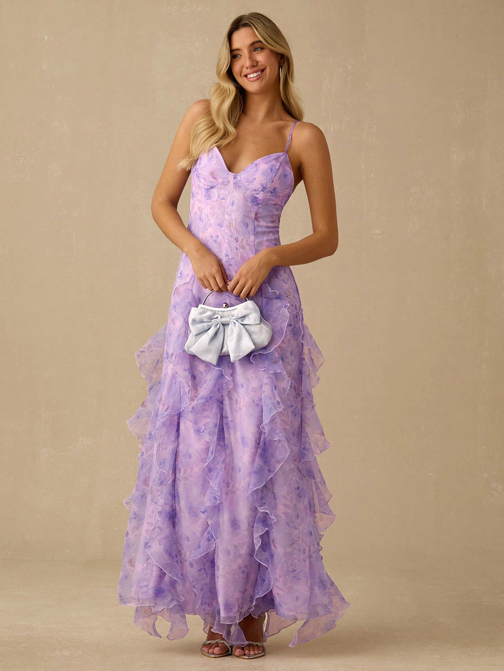 MiuVogue Spring/Summer Romantic Women's Red Floral Print Spaghetti Strap Organza Slit Dress,Sweet