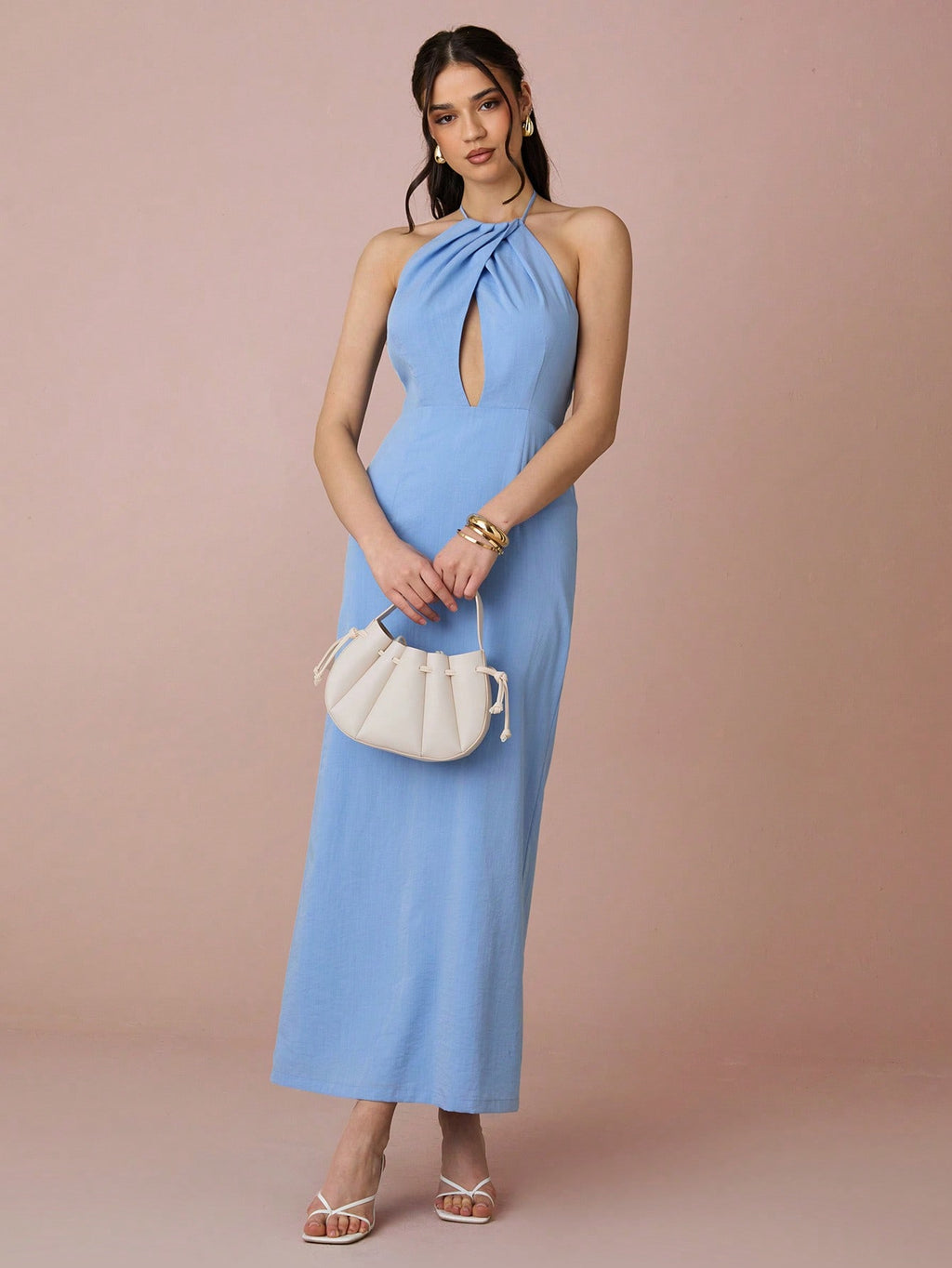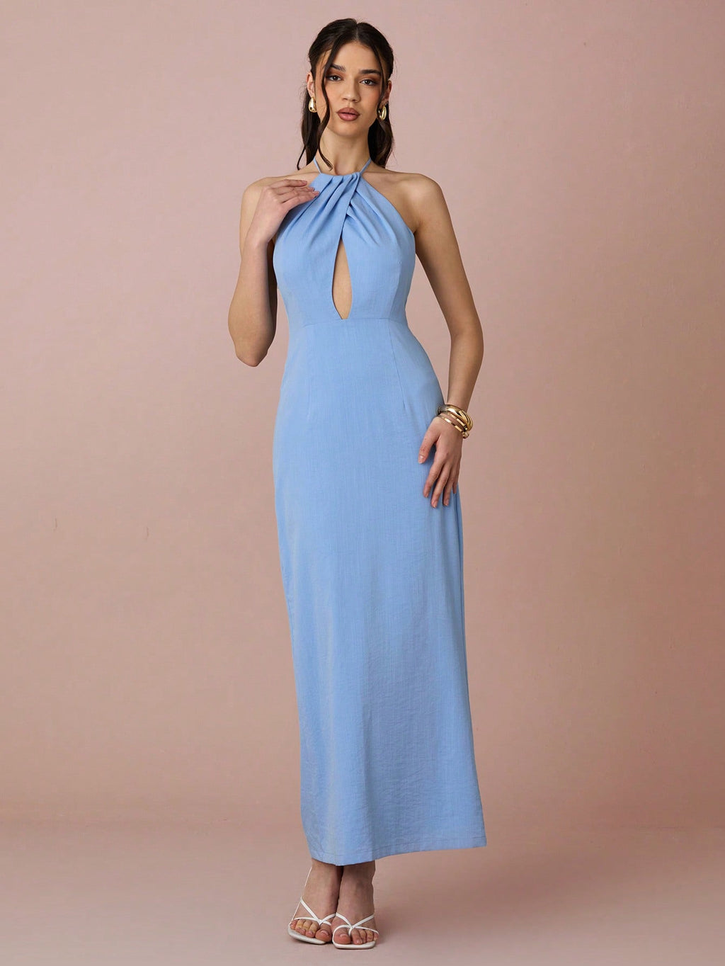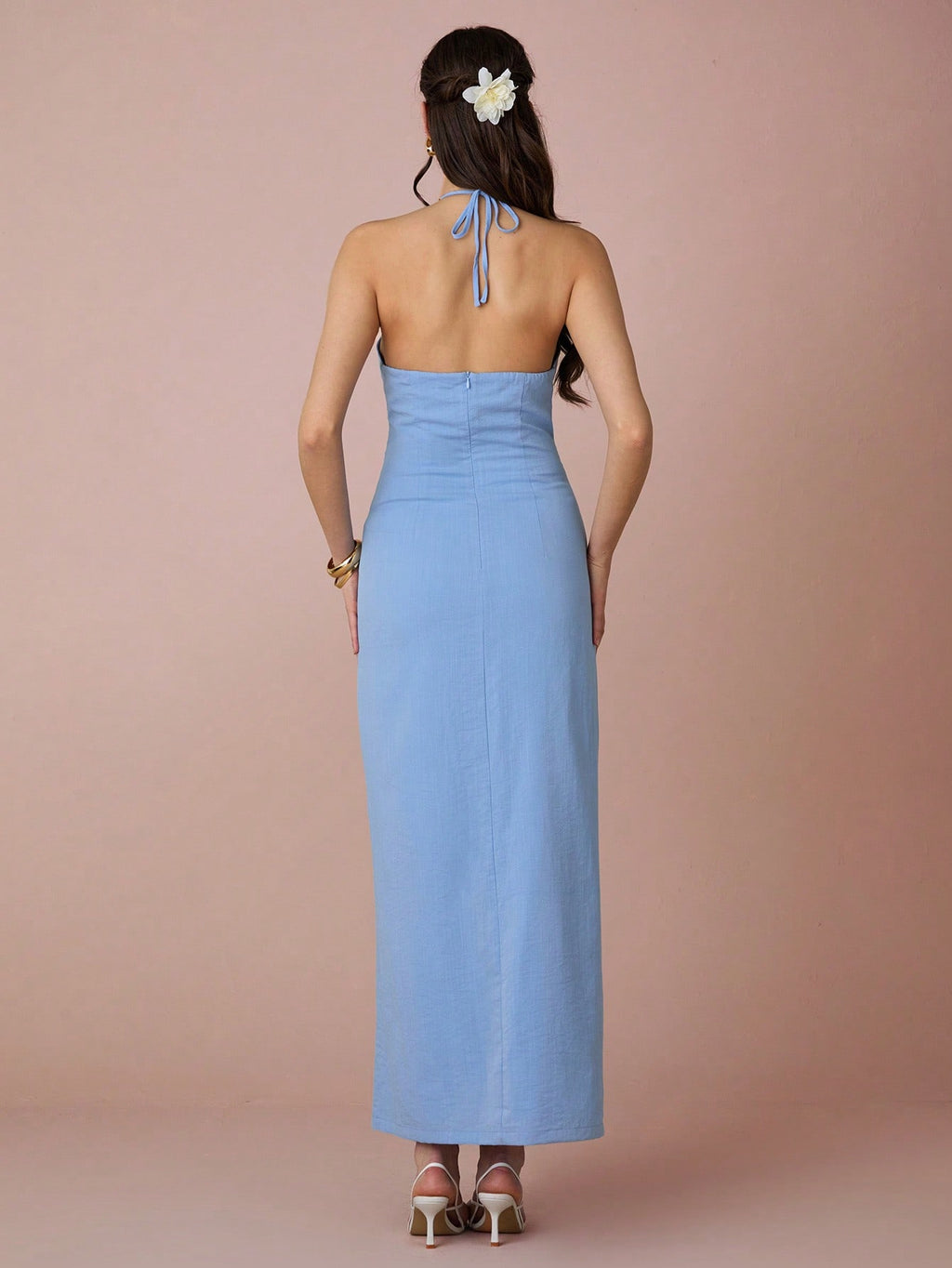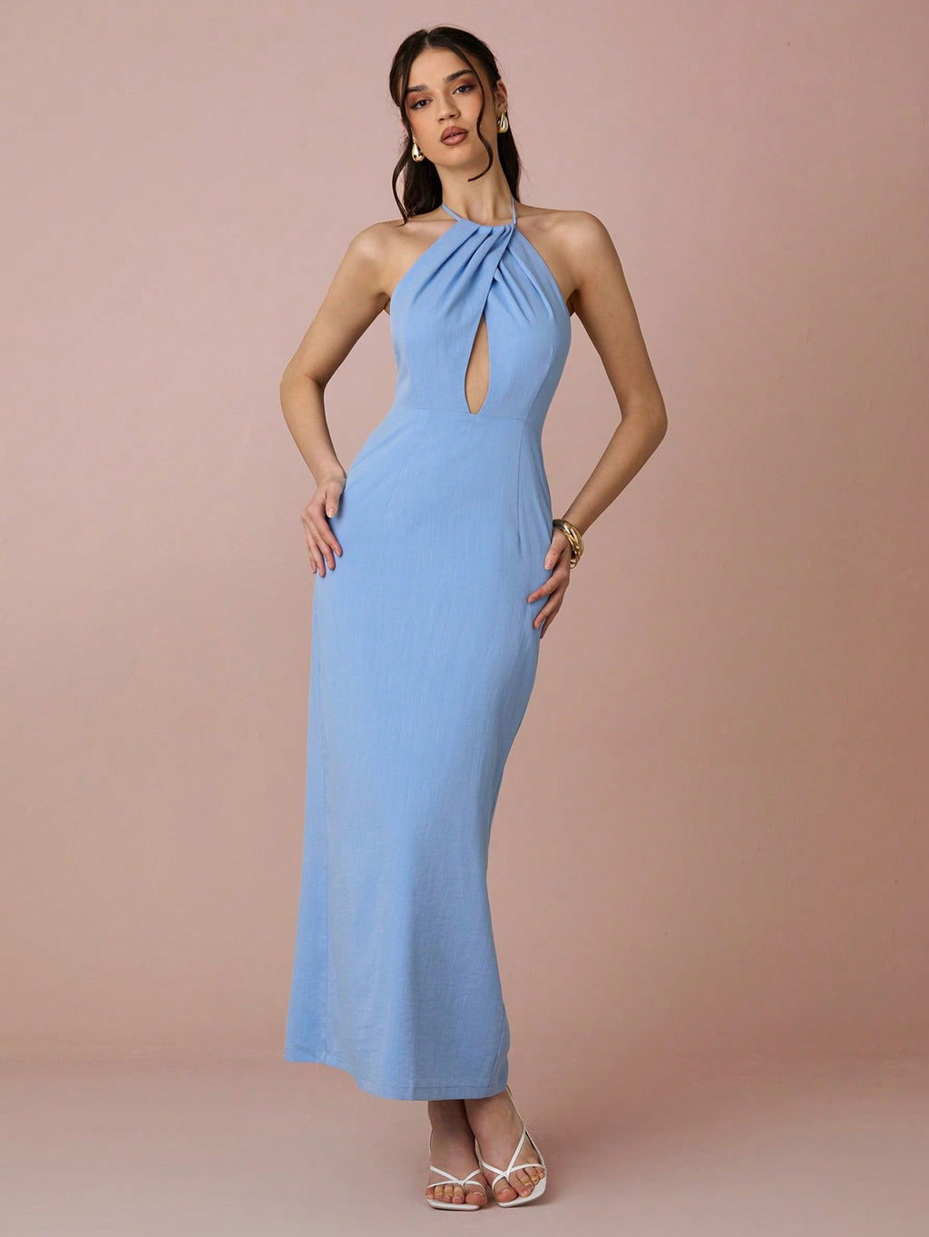 MiuVogue Spring/Summer Romantic Women's Sky Blue Hollow Out Sleeveless Backless Halter Neck Linen Maxi Dress,Sweet