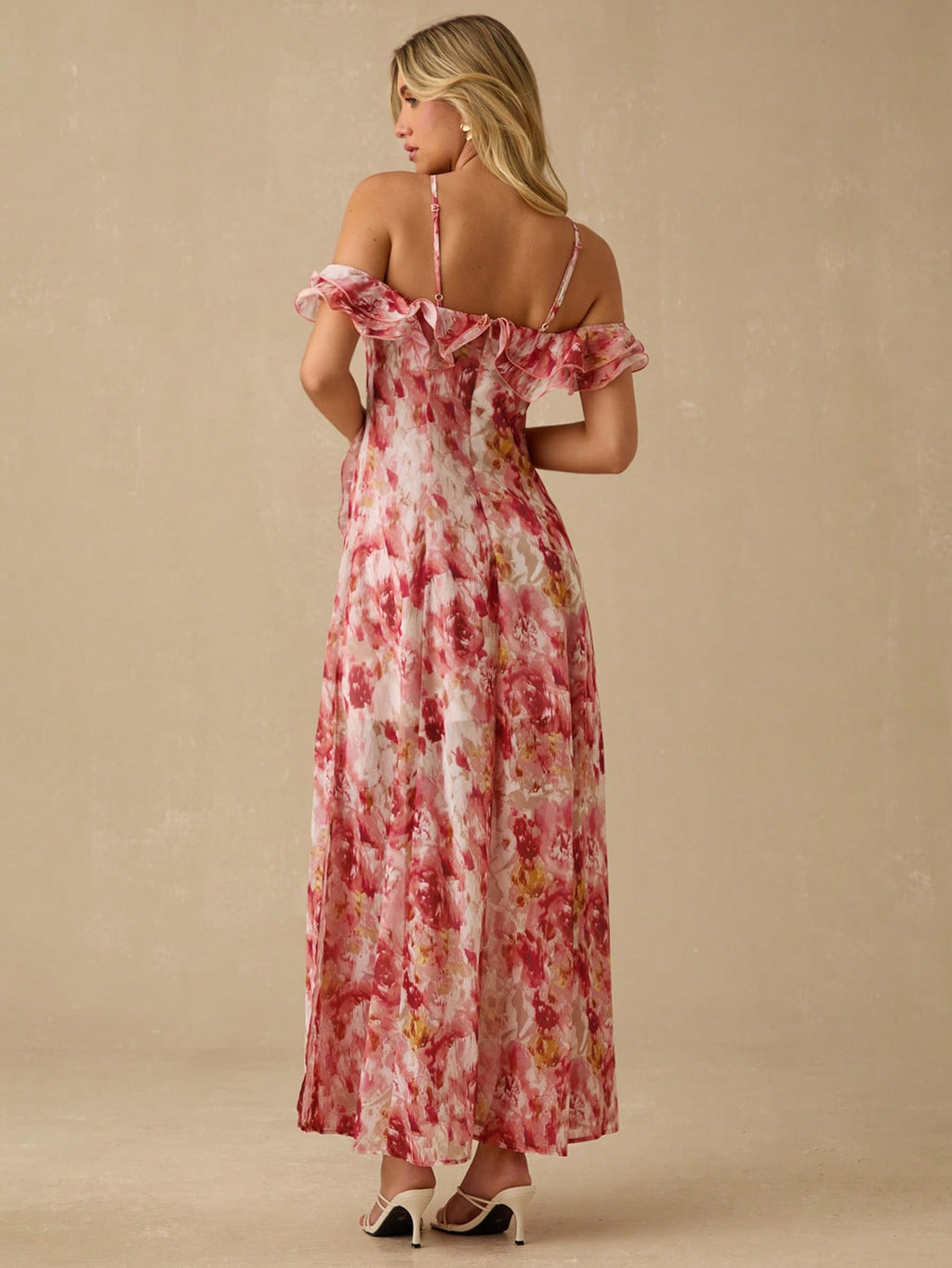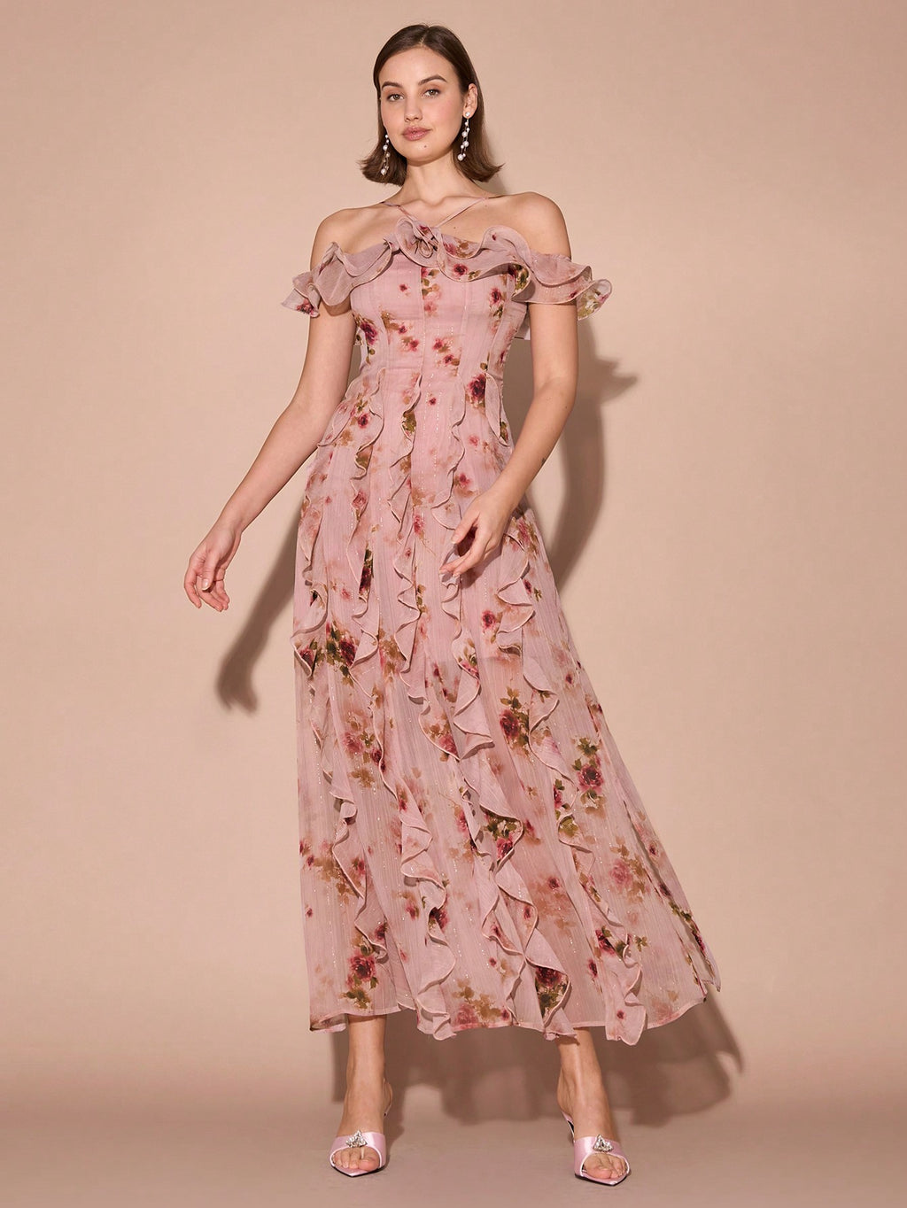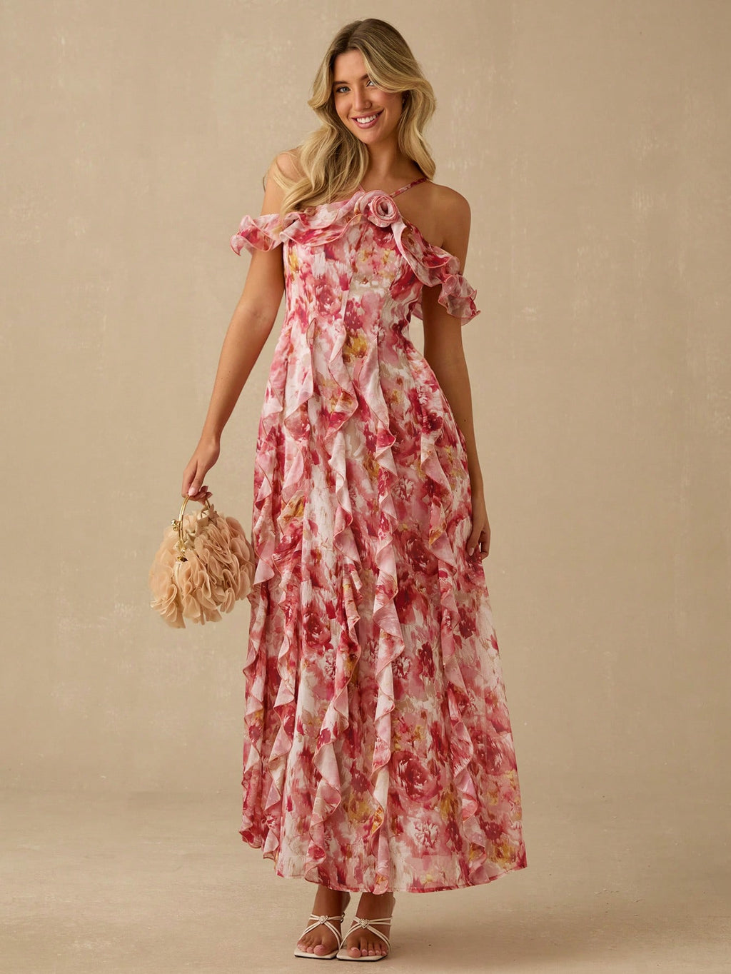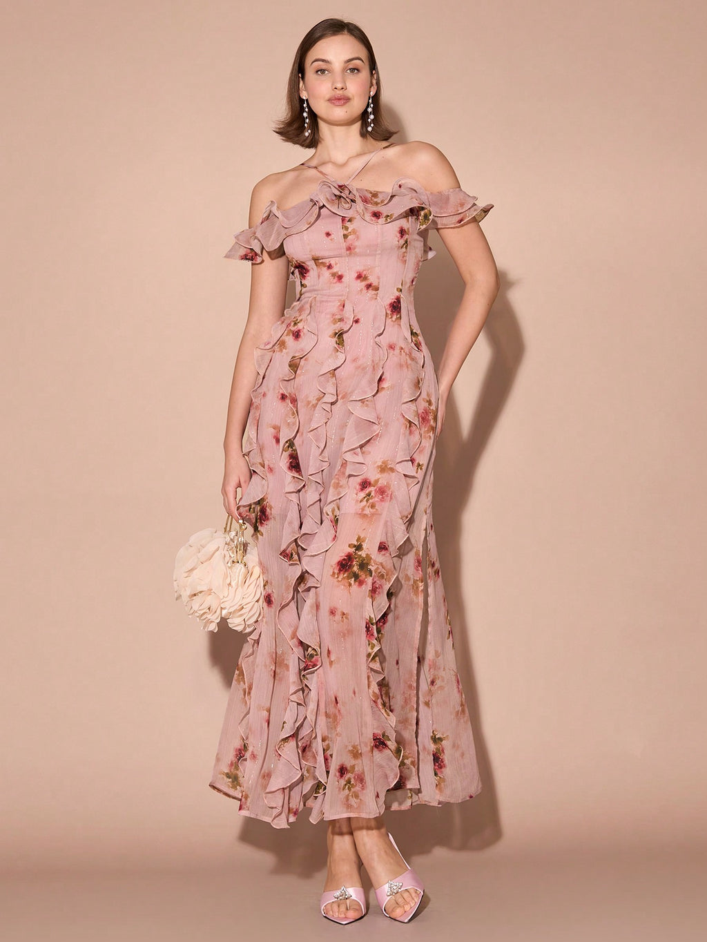 MiuVogue Spring/Summer Romantic Women's Vacation Style Allover Print Embellished Halter Ruffle Hem One Shoulder Maxi Dress,Sweet