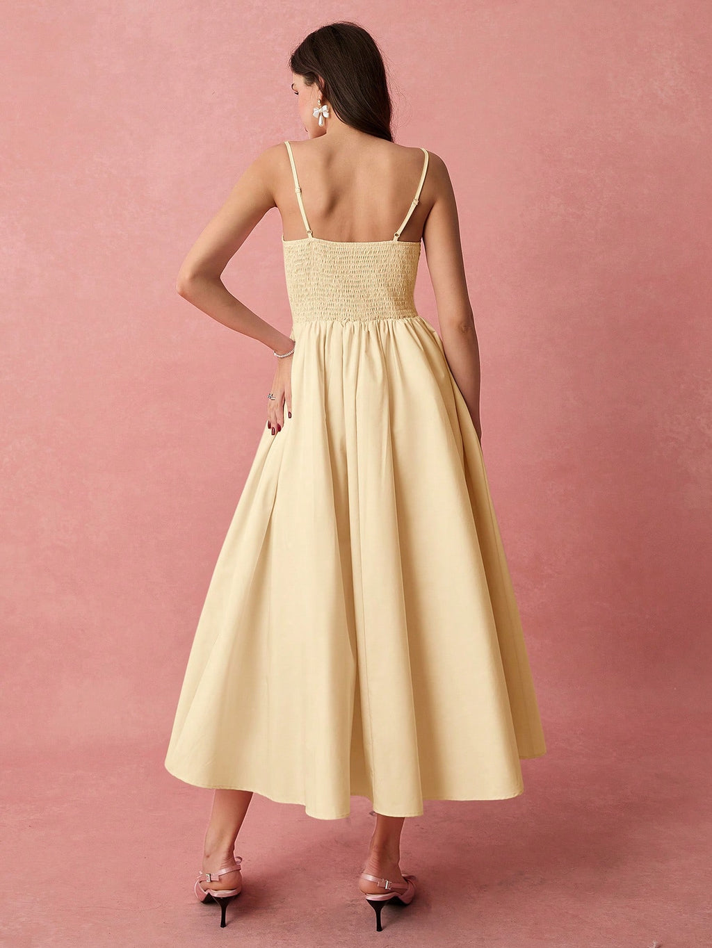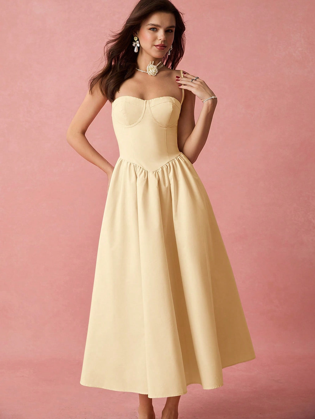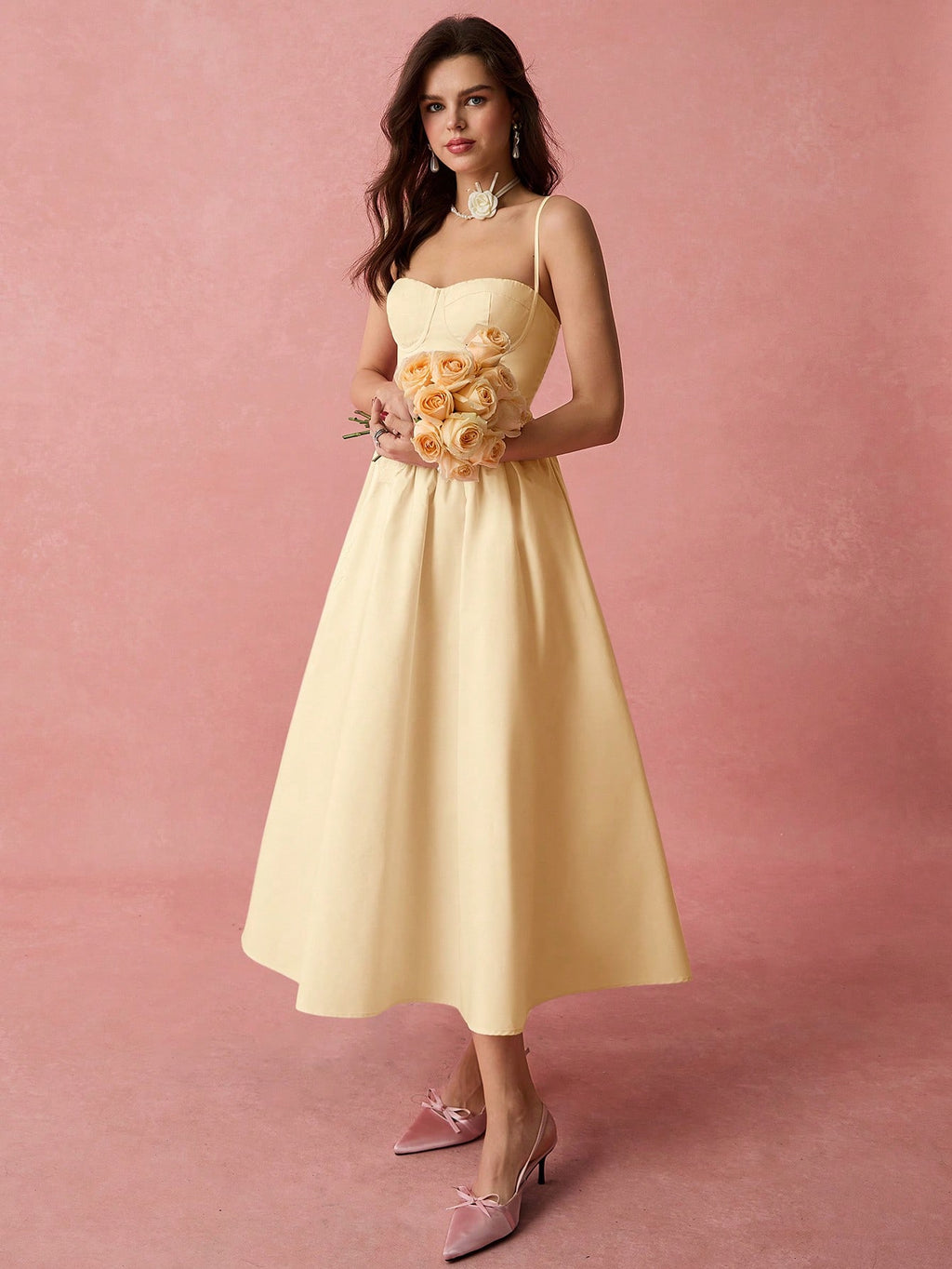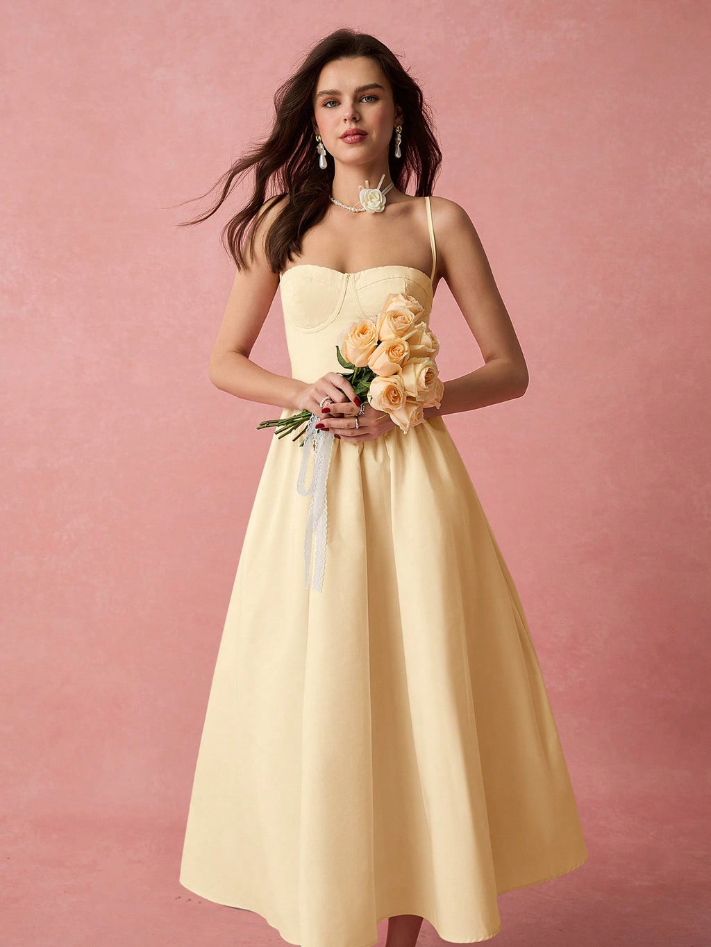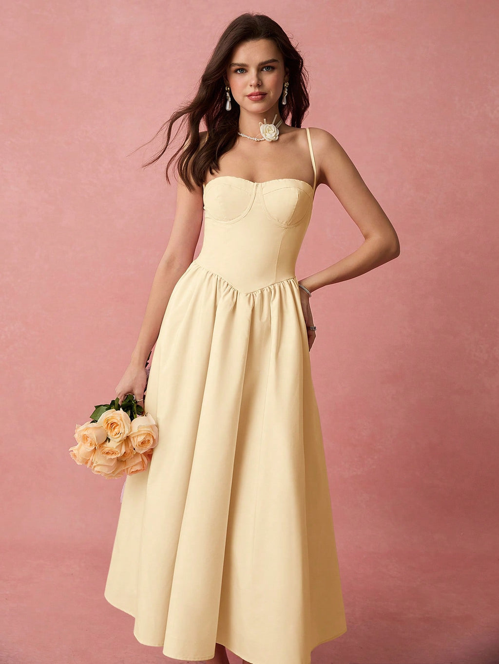 MiuVogue Women Elegant Solid Color Camisole Waist Fitted Dress,Butter Yellow,Summer Dresses For Women