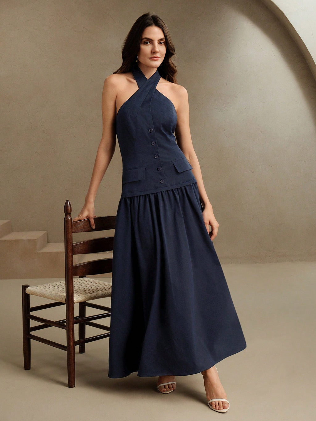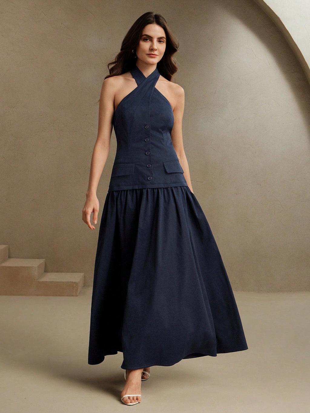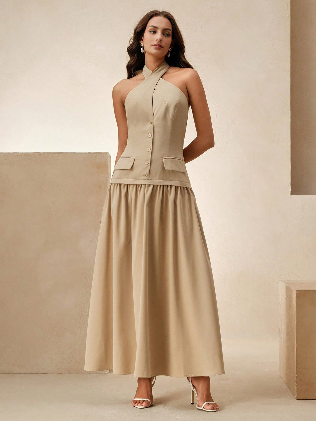 MiuVogue Women's Cross Halter Neck Cinched Waist Midi Dress, Business Commute Casual Spring Outfits
