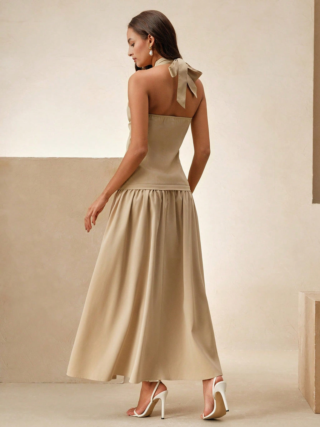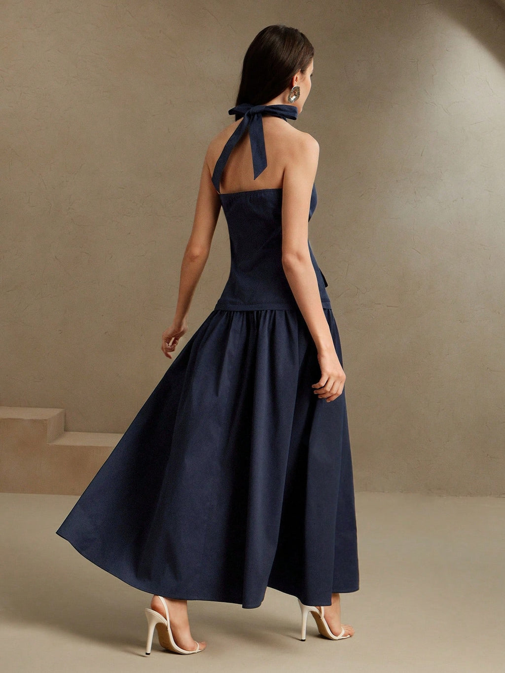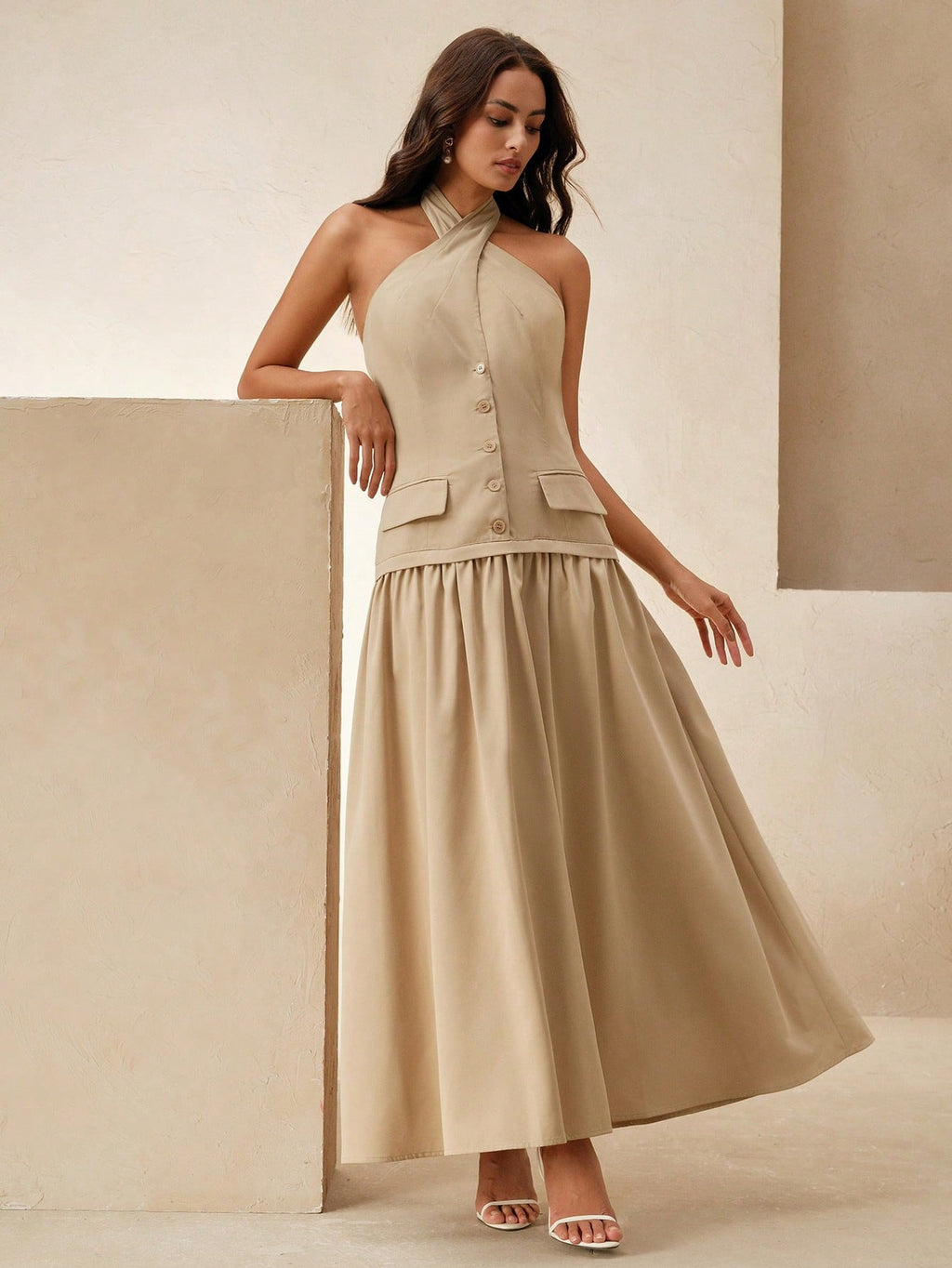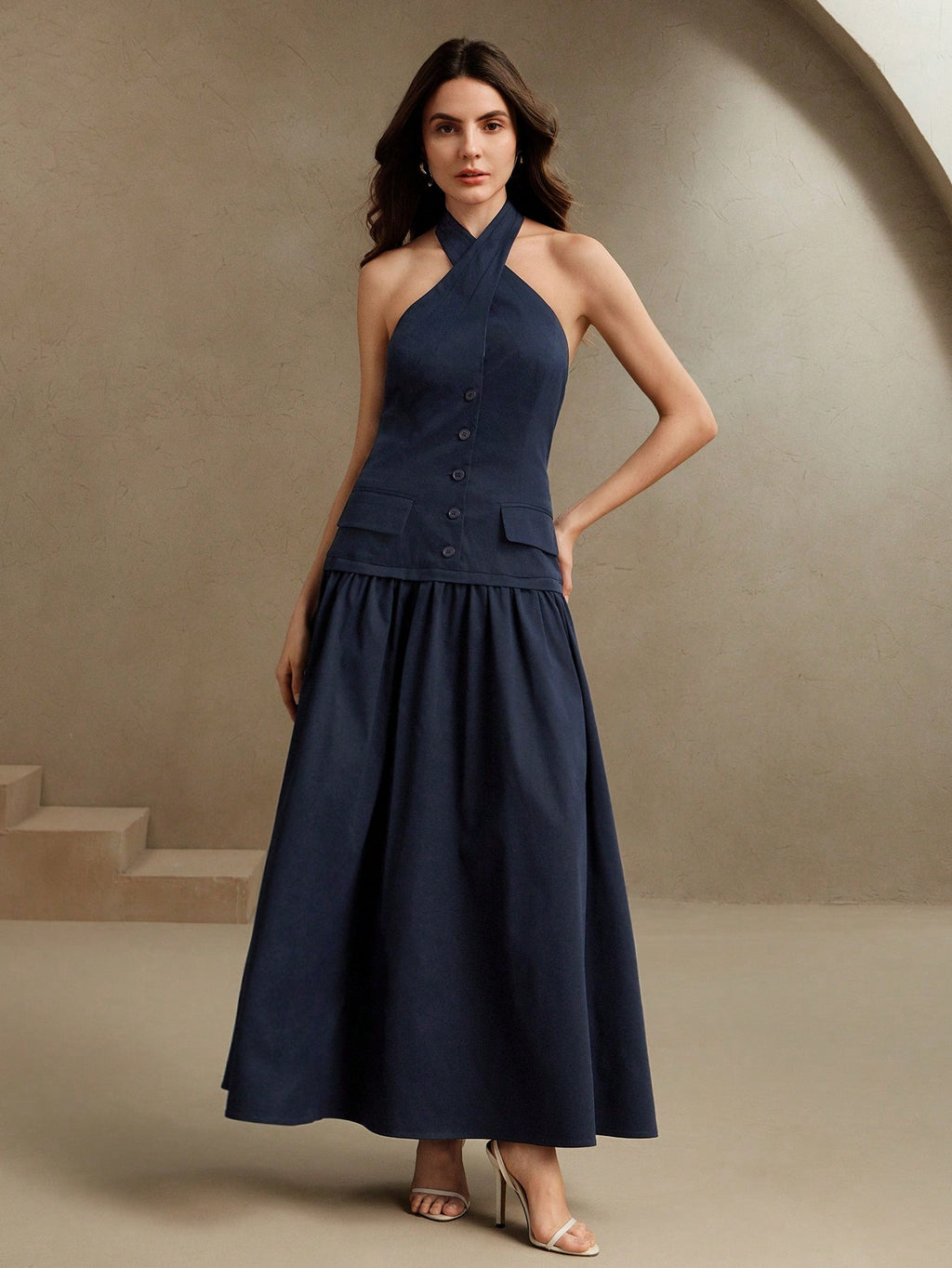 MiuVogue Women's Cross Halter Neck Cinched Waist Midi Dress, Business Commute Casual Spring Outfits