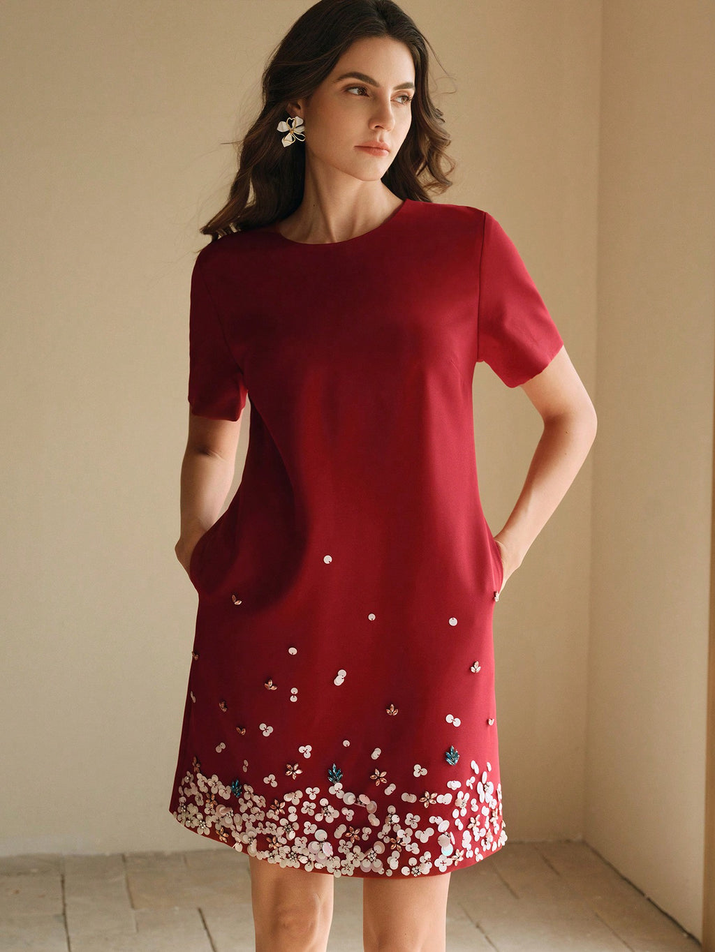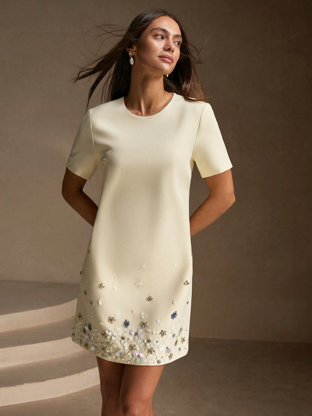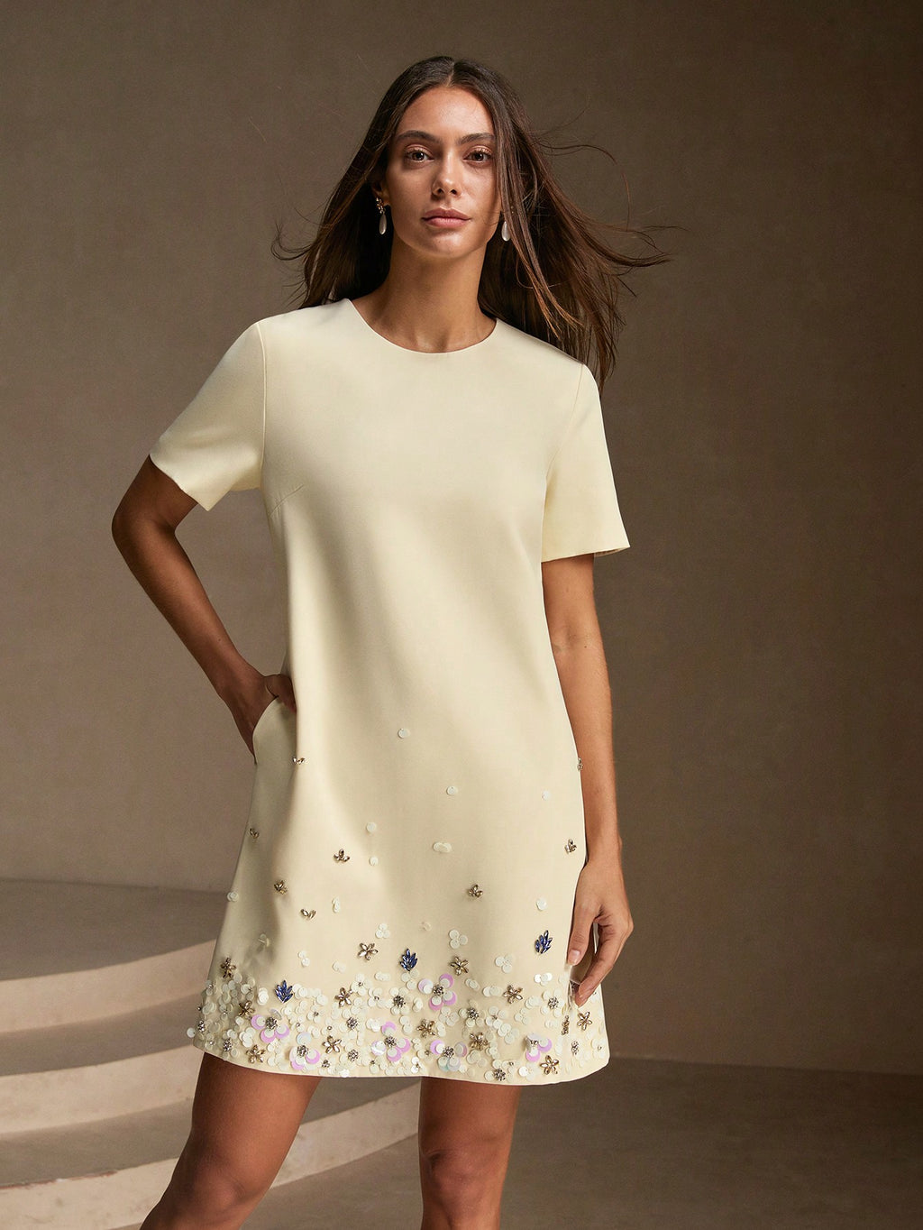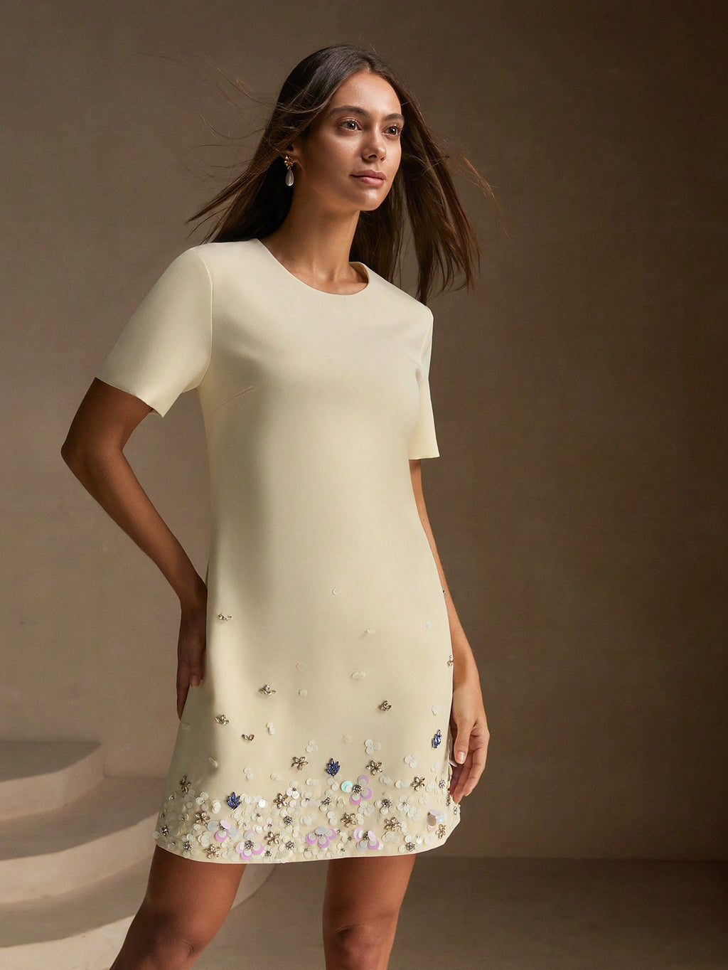 MiuVogue Women's Elegant Beige Embellished Hem Straight A-Line Short Sleeve Dress For Autumn/Winter