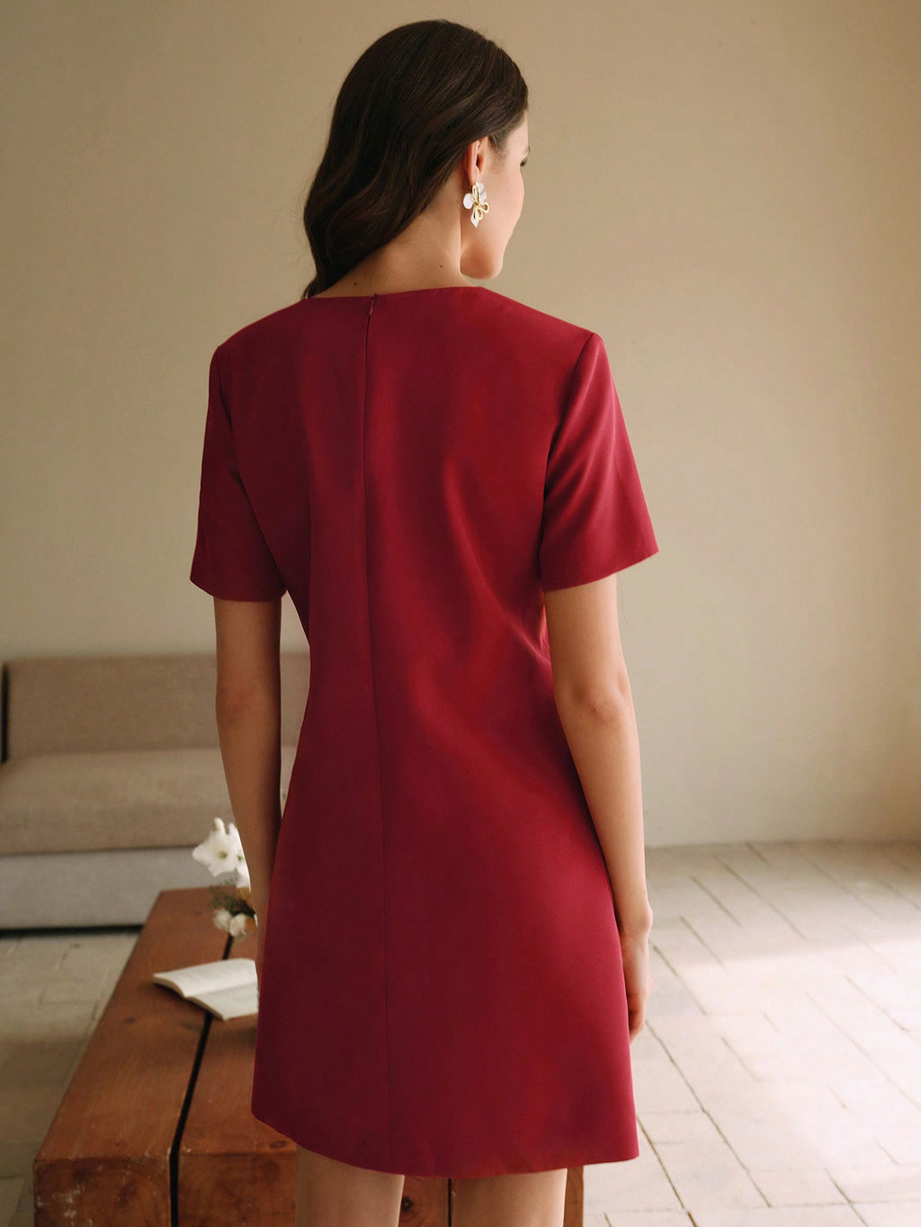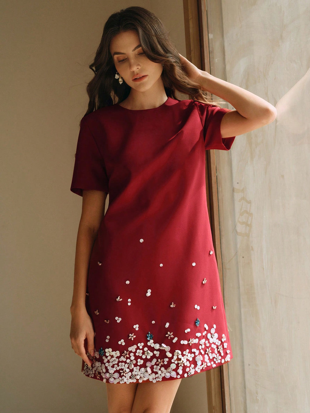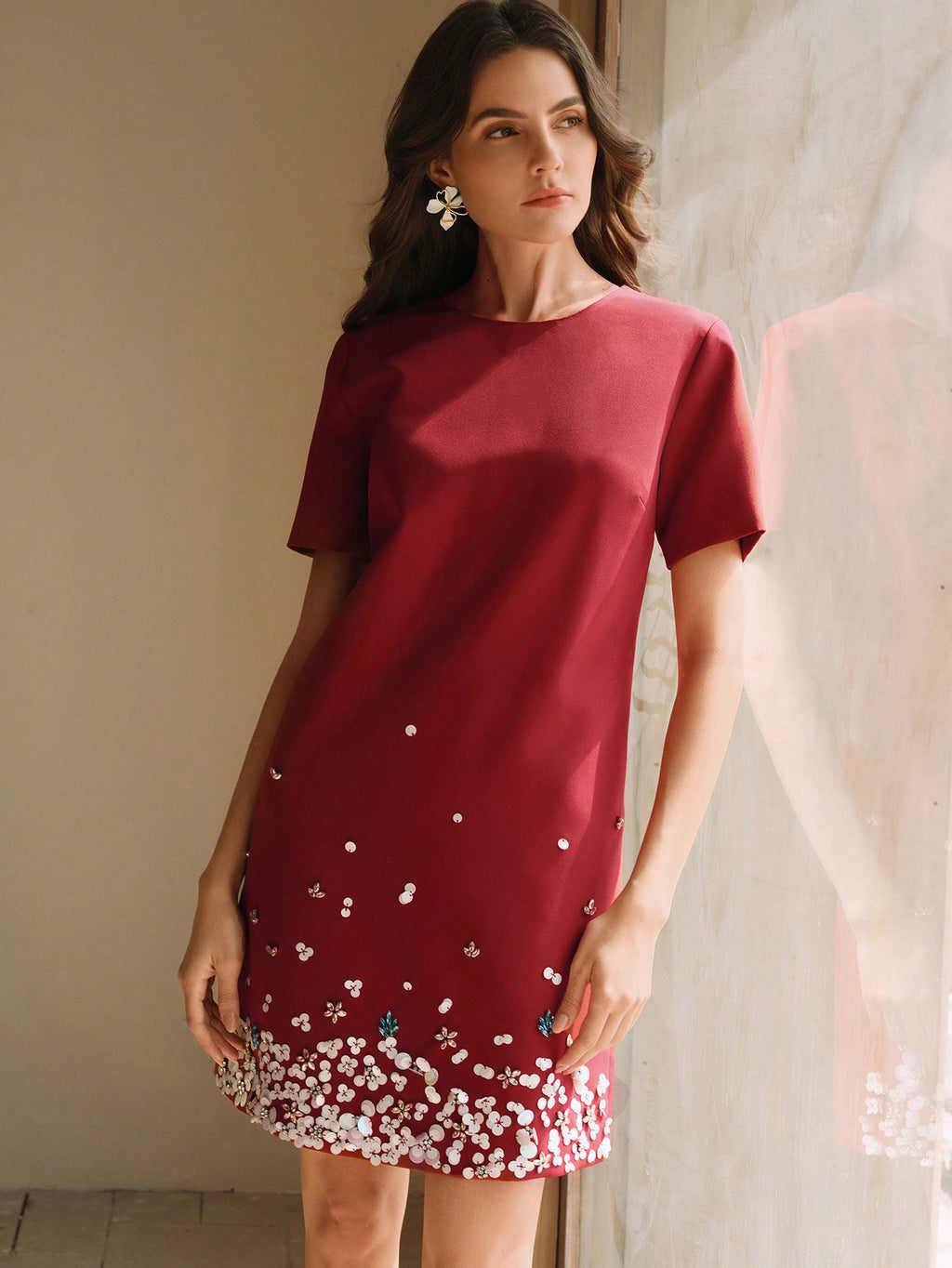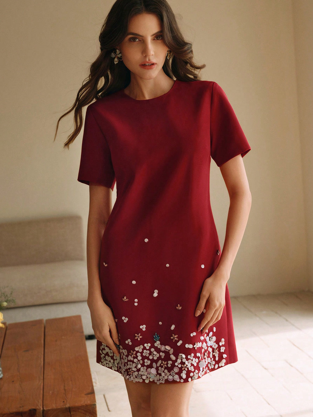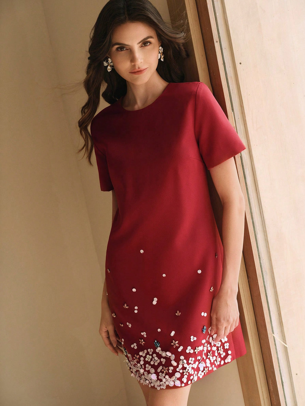 MiuVogue Women's Elegant Beige Embellished Hem Straight A-Line Short Sleeve Dress For Autumn/Winter