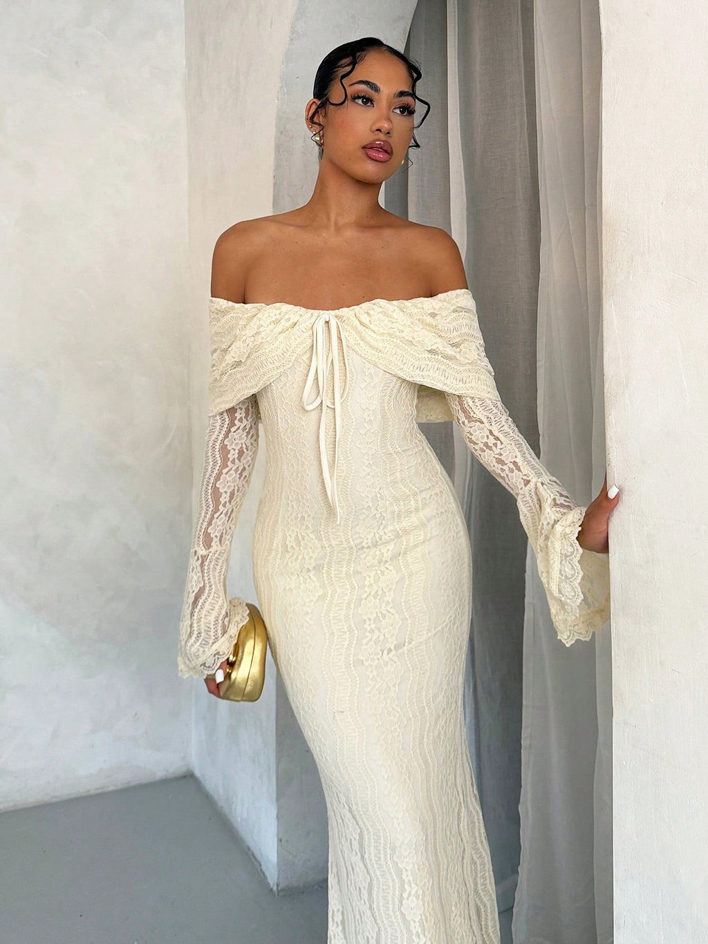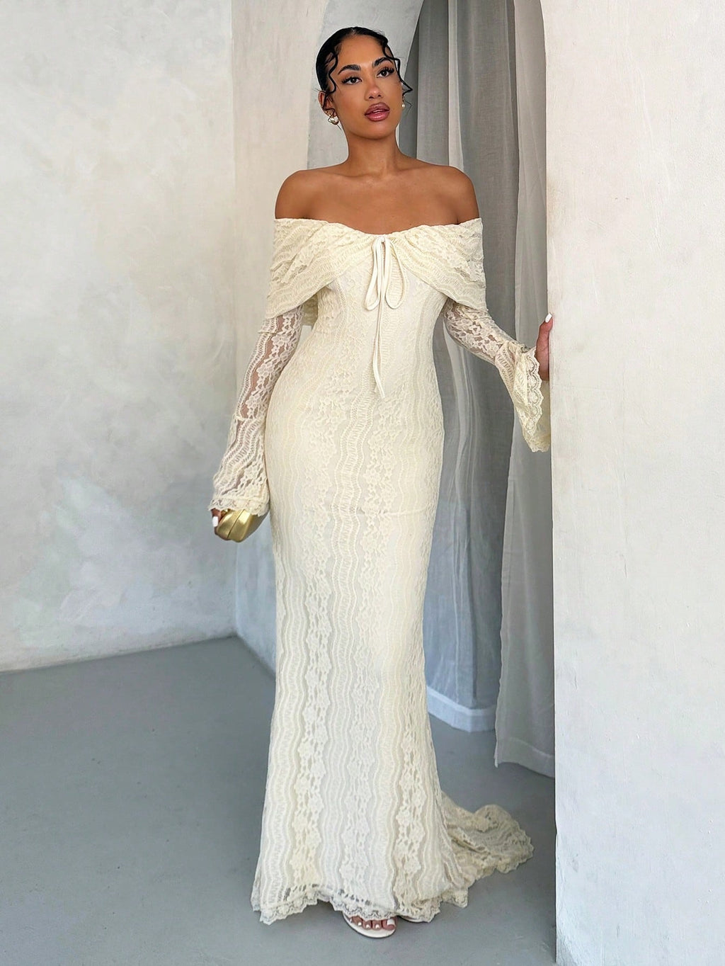 MiuVogue Women's Elegant Off Shoulder White Lace Long Sleeve Maxi Mermaid Dress, Suitable For Wedding, Party, Bridesmaid Dress,White Graduation Dress