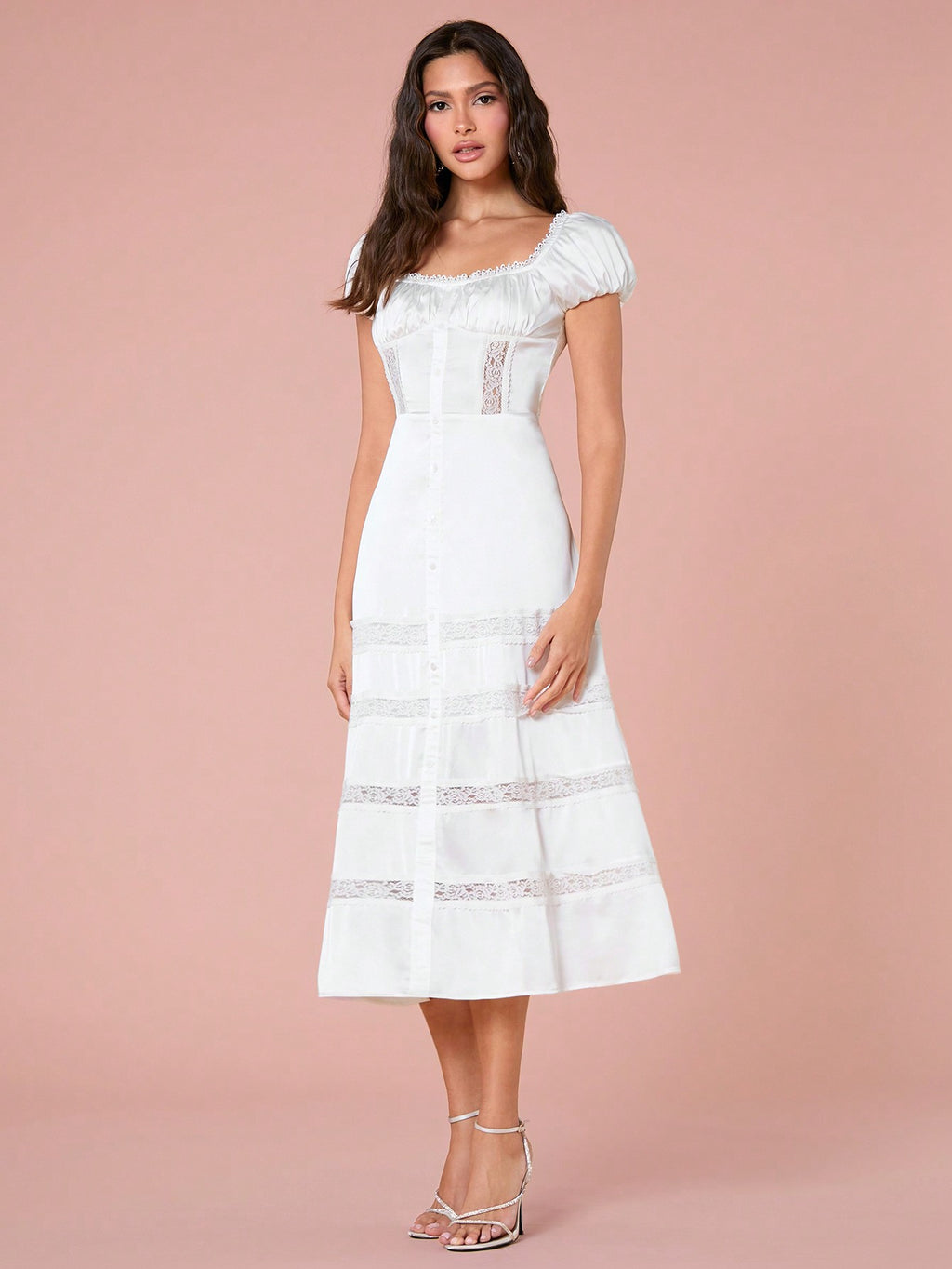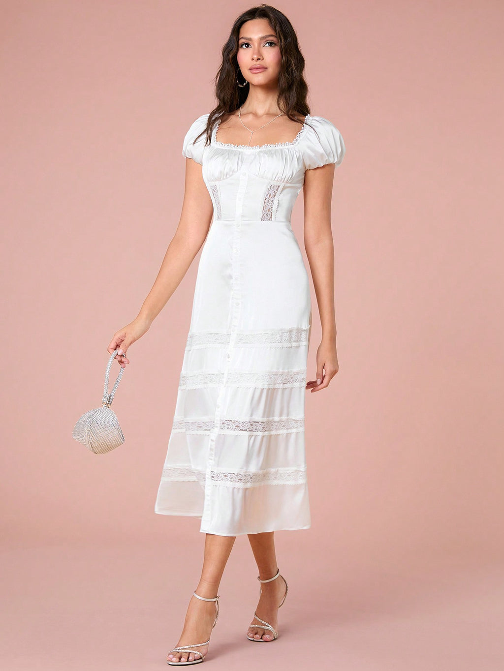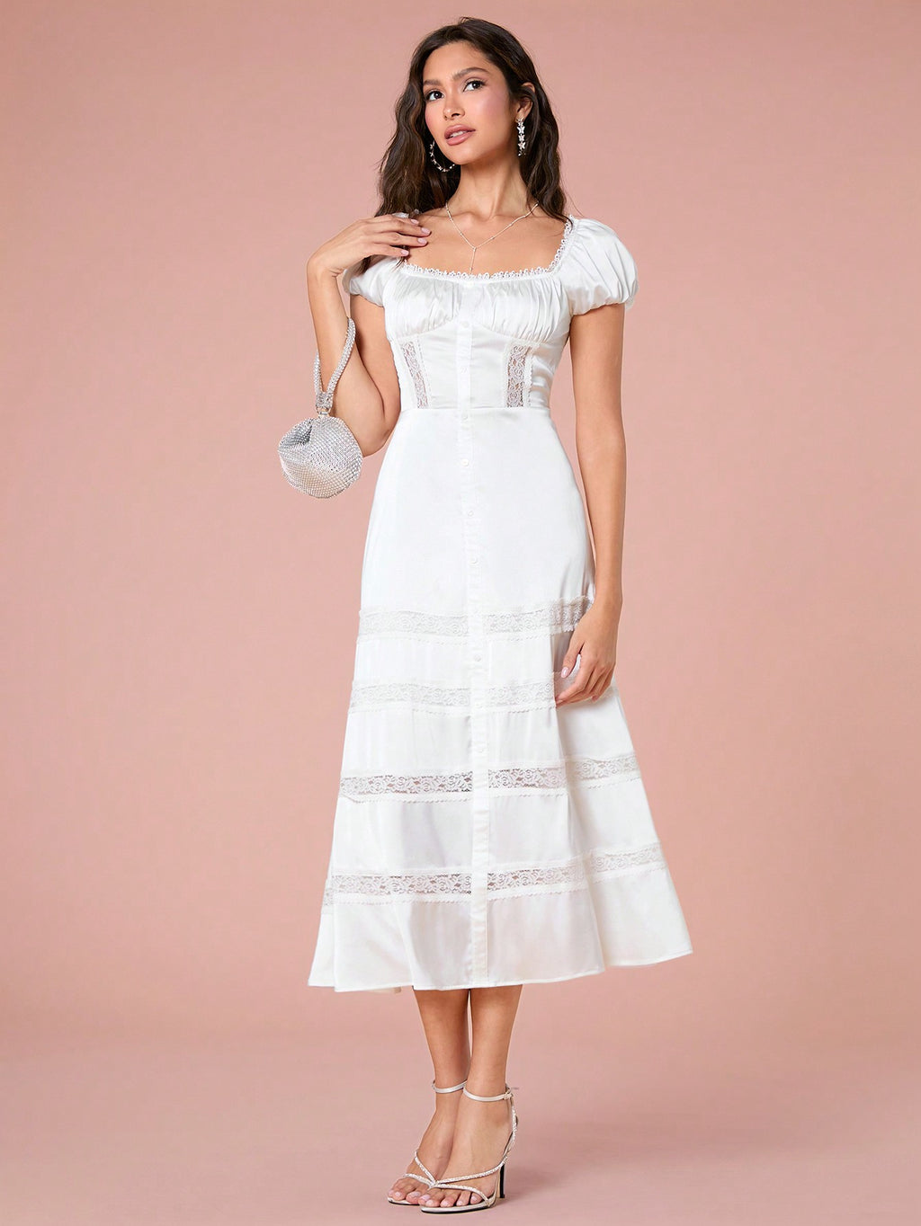 MiuVogue Women's Elegant Solid Color Lace Spliced Puff Sleeve Dress, Summer