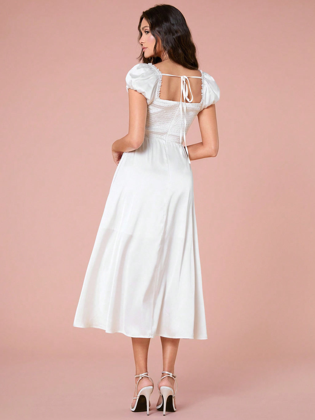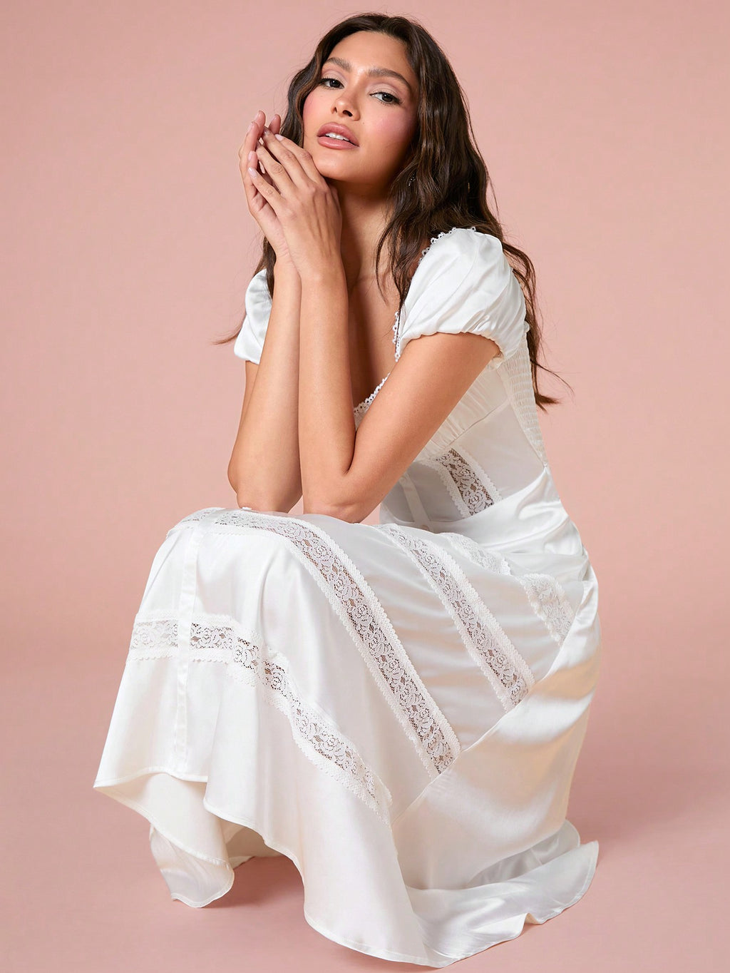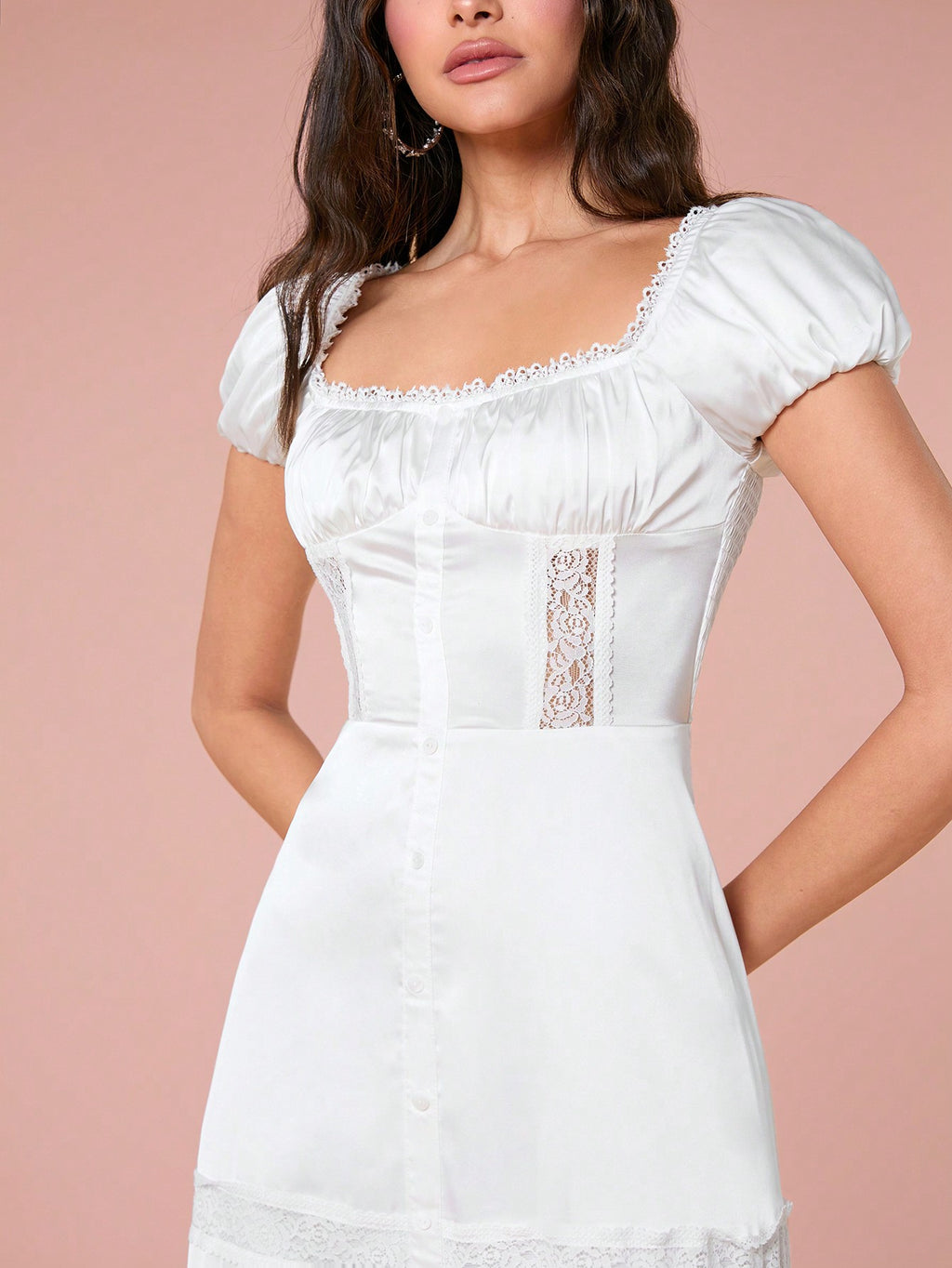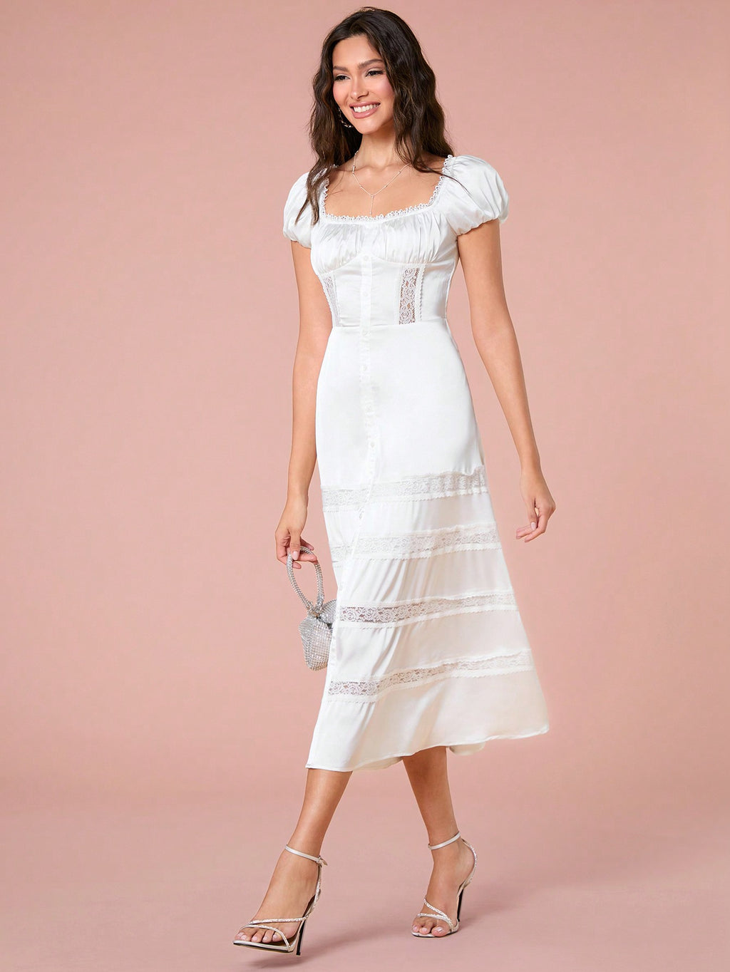MiuVogue Women's Elegant Solid Color Lace Spliced Puff Sleeve Dress, Summer