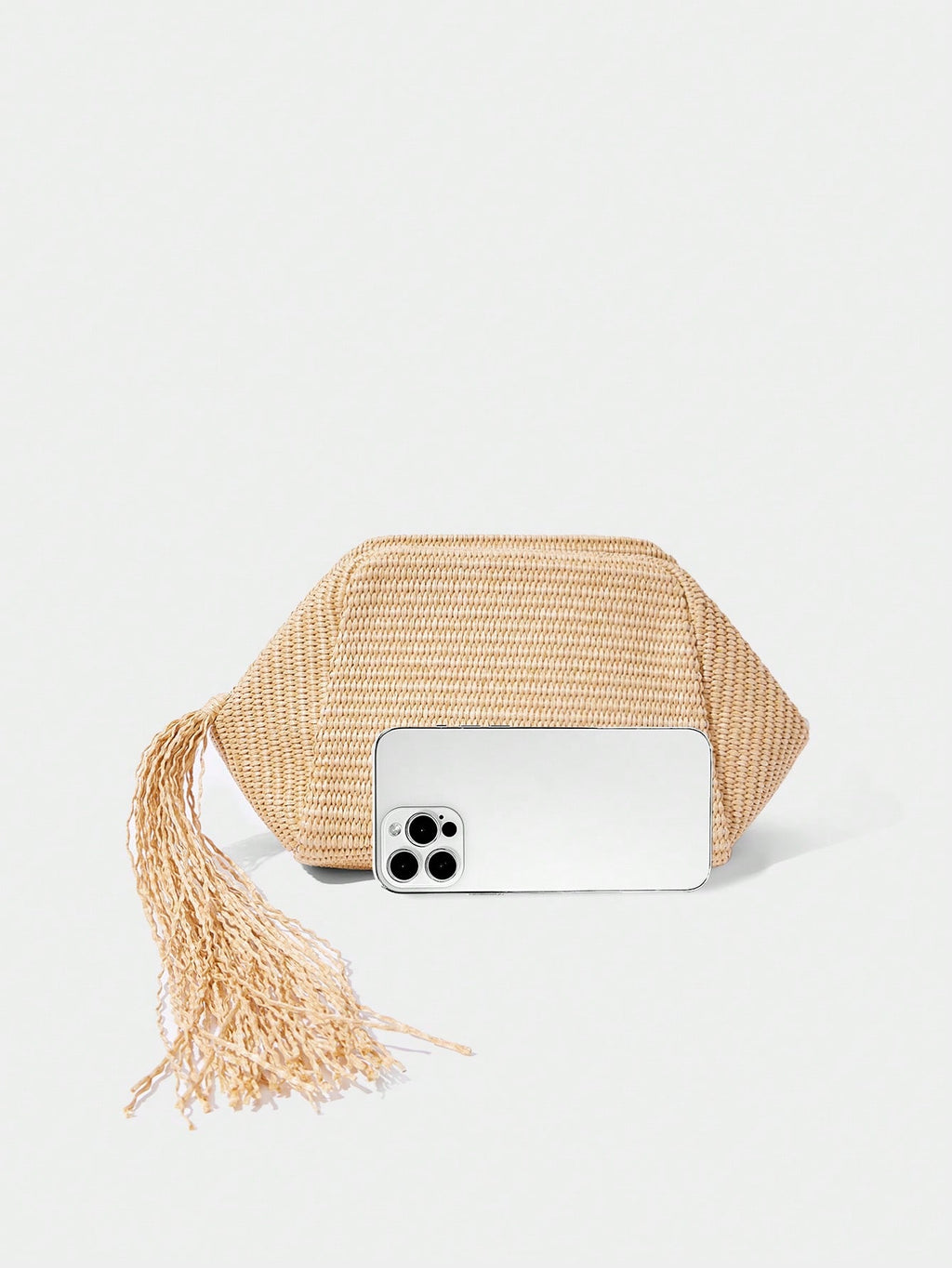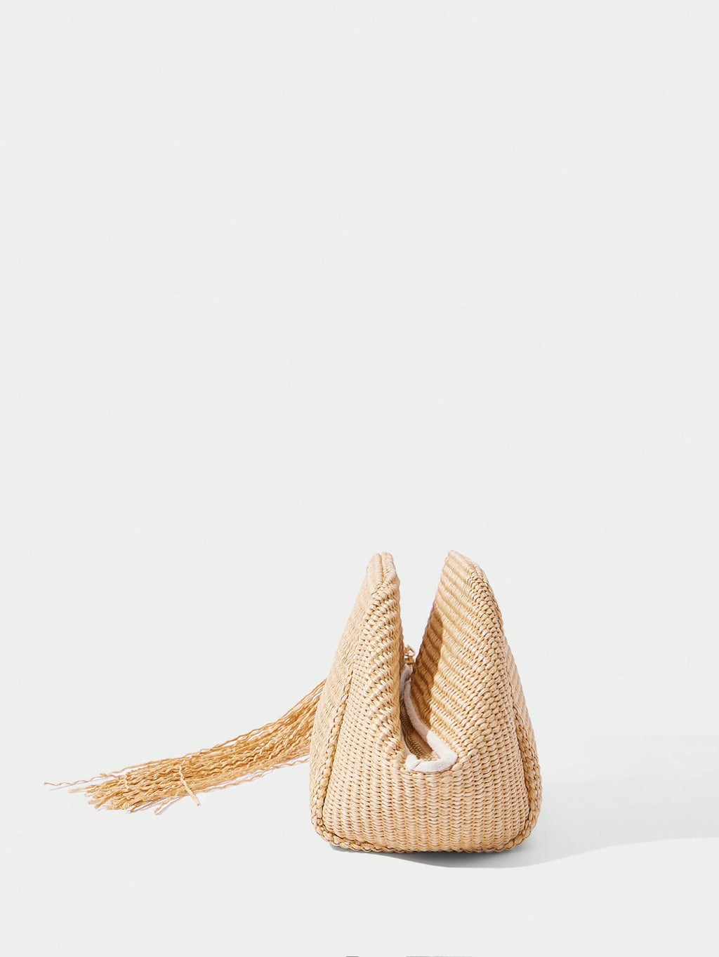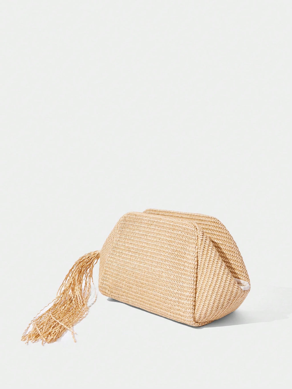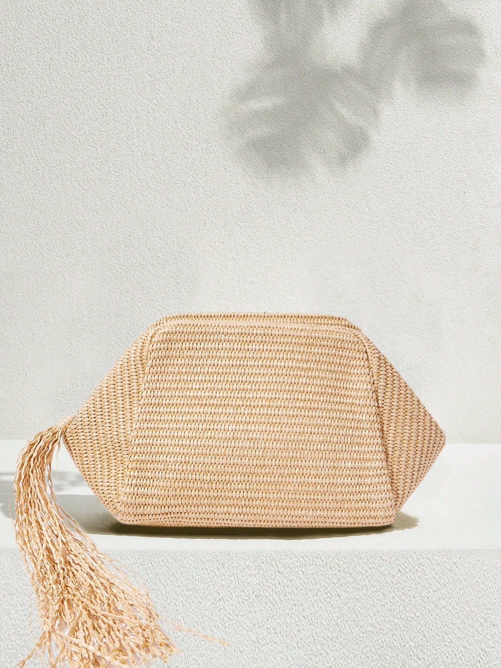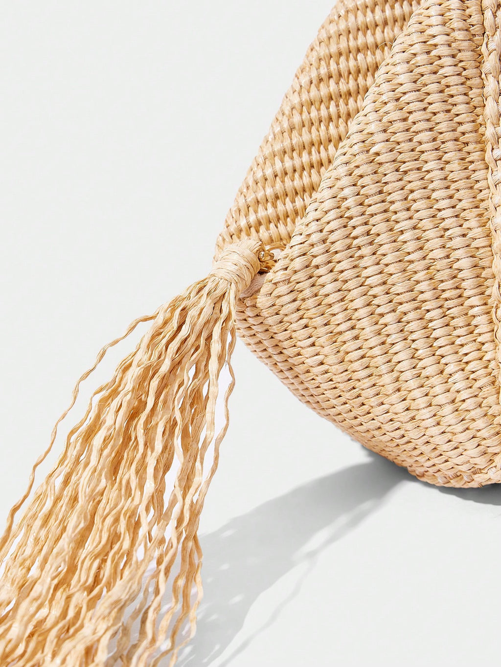 MIU Vogue ženska moderna elegantna ljetna torbica za odmor od tkanog slamnateg materijala, s dugim resama kao dekoracijom.