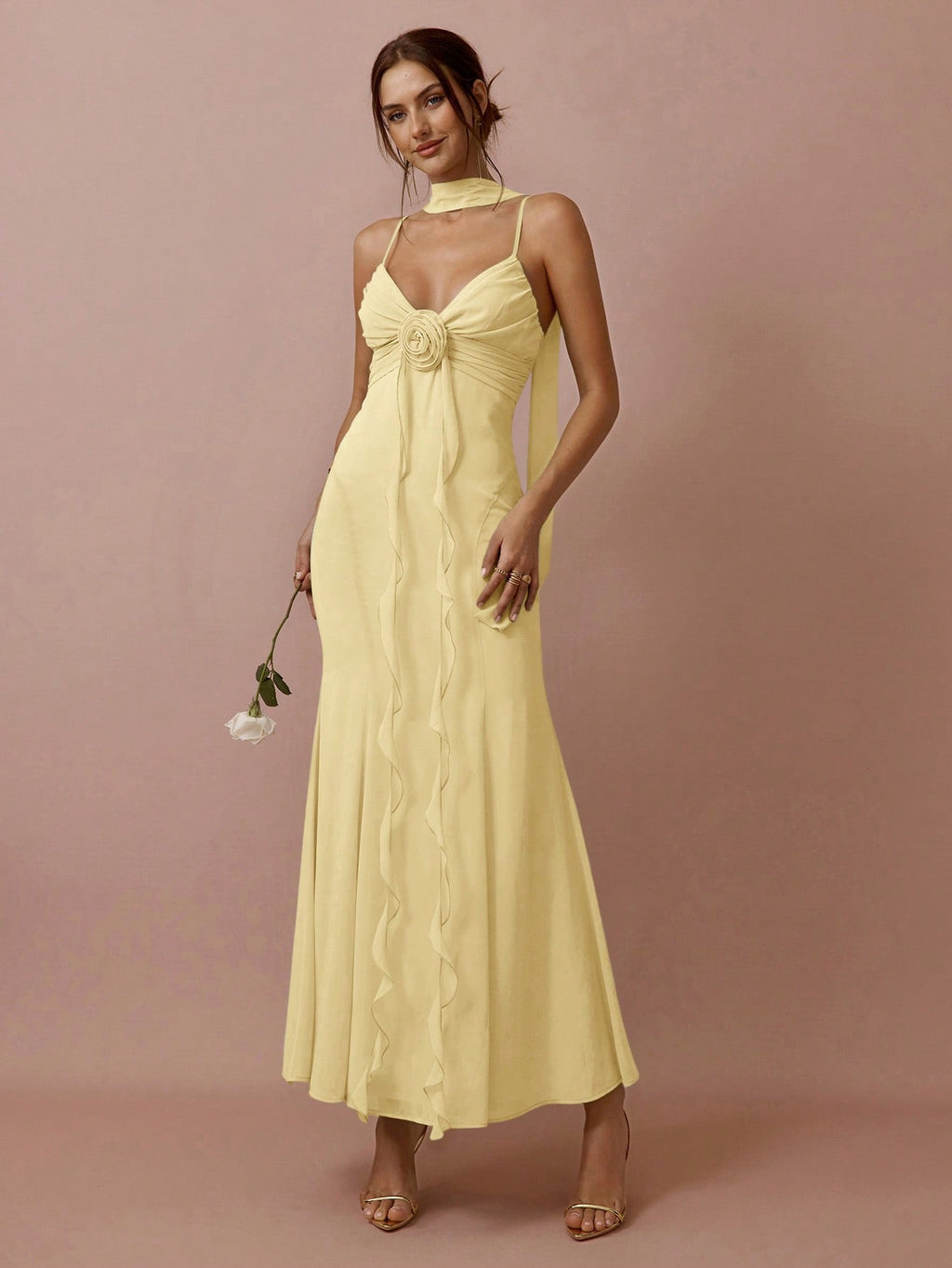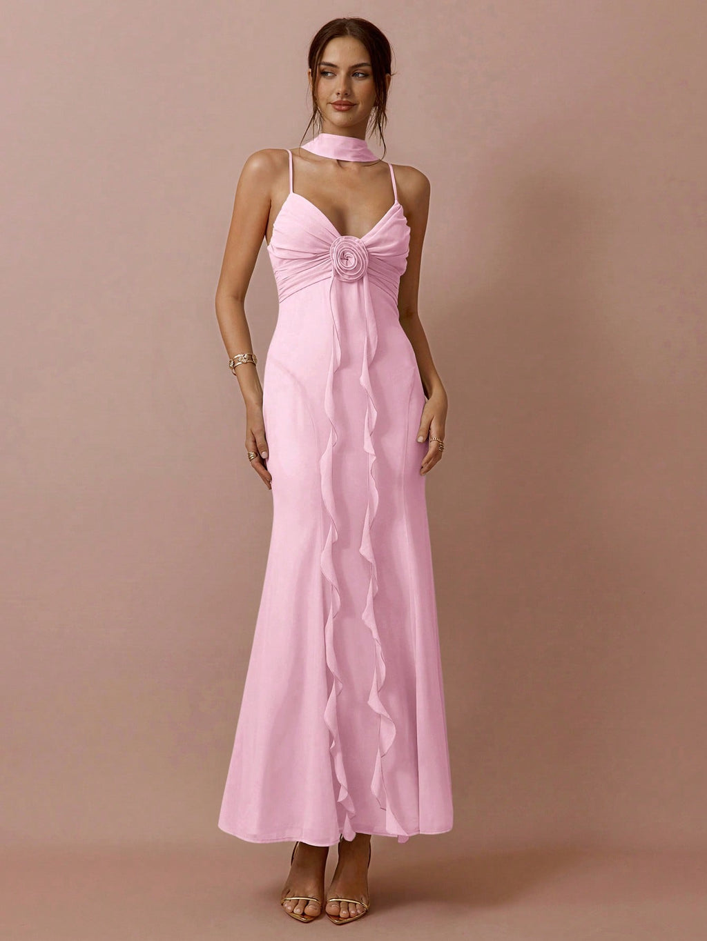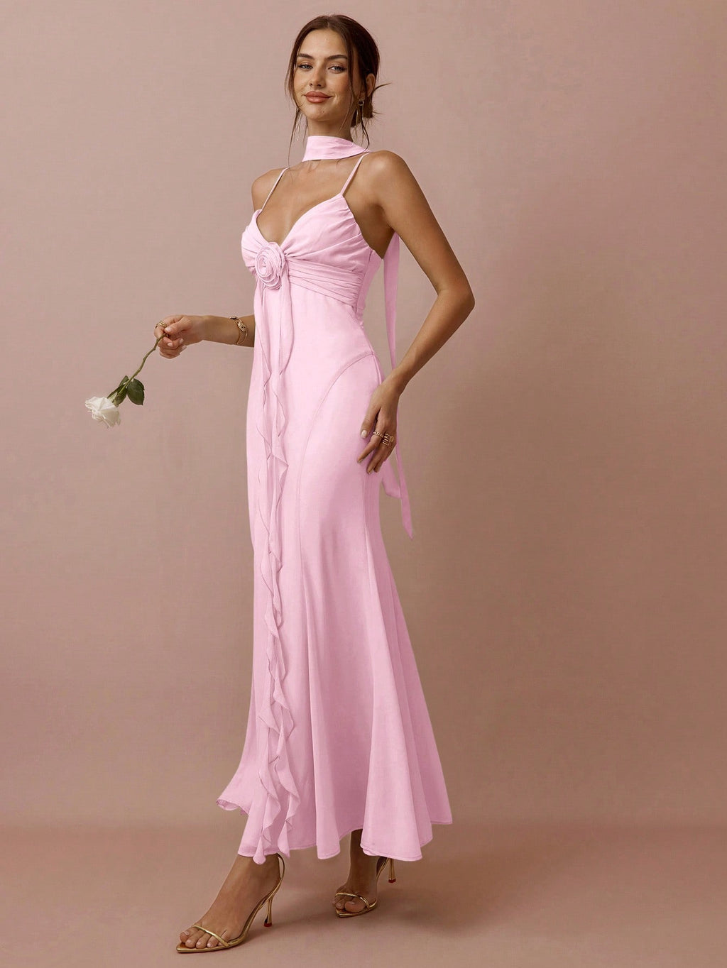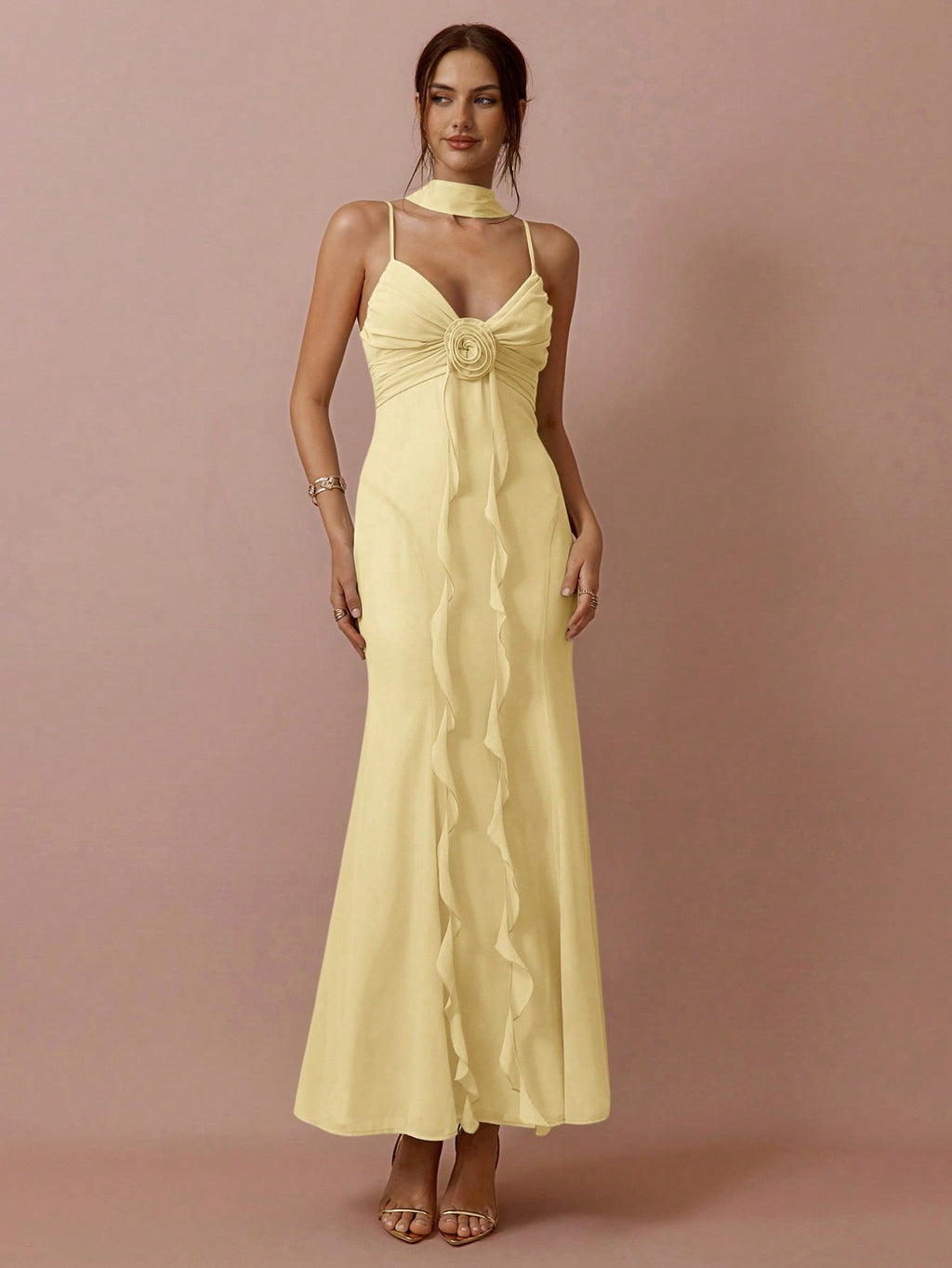 MiuVogue Women's Solid Color Adjustable Strap Flowery Decor Waist Cinched Long Dress, Summer
