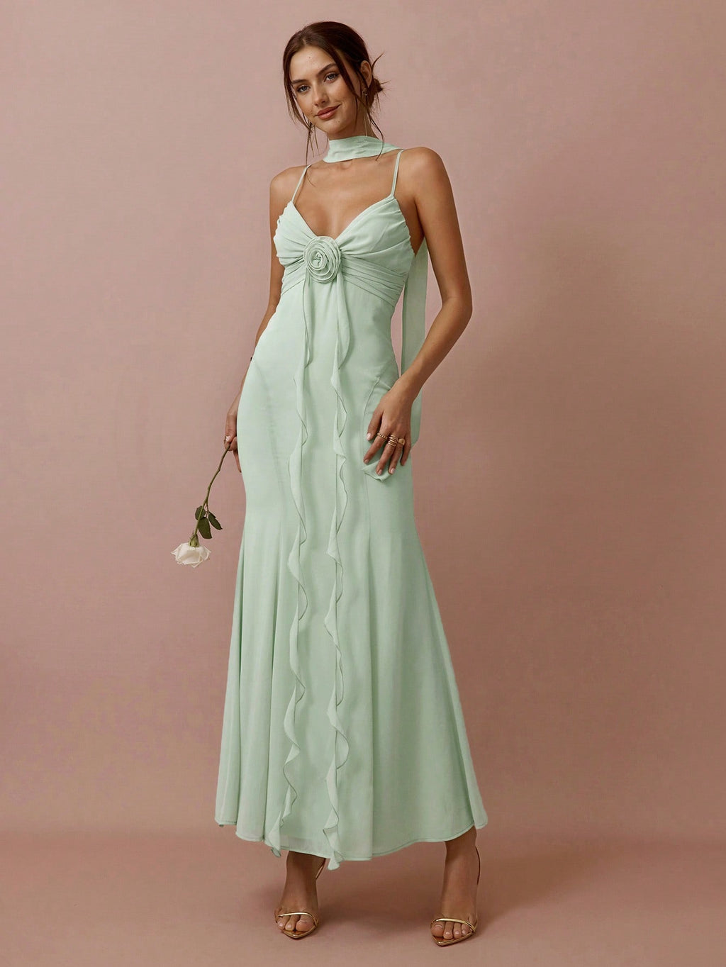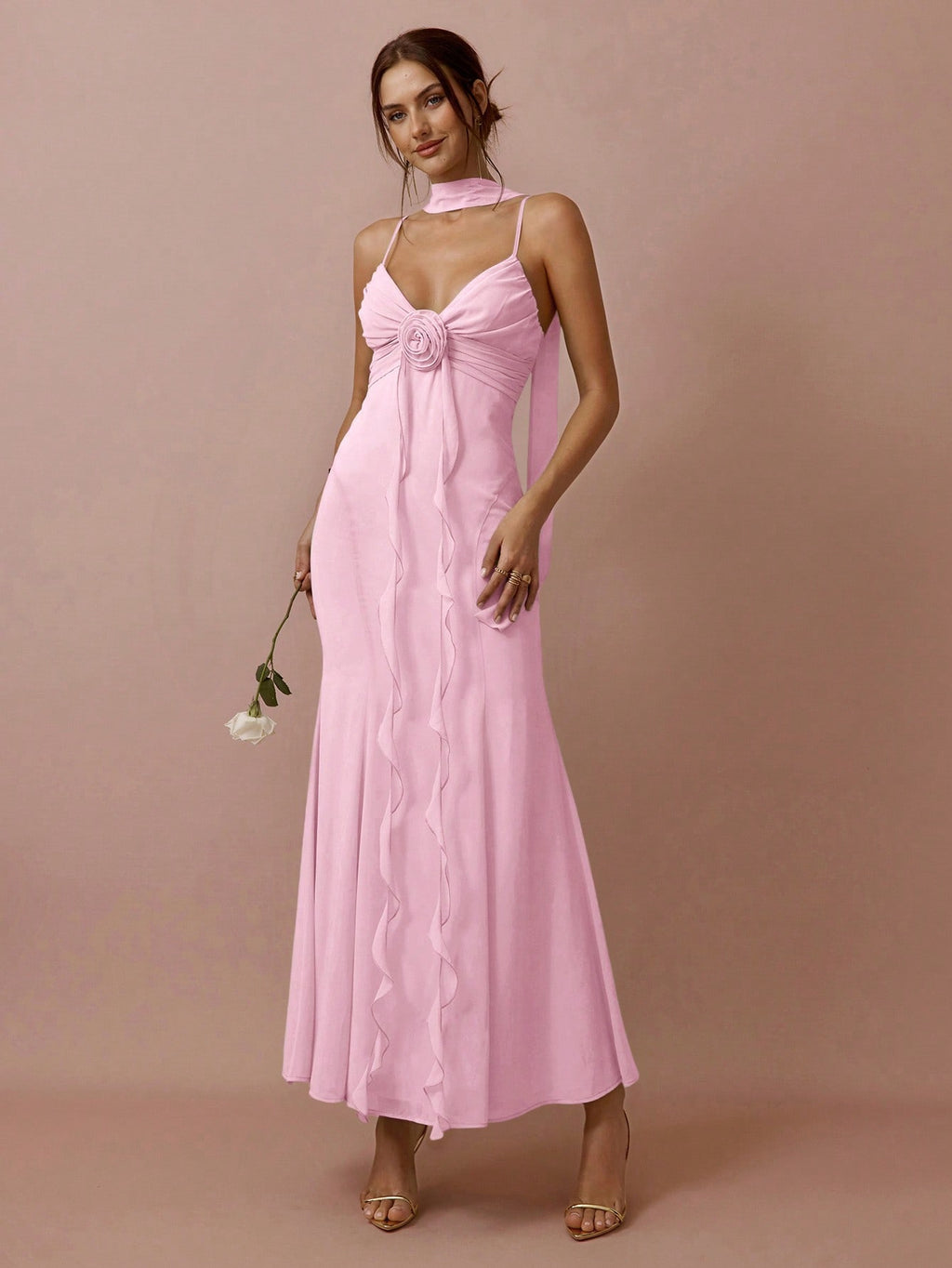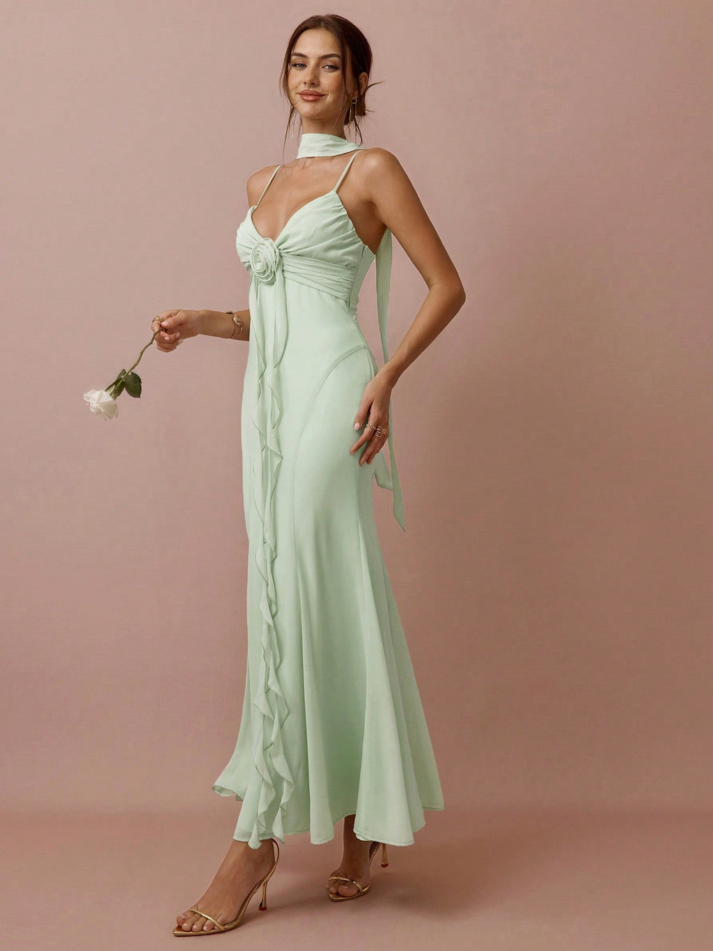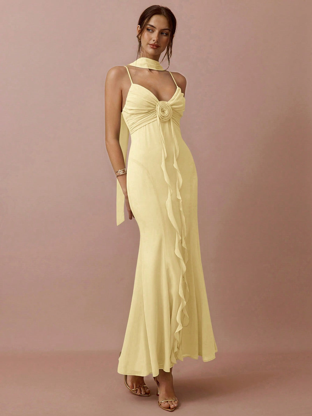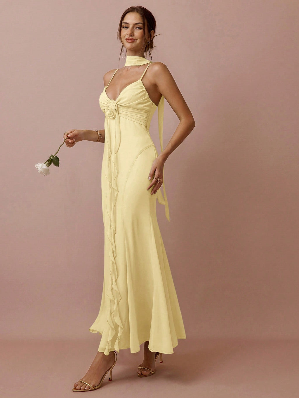 MiuVogue Women's Solid Color Adjustable Strap Flowery Decor Waist Cinched Long Dress, Summer
