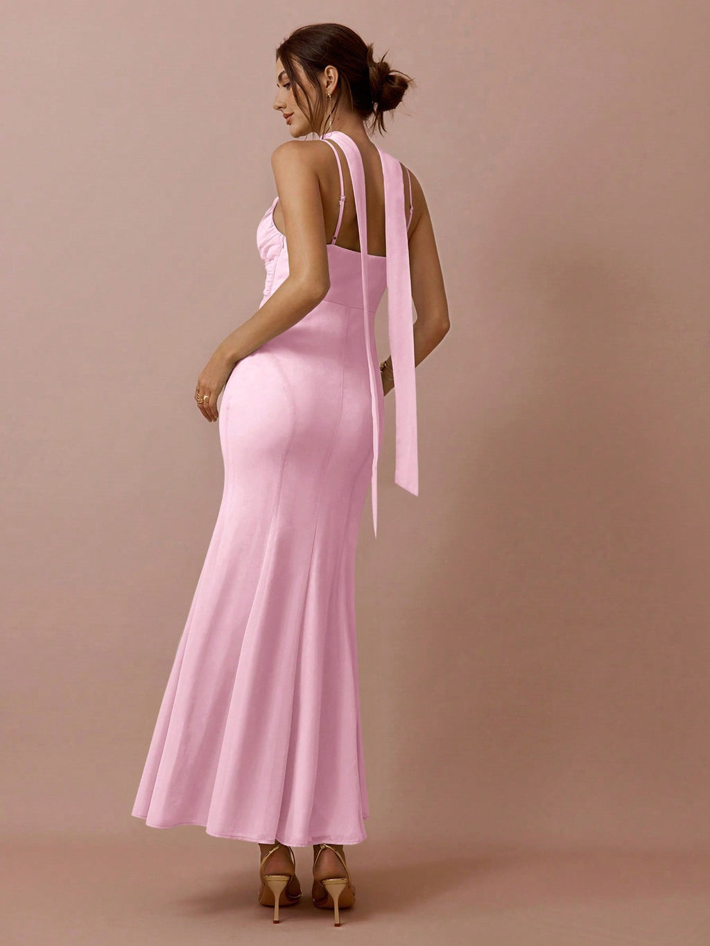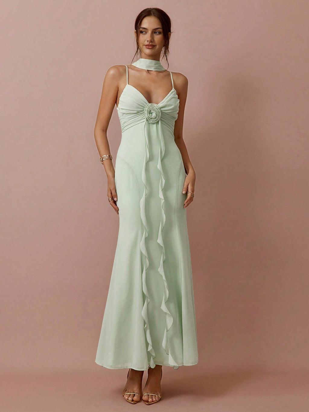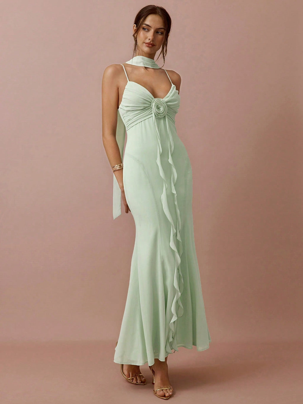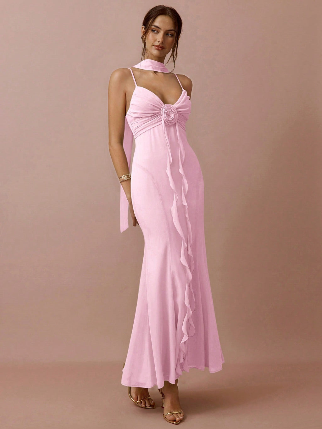 MiuVogue Women's Solid Color Adjustable Strap Flowery Decor Waist Cinched Long Dress, Summer