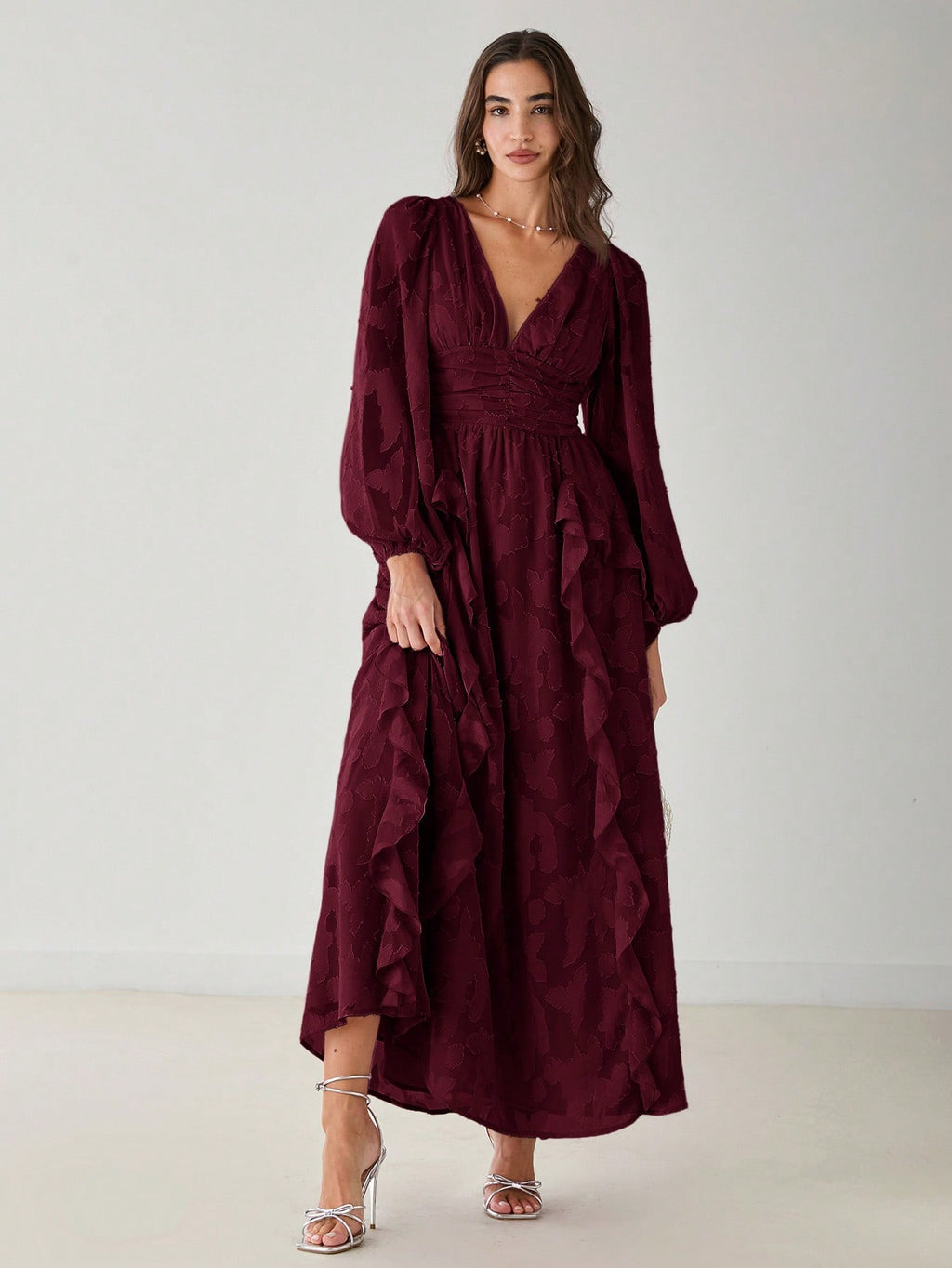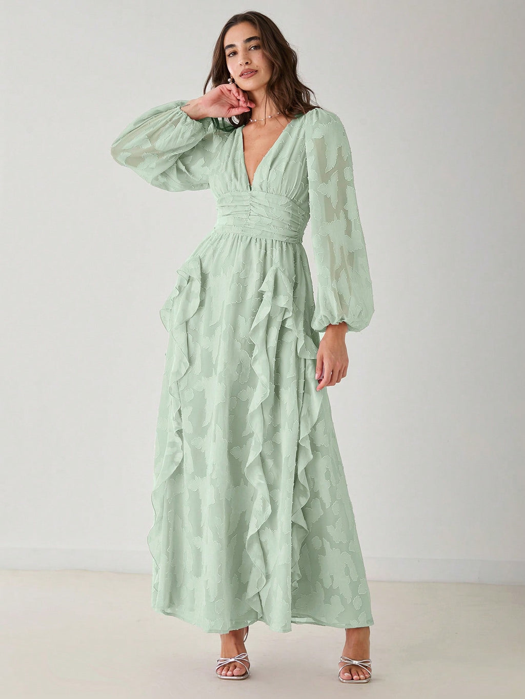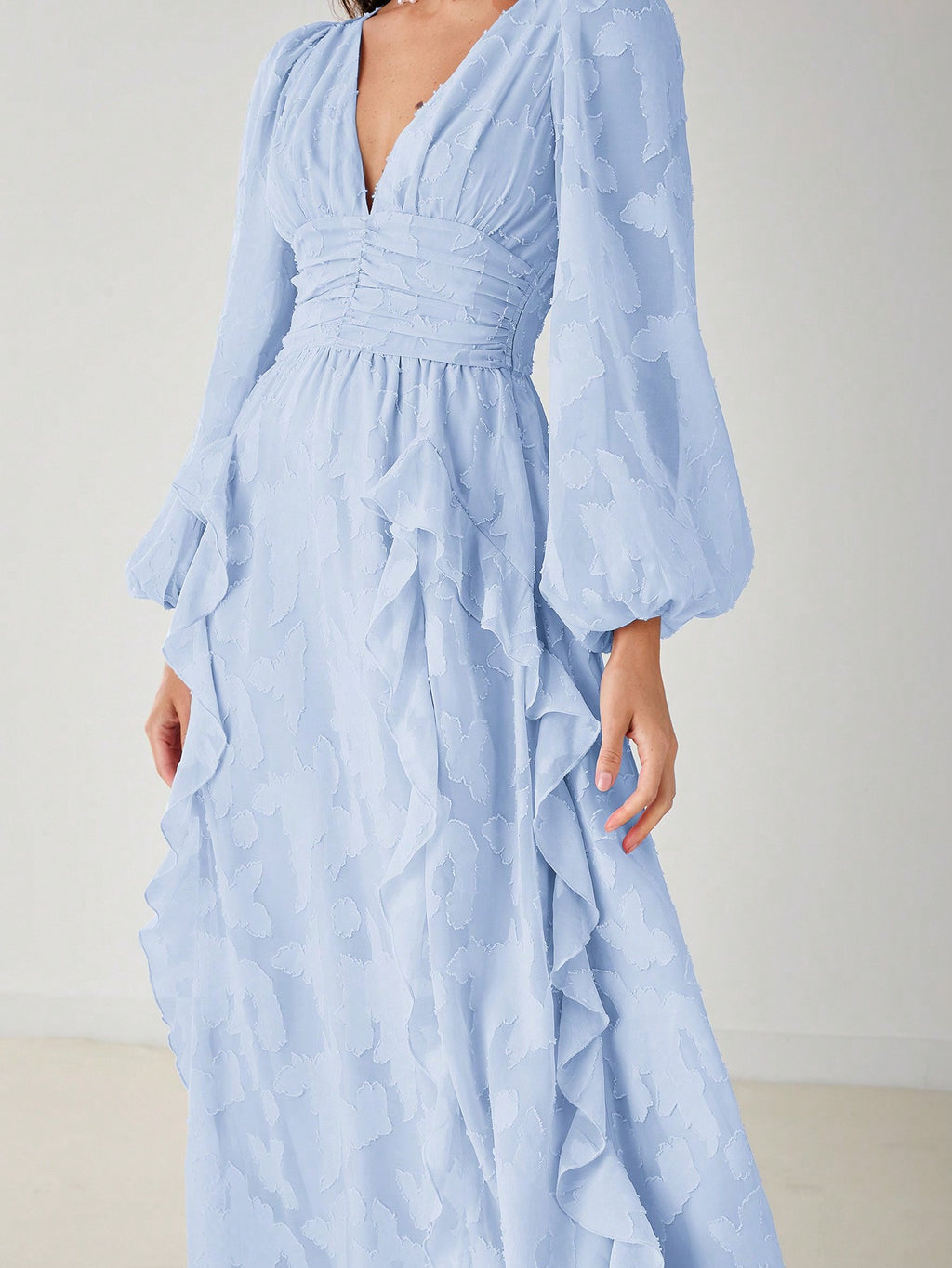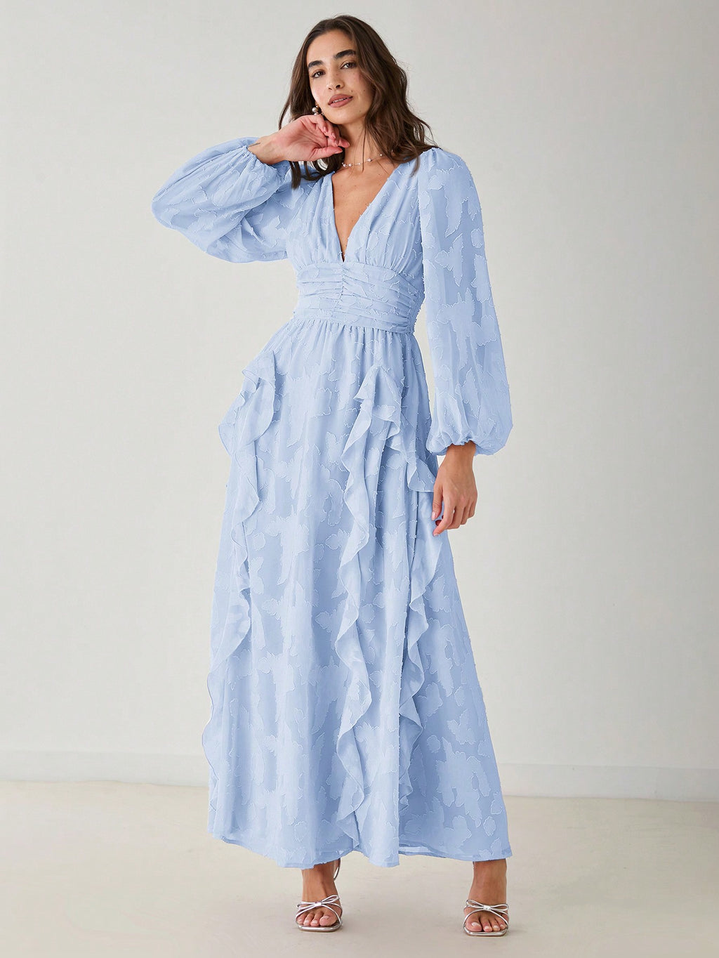 MiuVogue Women's Solid Color V-Neck Lantern Sleeve Flounce Hem Maxi Elegant Dress