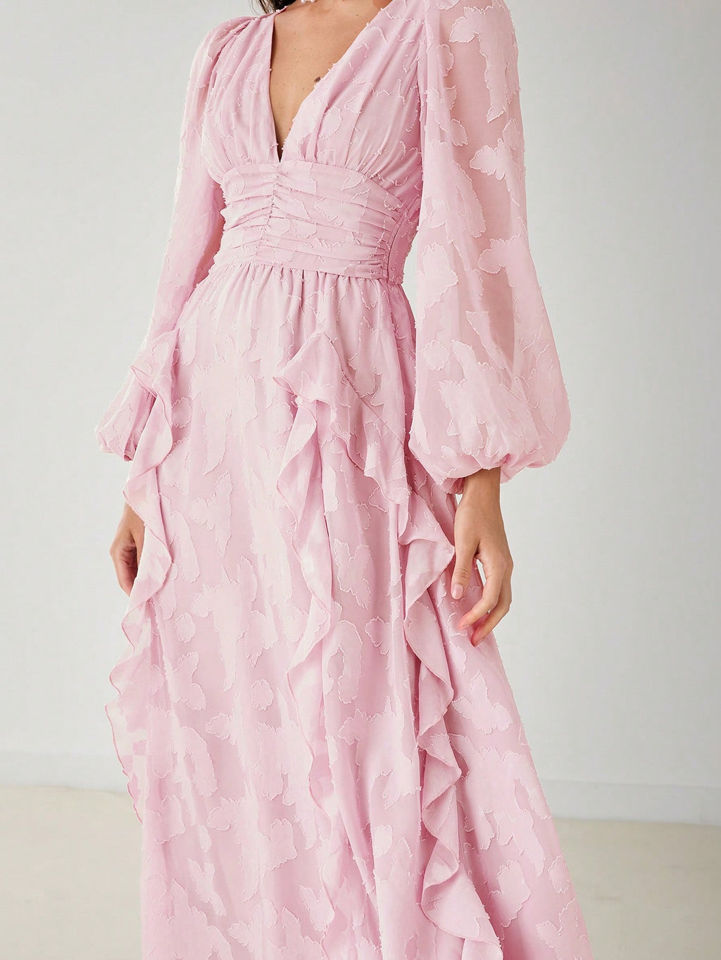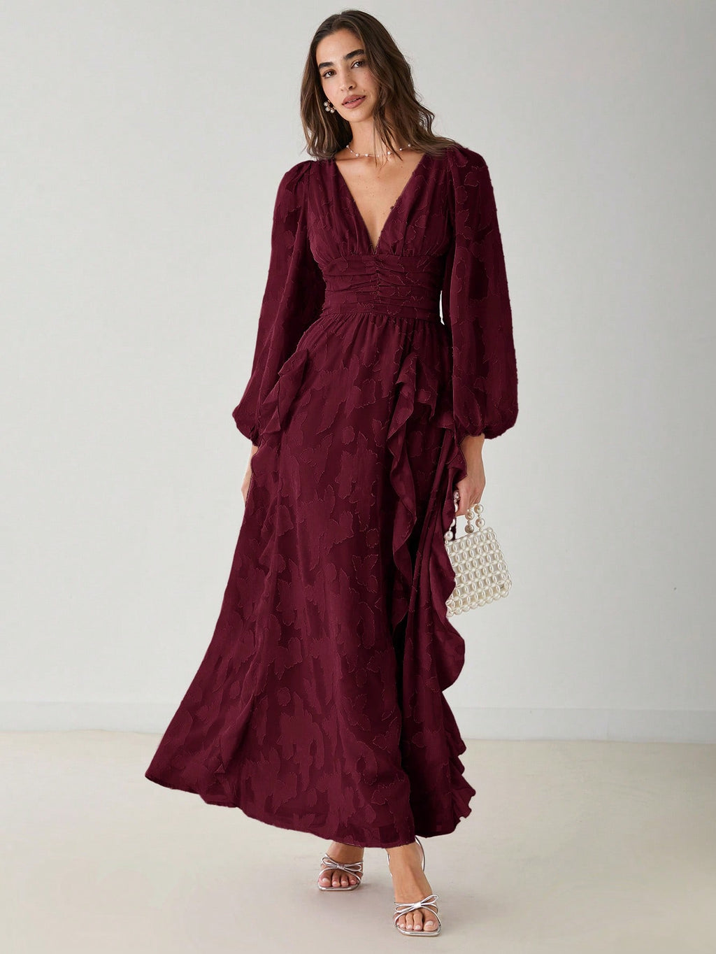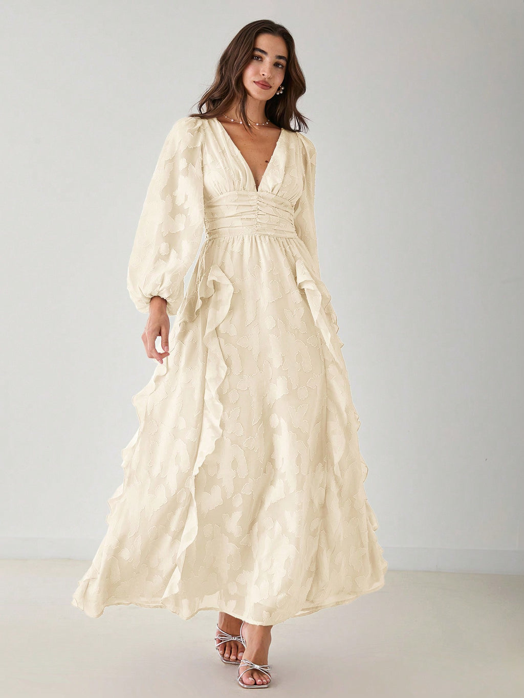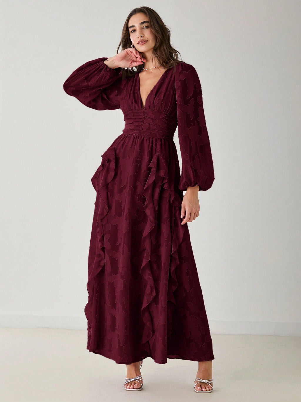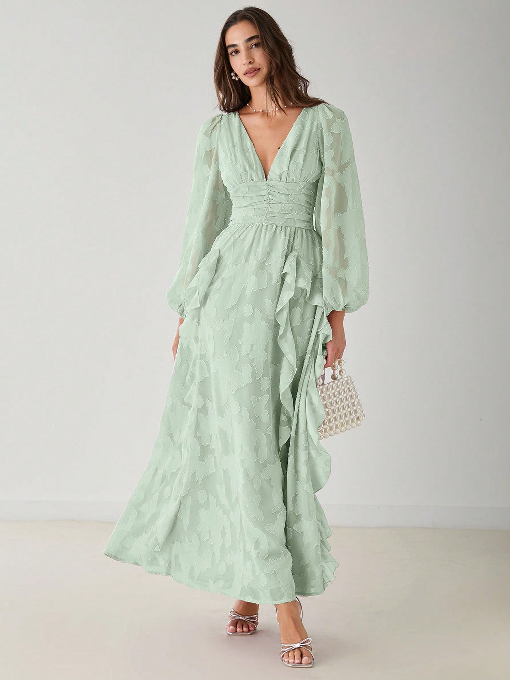 MiuVogue Women's Solid Color V-Neck Lantern Sleeve Flounce Hem Maxi Elegant Dress