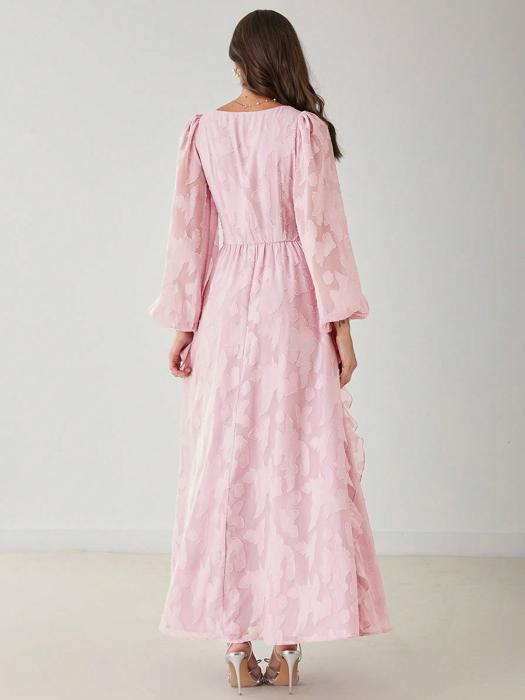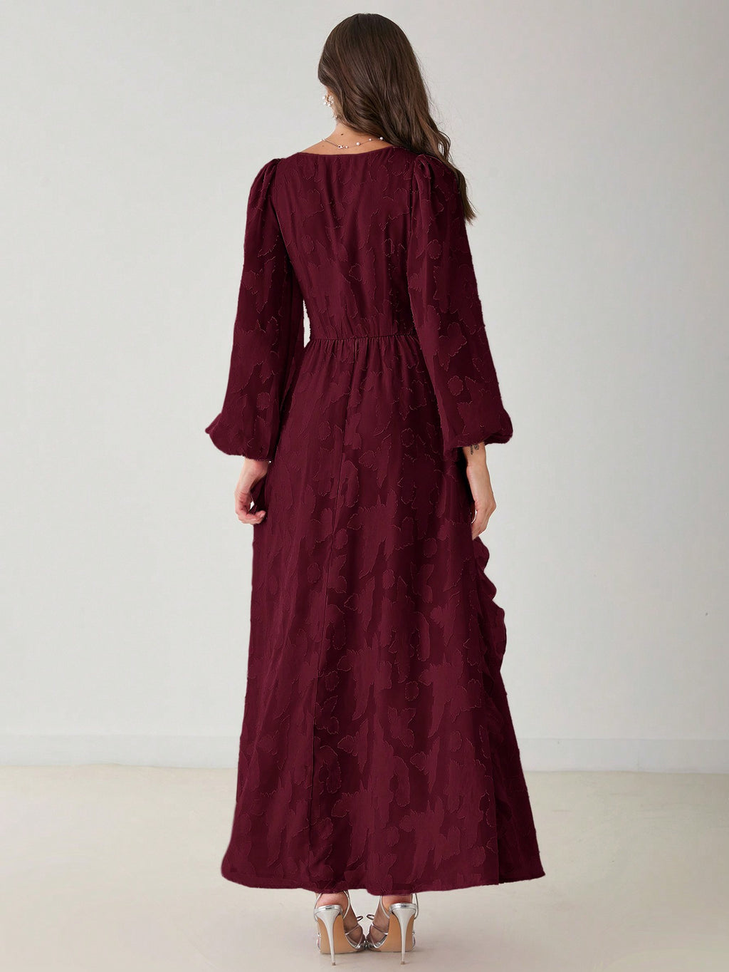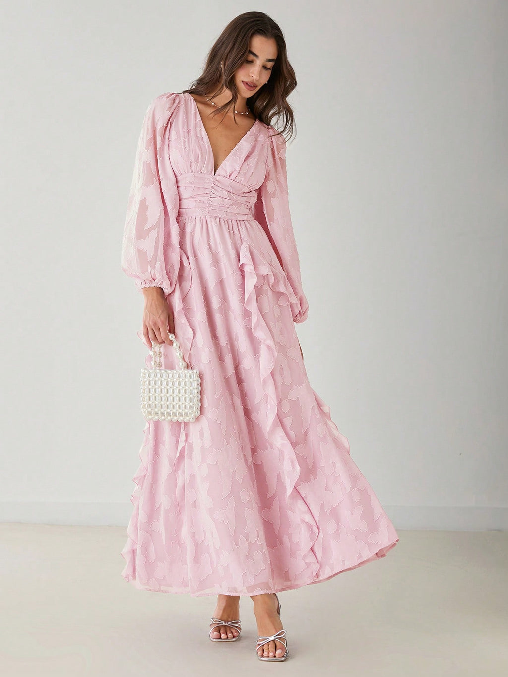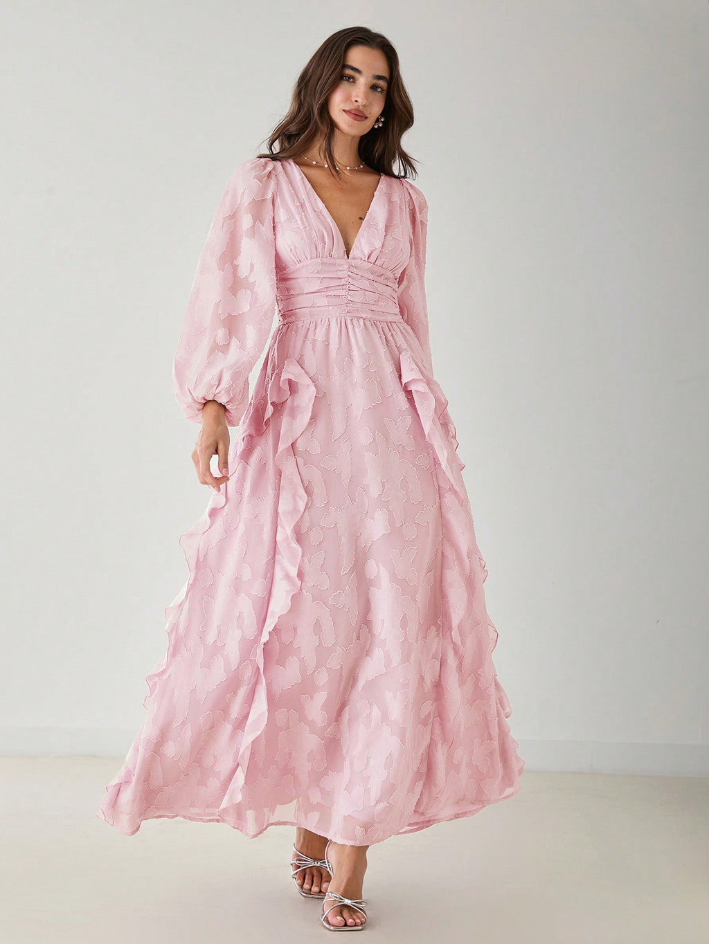 MiuVogue Women's Solid Color V-Neck Lantern Sleeve Flounce Hem Maxi Elegant Dress