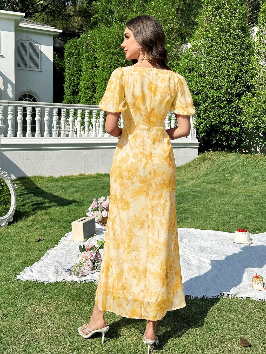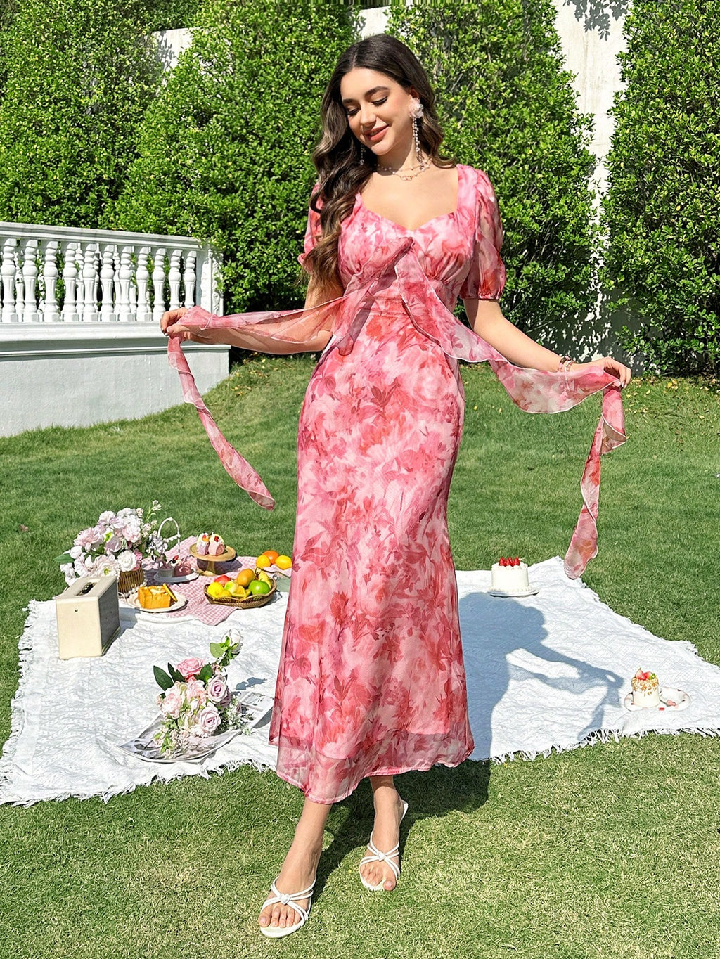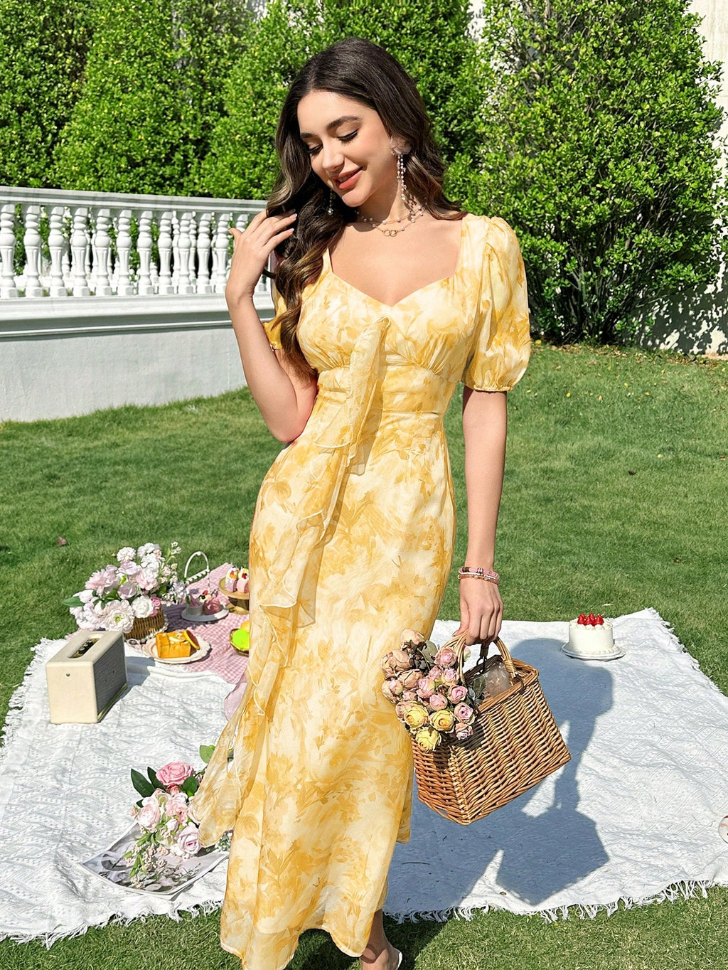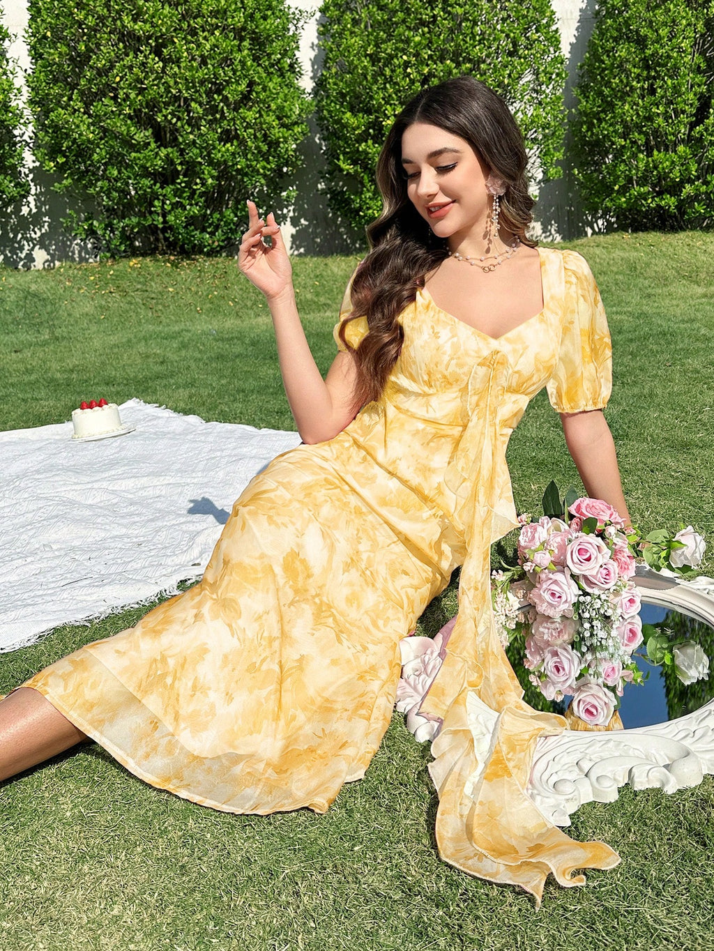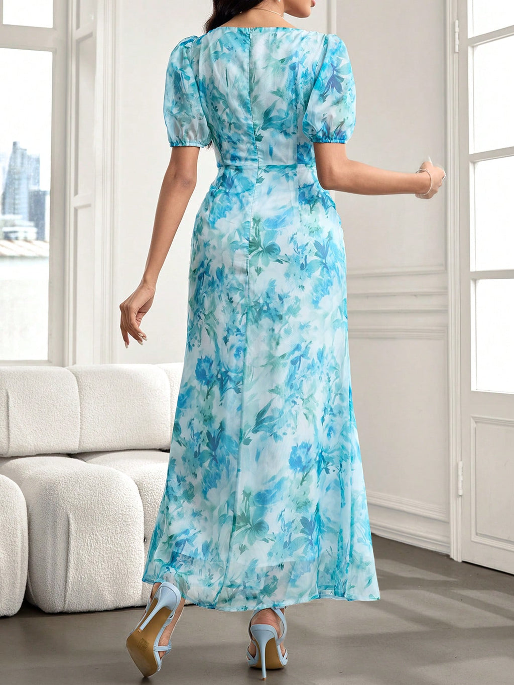 Modelyn cvjetna haljina za žene – srcoliki izrez i puf rukavi