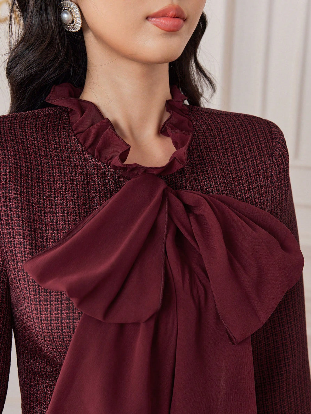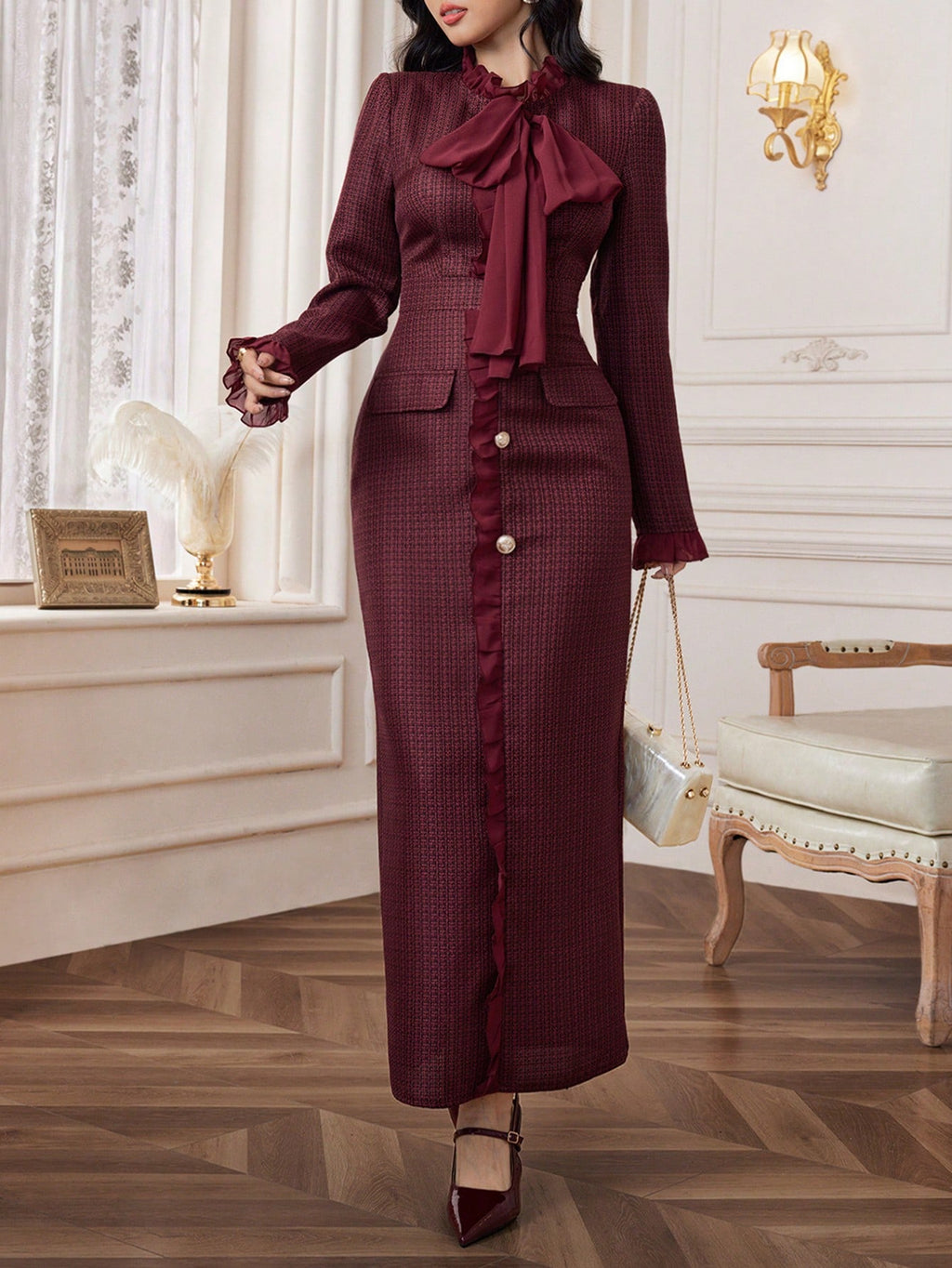 Modelyn Žensko Elegantna Duga Rukava Jednostruko Zakopčana Čipkana Ogrlica Duga Haljina, Jesen Burgundska Maxi Ženska Odjeća Duga Večernja Haljina Jesen