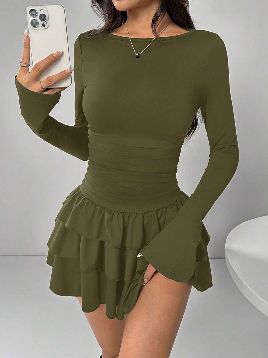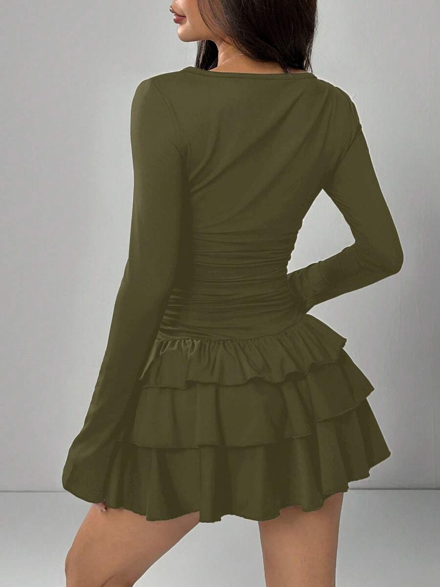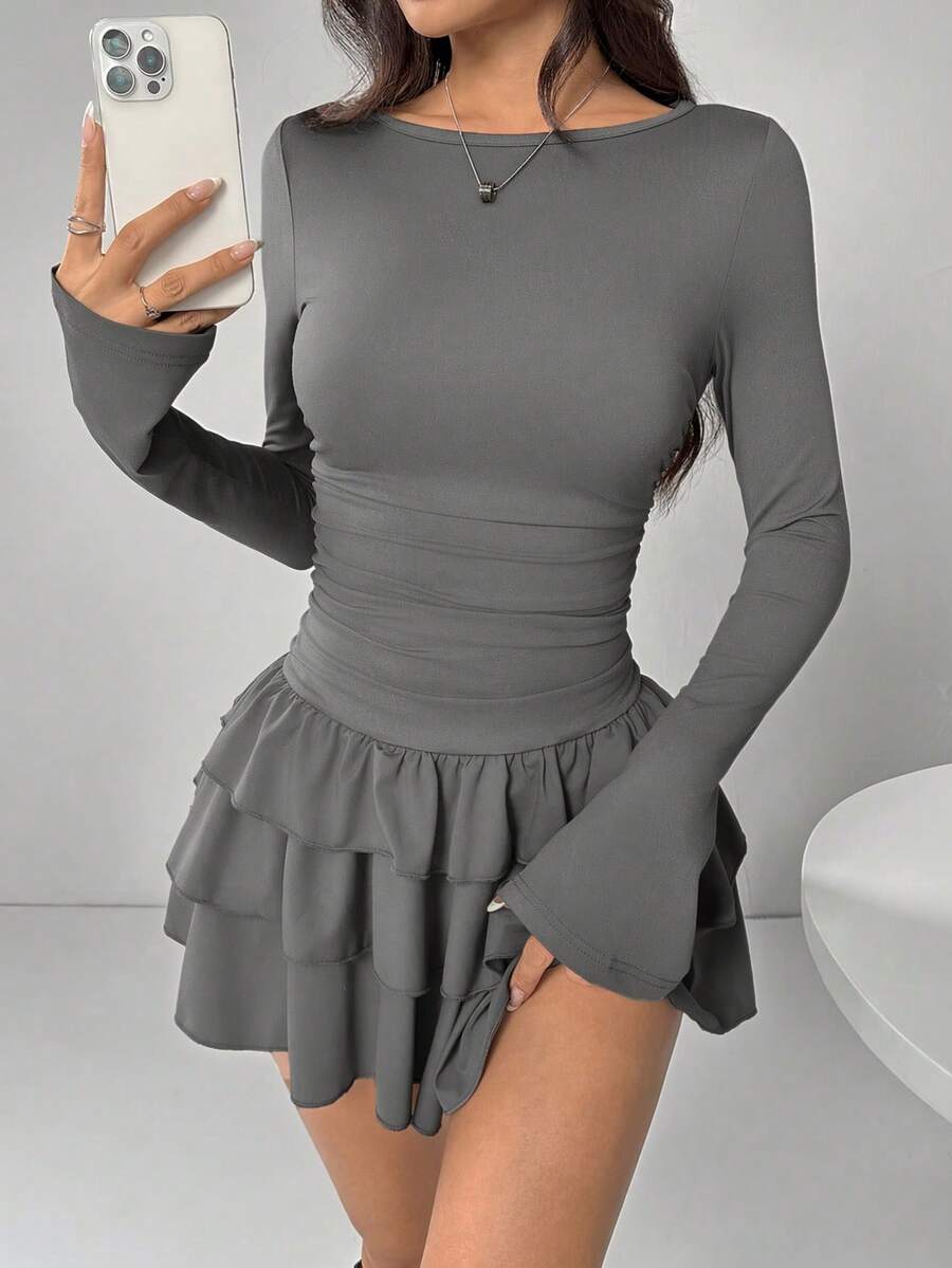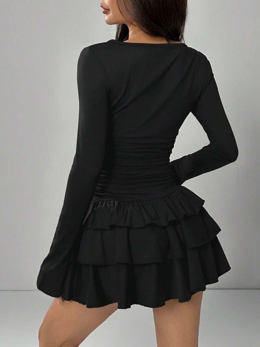 NOVO EZwear Ženska Elegantna Haljina s Ruffles Detaljima - Crna, Dugački Rukavi, Ljetne Haljine za Žene