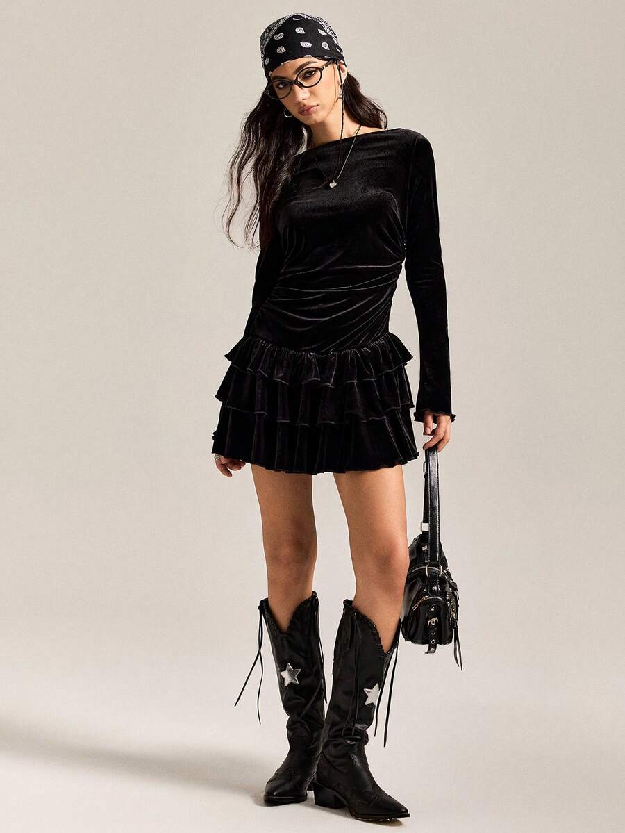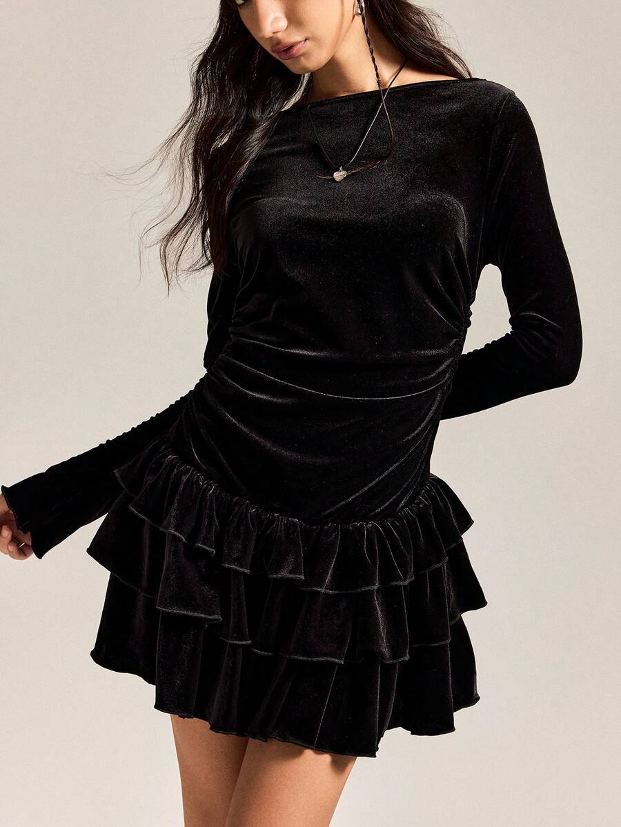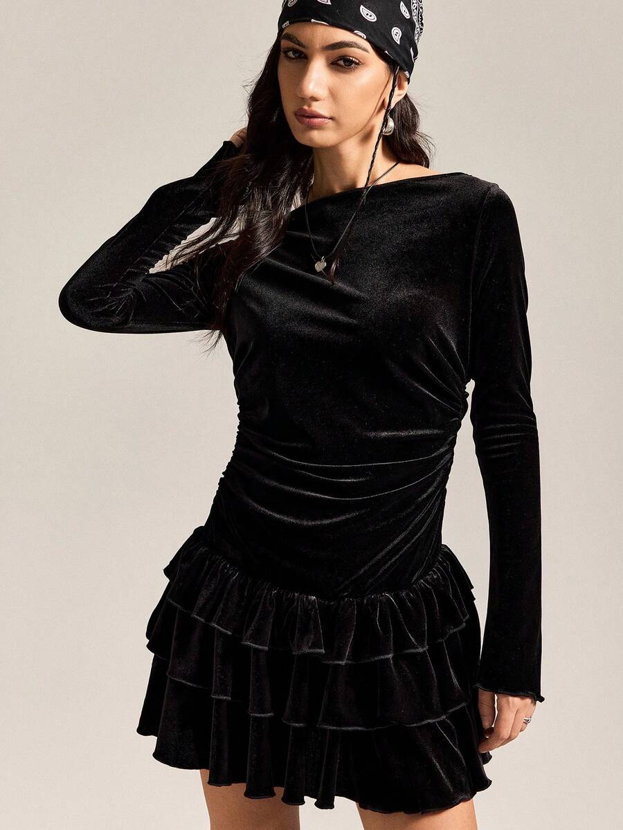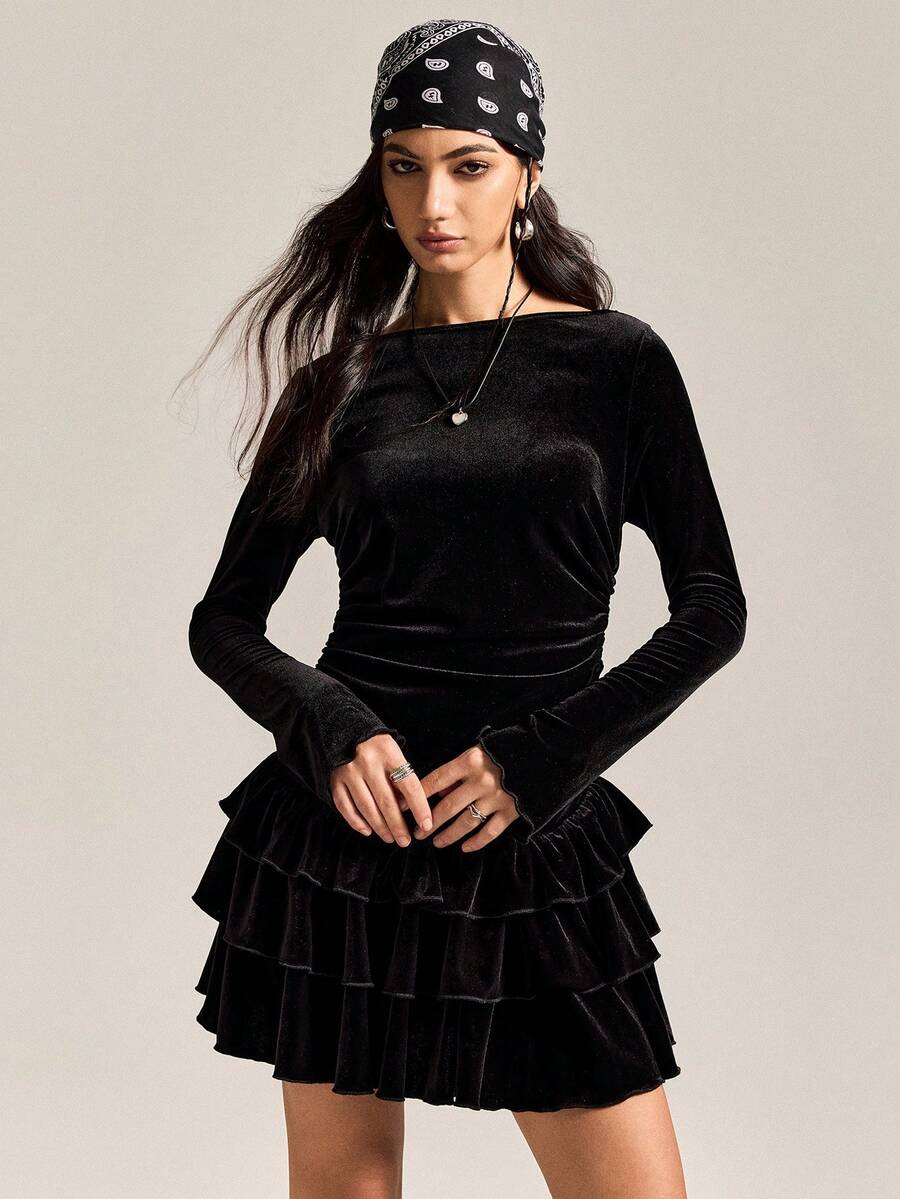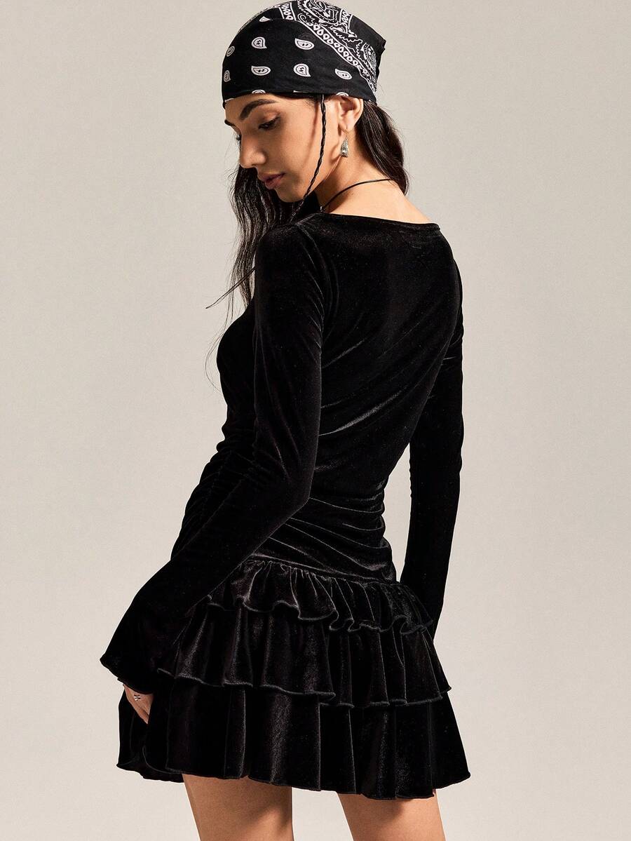 NOVO EZwear Ženska Elegantna Haljina s Ruffles Detaljima - Crna, Dugački Rukavi, Ljetne Haljine za Žene