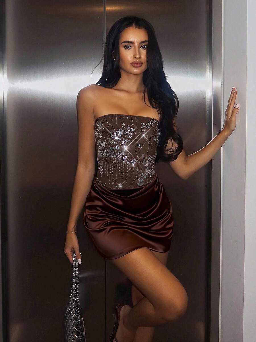 NOVO Glamour smeđa boja off the shoulder bez rukava naborana mini haljina