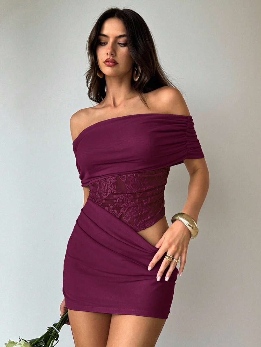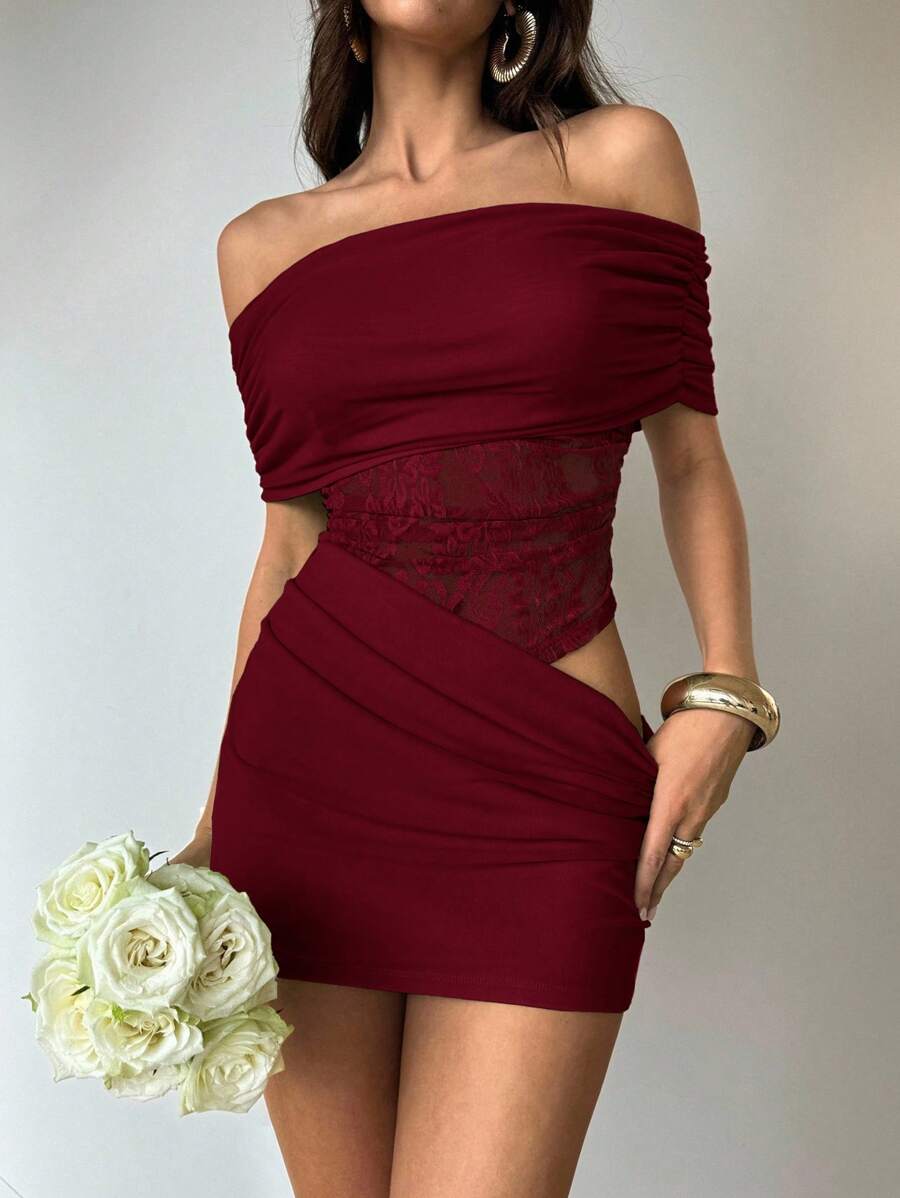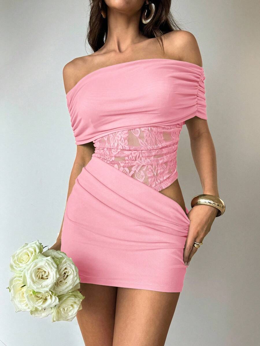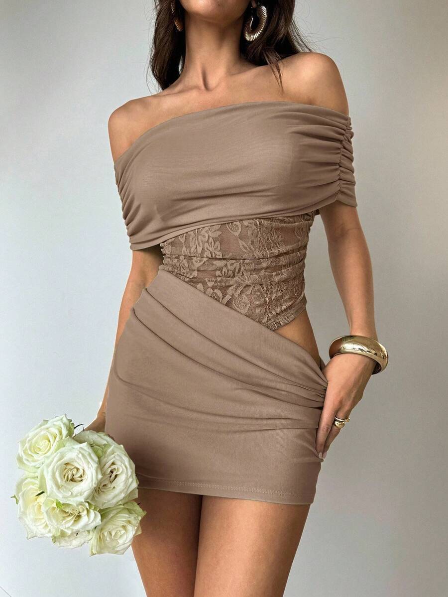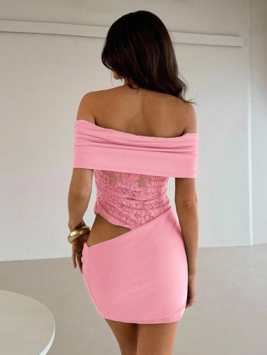 NOVO Ženski Seksi Elegantan Off-Shoulder Struk Cutout Prozirni Čipkasti Kontrastni Mrežasti Mini Haljina